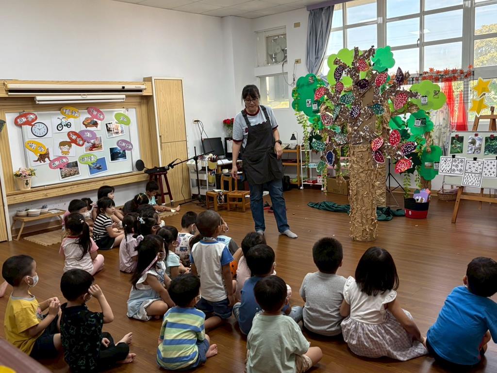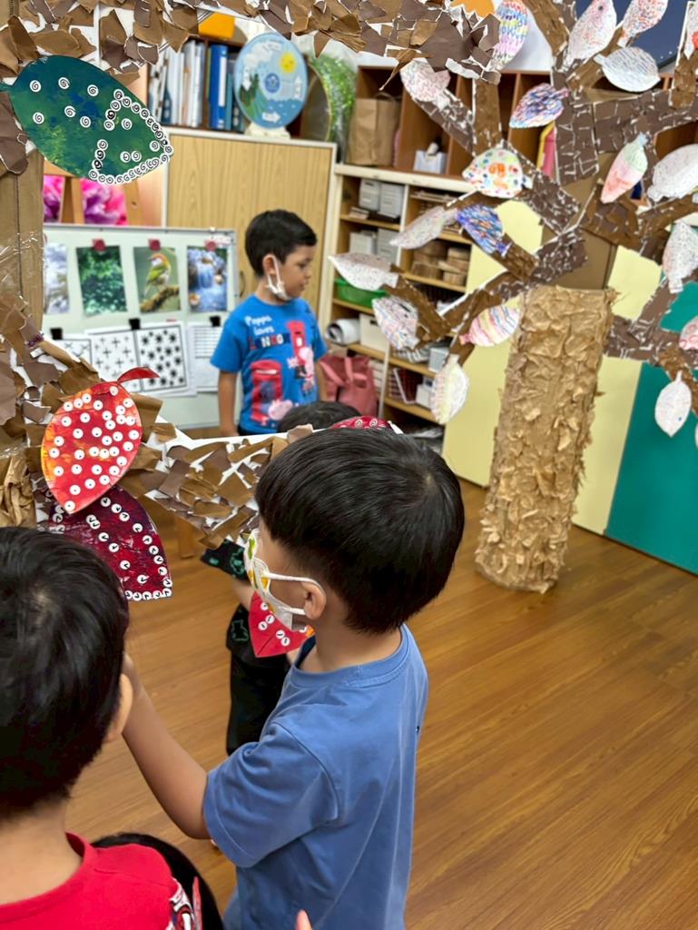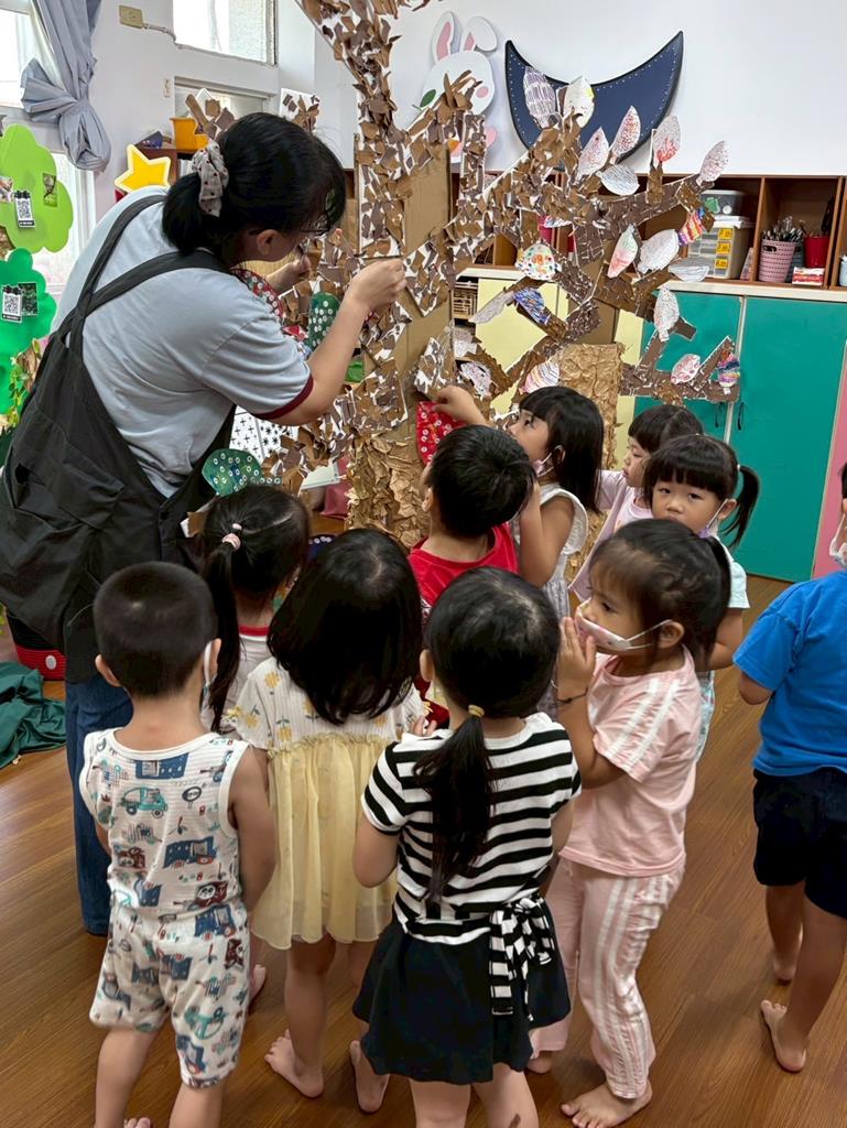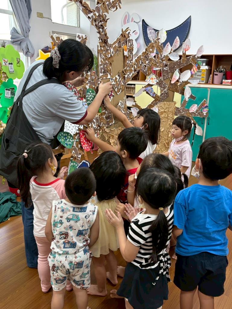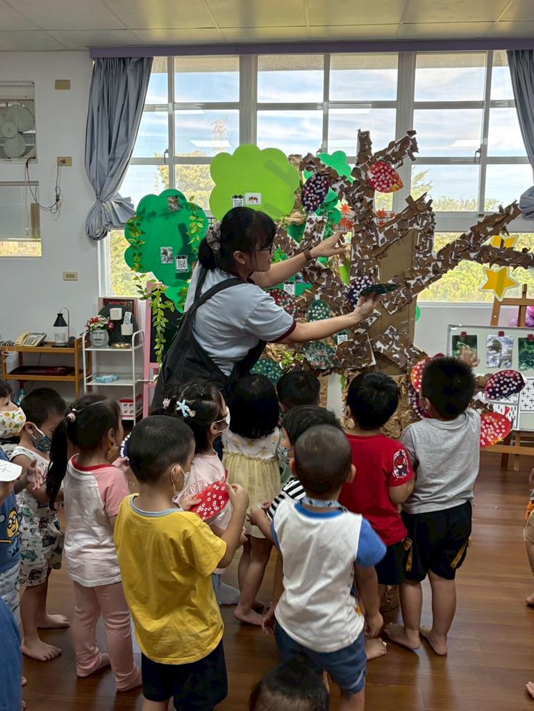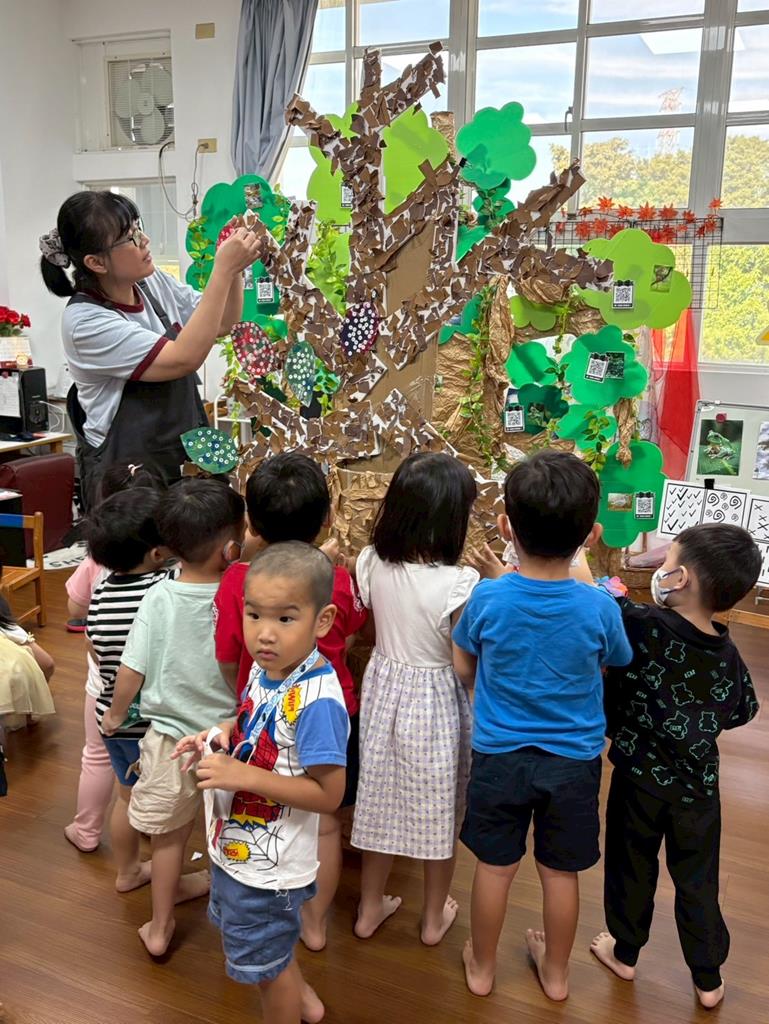 孩子們透過模仿大自然聲音老師錄音和葉子結合,貼在班級聲音大樹上-取名為企鵝大樹