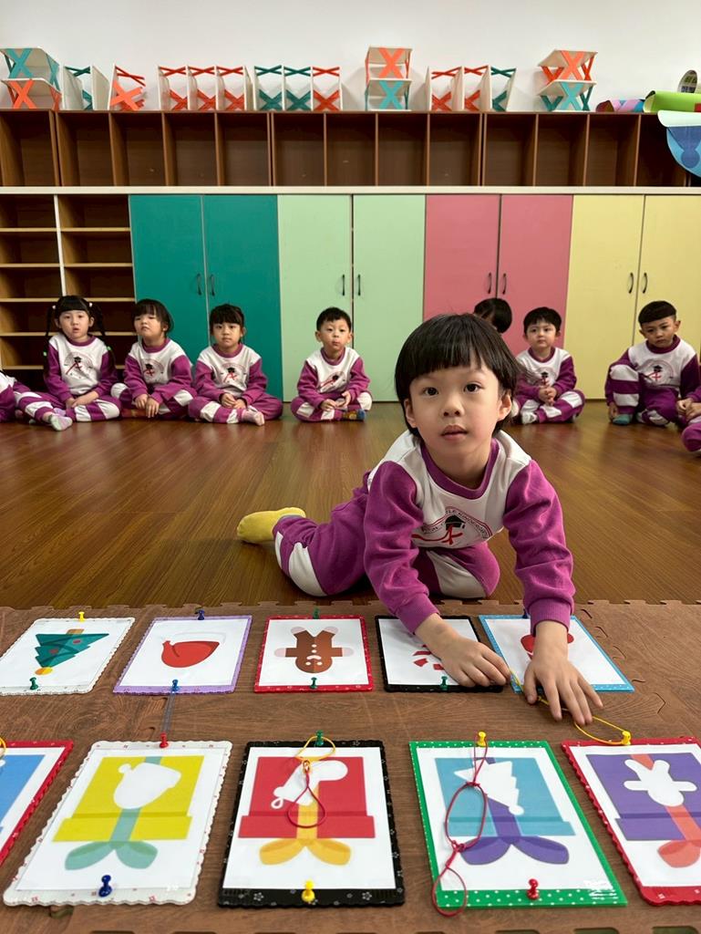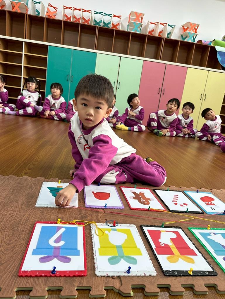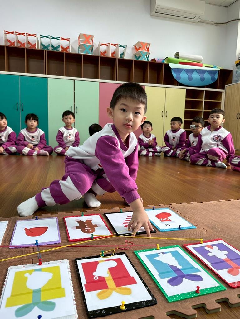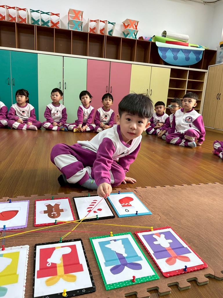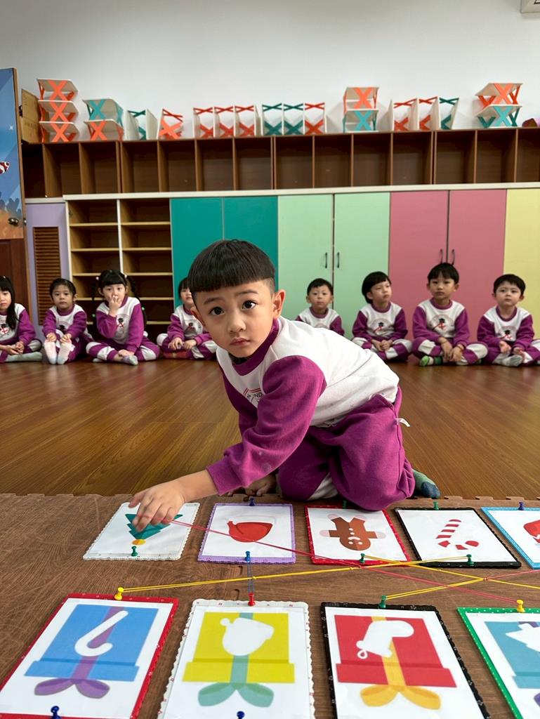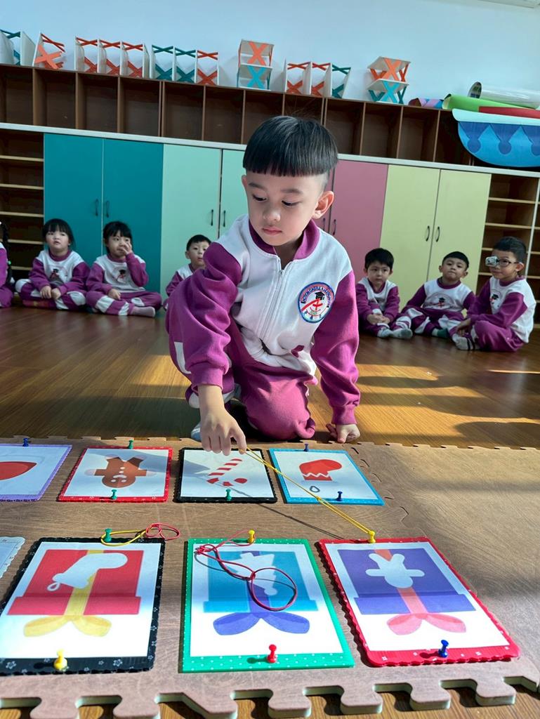 老師帶著孩子觀察上方的禮物盒圖案,孩子依序進行配對,將下方圖案與正確的禮物盒連線 。