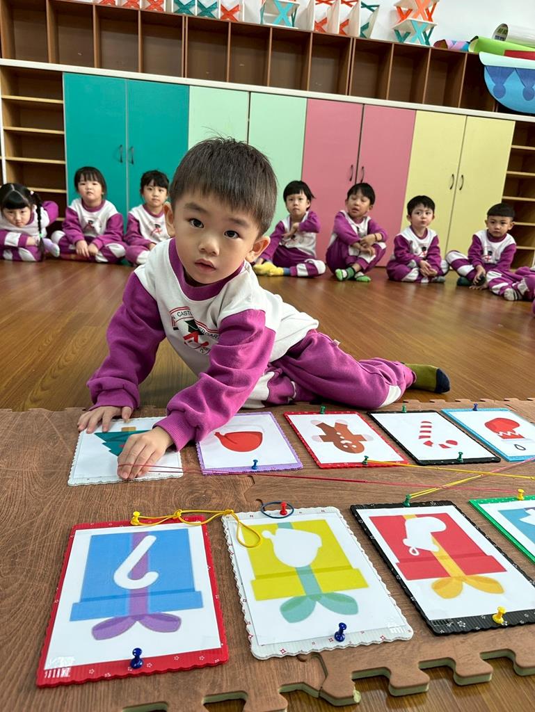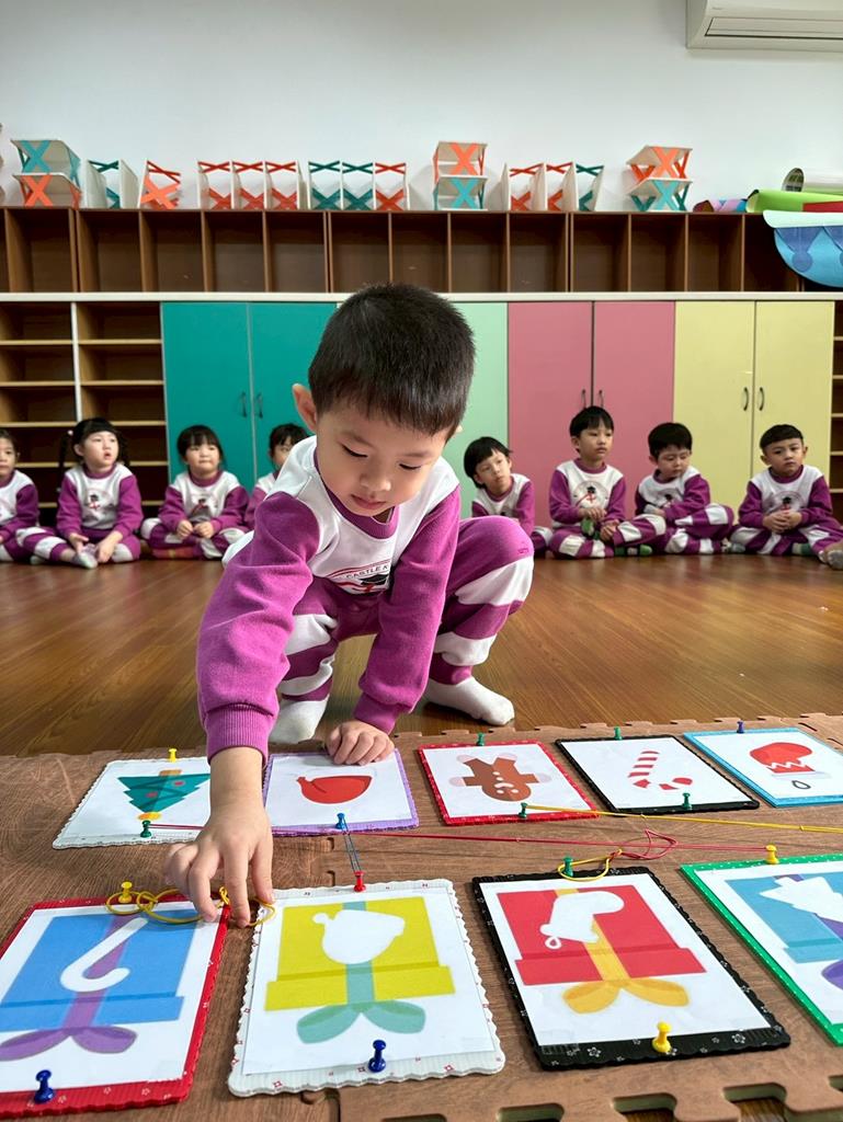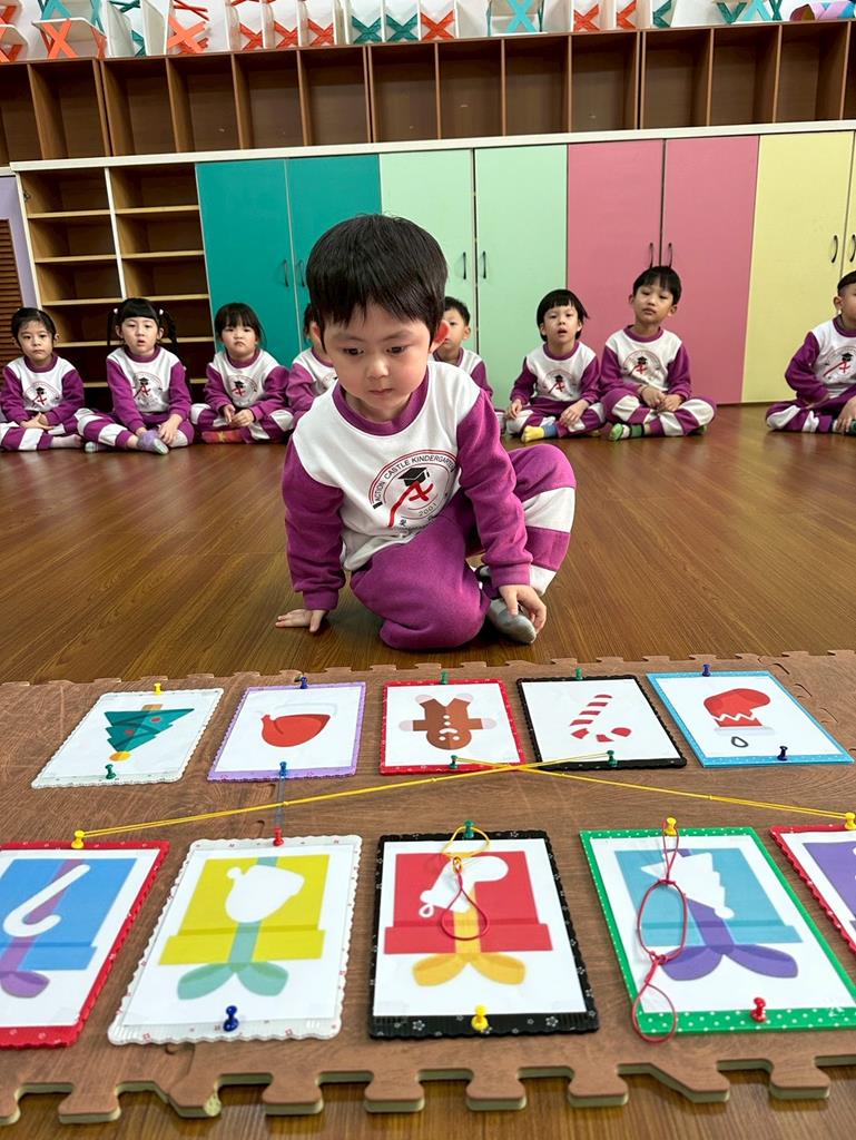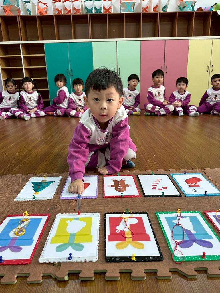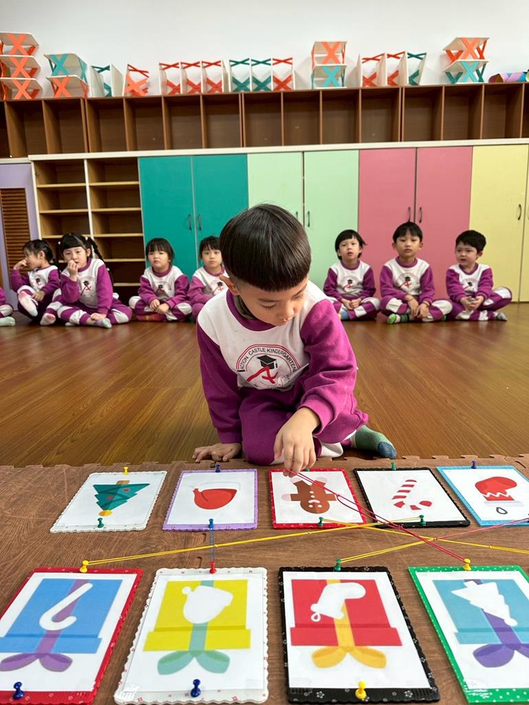 老師帶著孩子觀察上方的禮物盒圖案,孩子依序進行配對,將下方圖案與正確的禮物盒連線 。