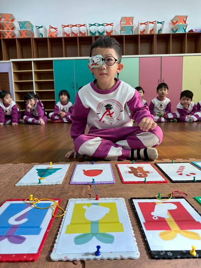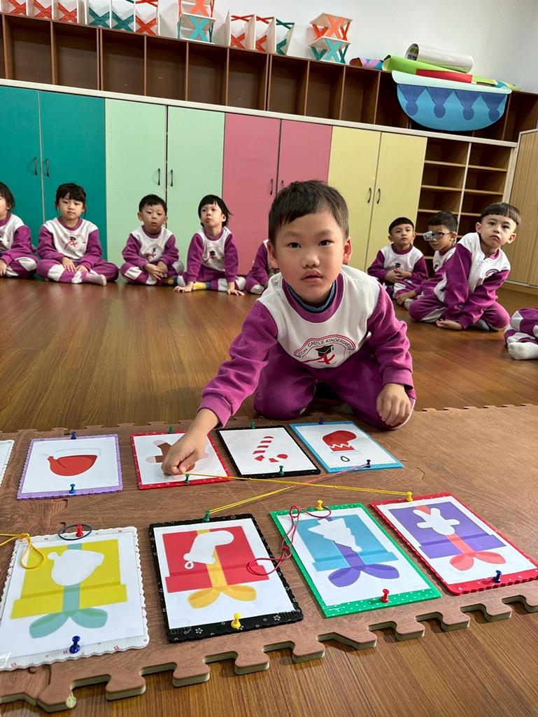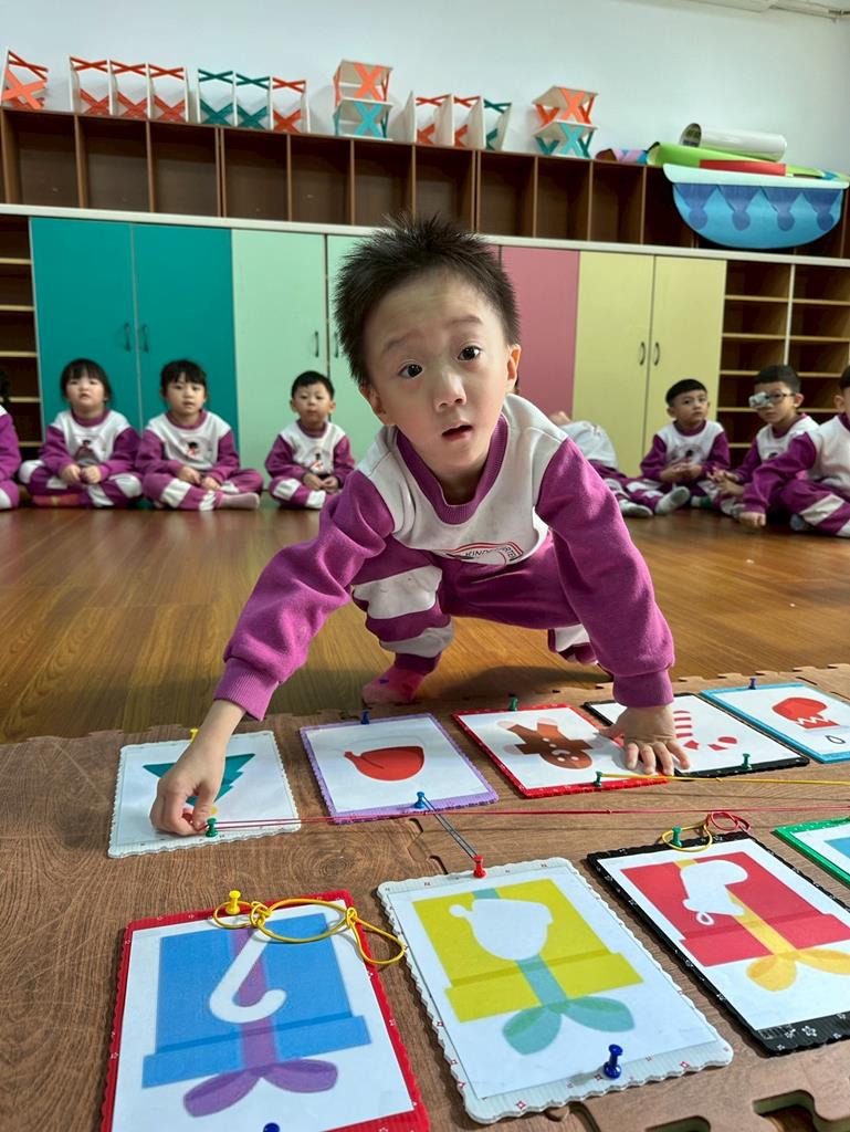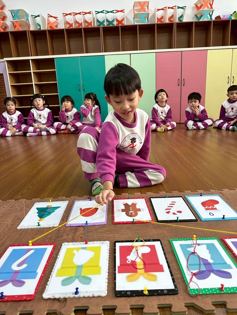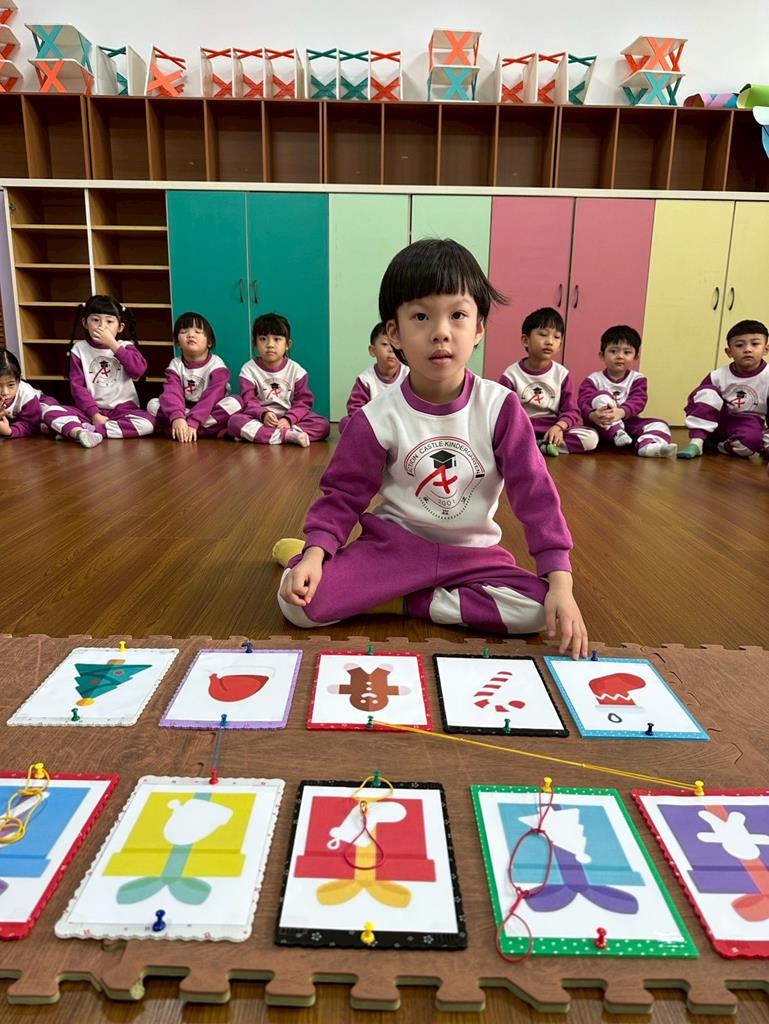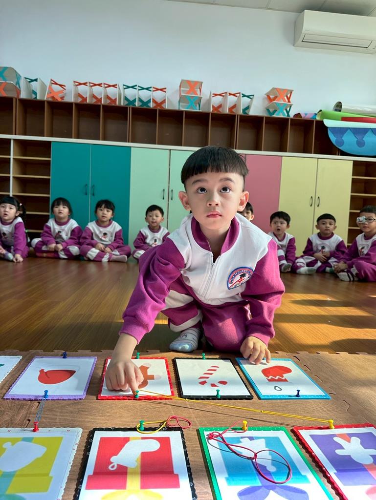 老師帶著孩子觀察上方的禮物盒圖案,孩子依序進行配對,將下方圖案與正確的禮物盒連線 。
