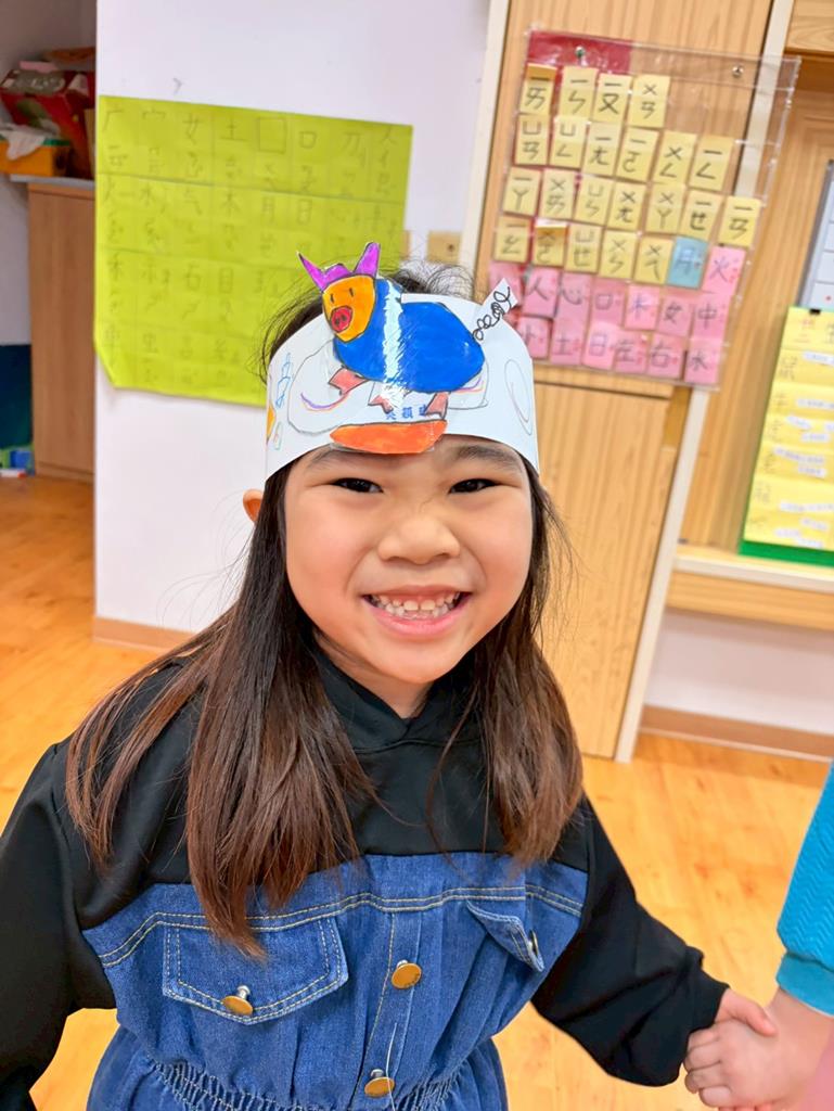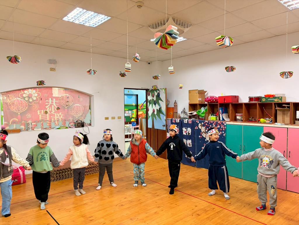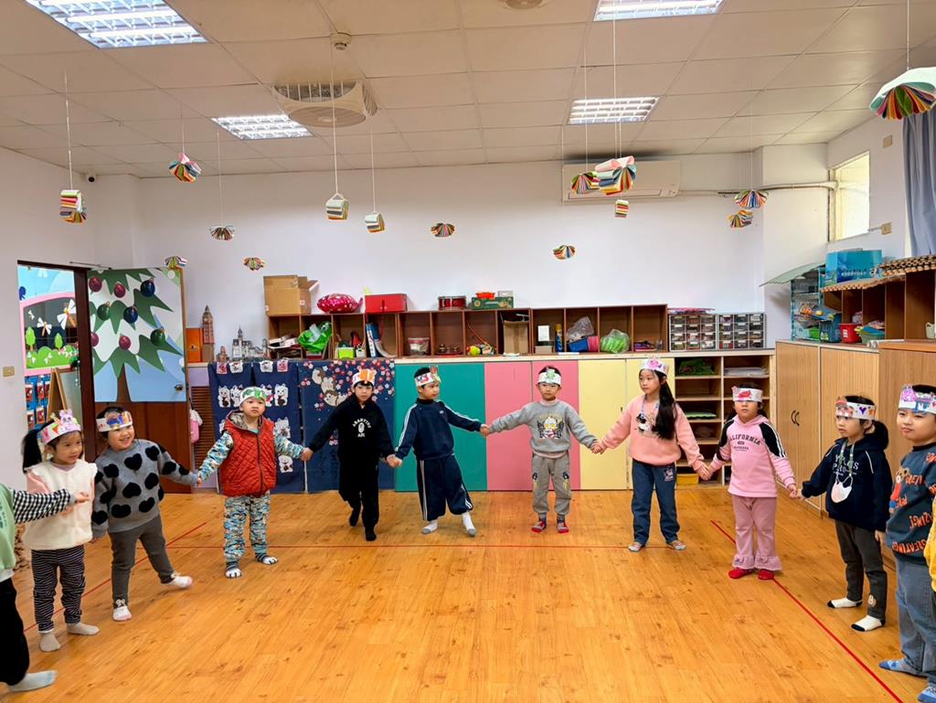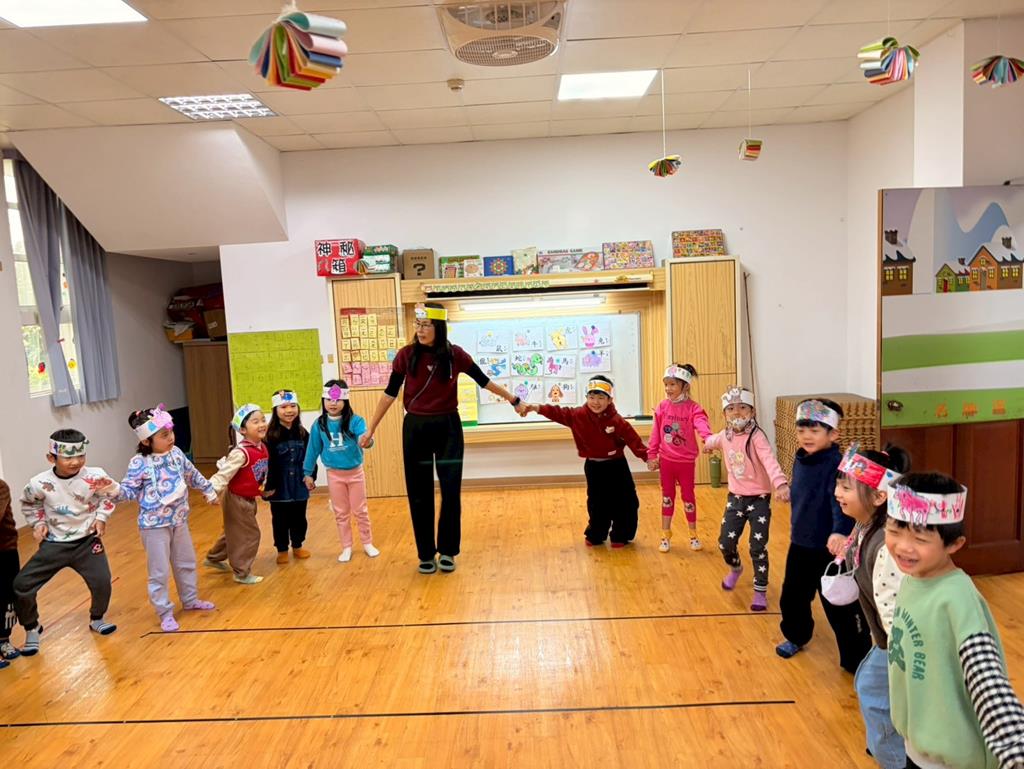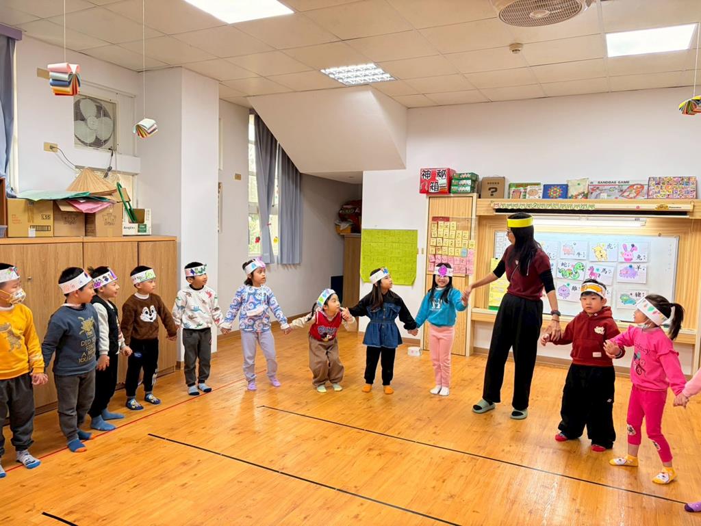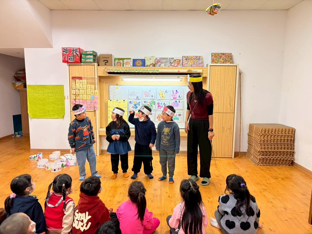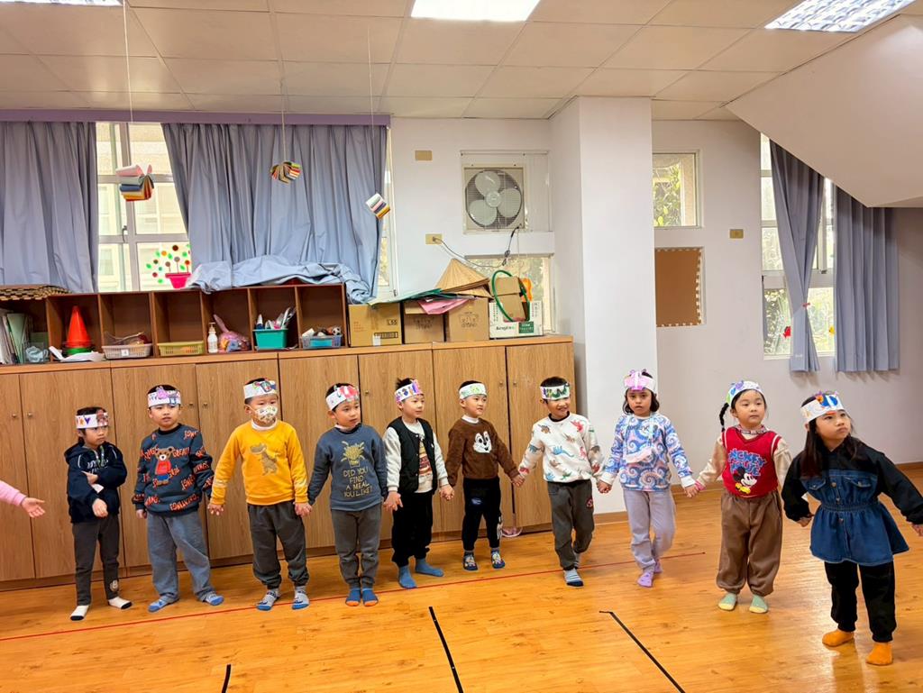 幼兒戴上自製的動物頭套,老師帶領幼兒進行(生肖動物蹲)遊戲