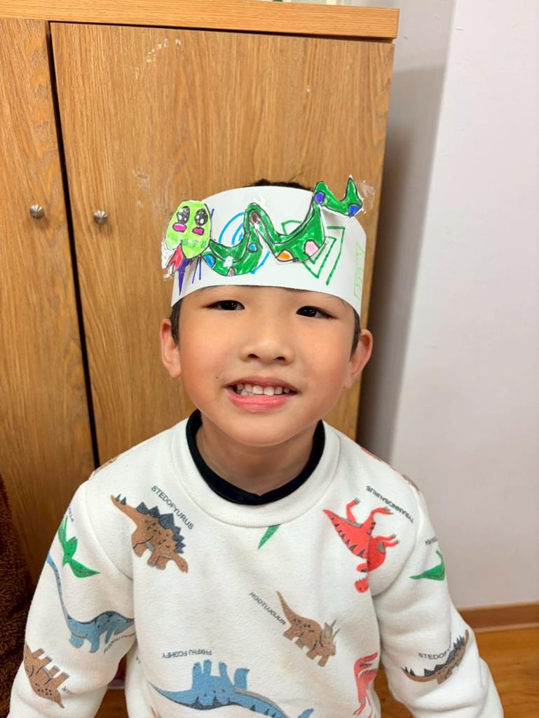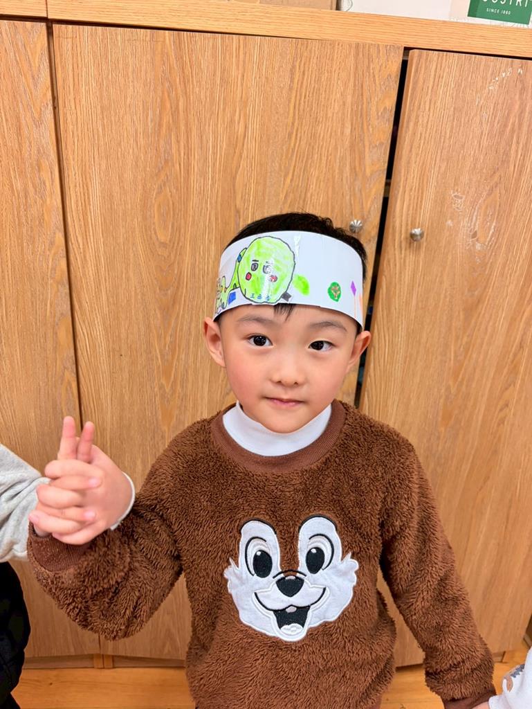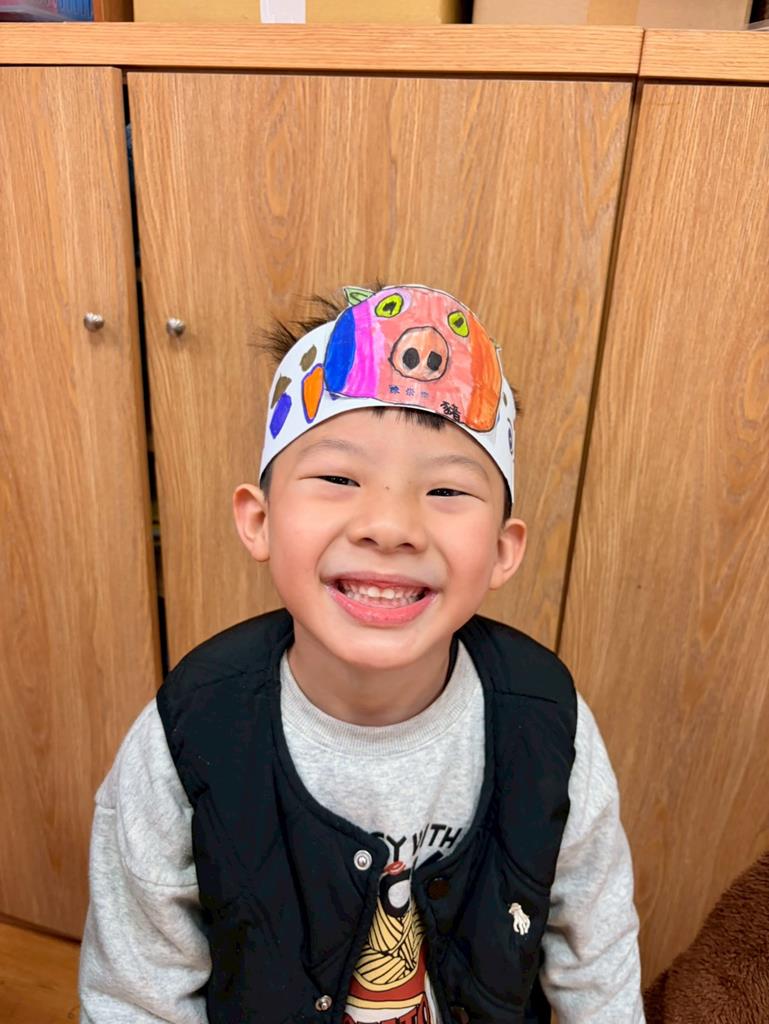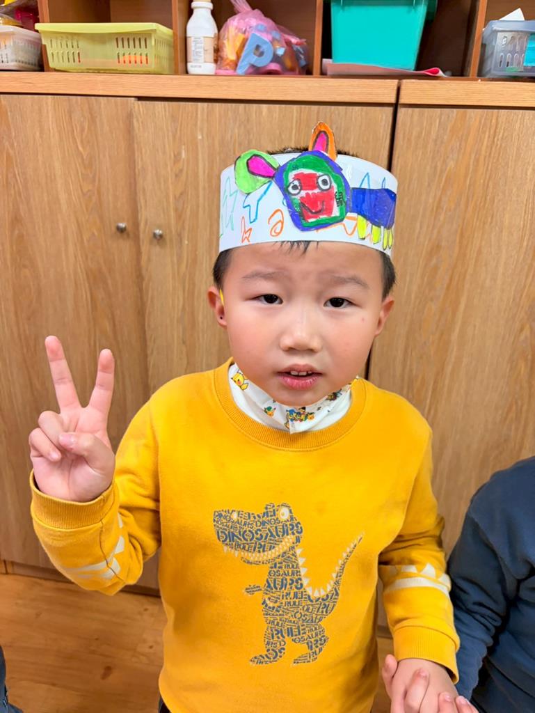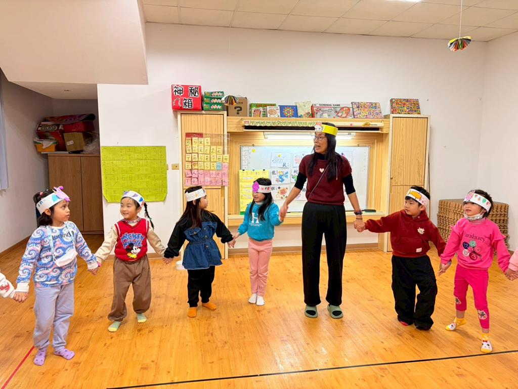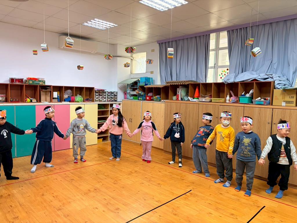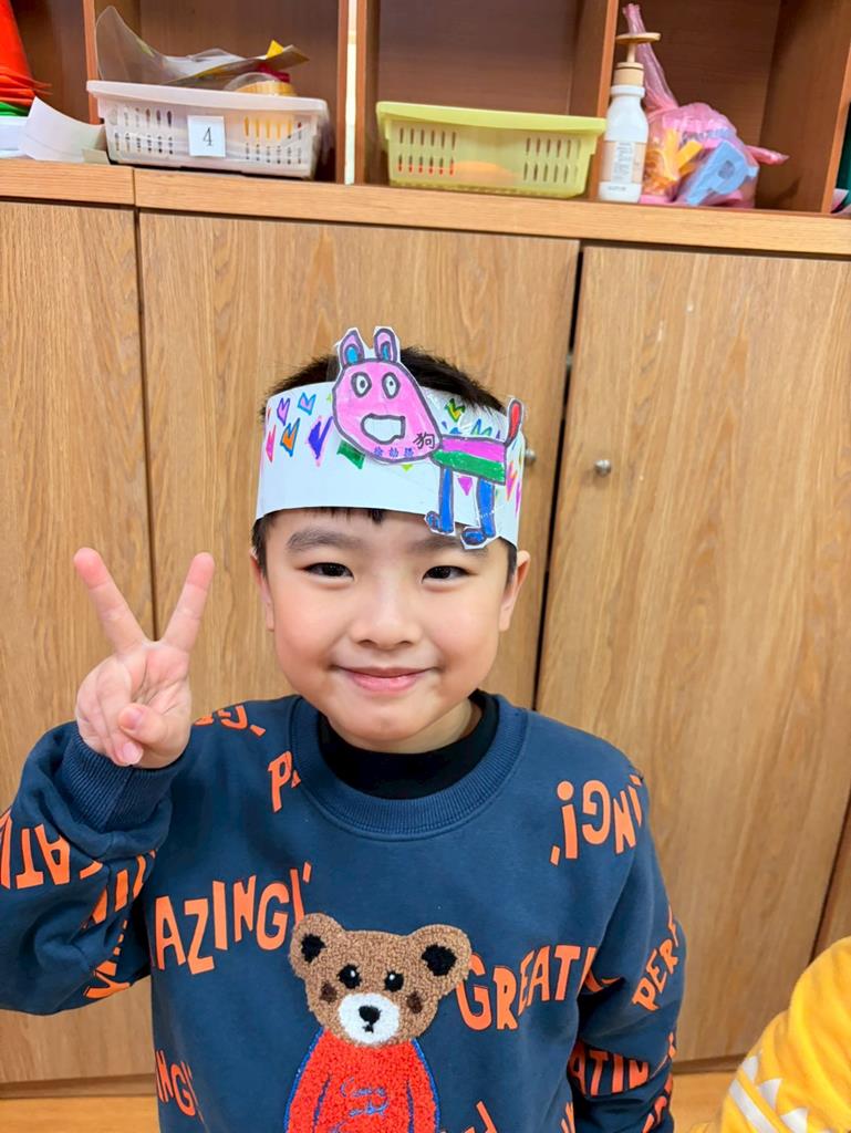 幼兒戴上自製的動物頭套,老師帶領幼兒進行(生肖動物蹲)遊戲
