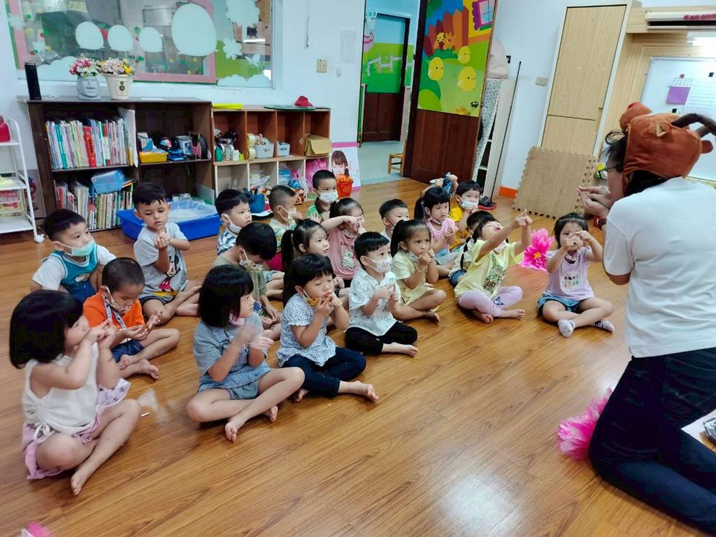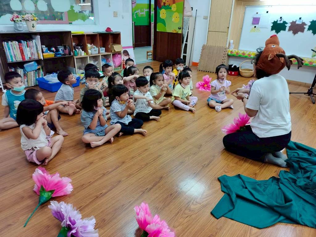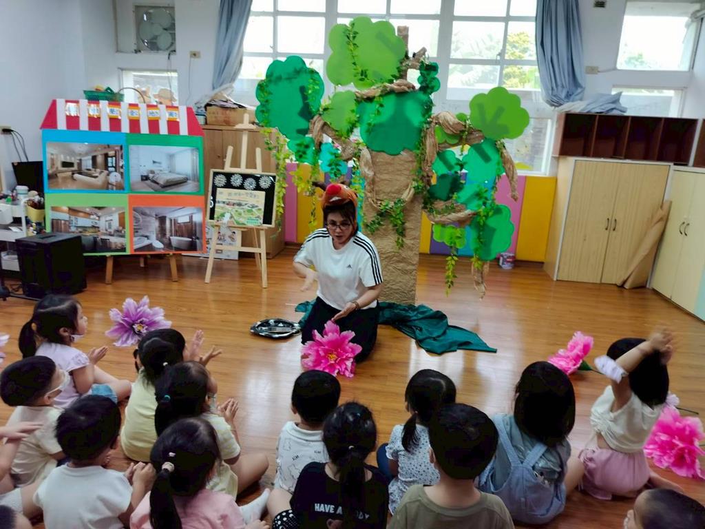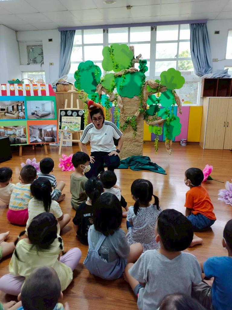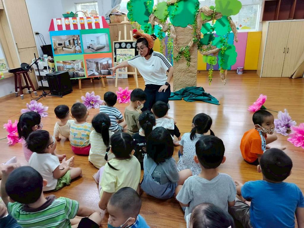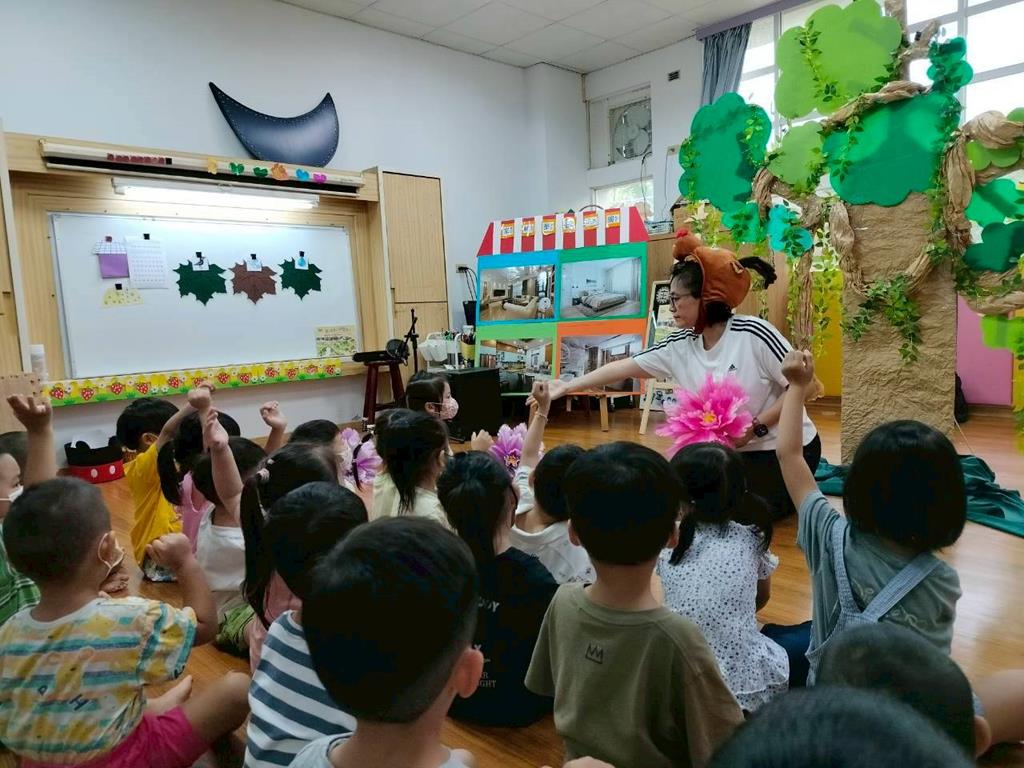 教室布置森林場景,用耳朵聽身體表現各種聲音,如小鳥叫雨聲風聲,培養聆聽和表達
