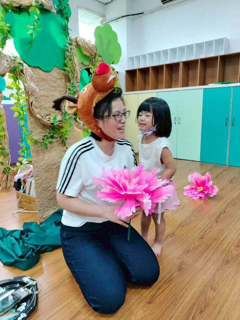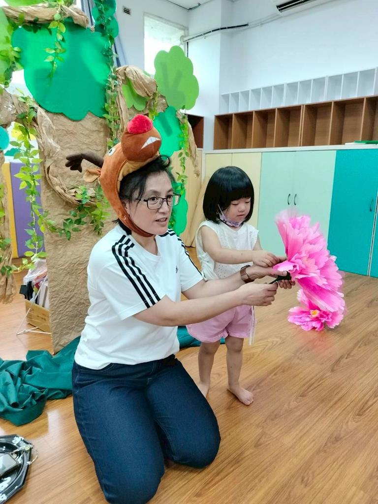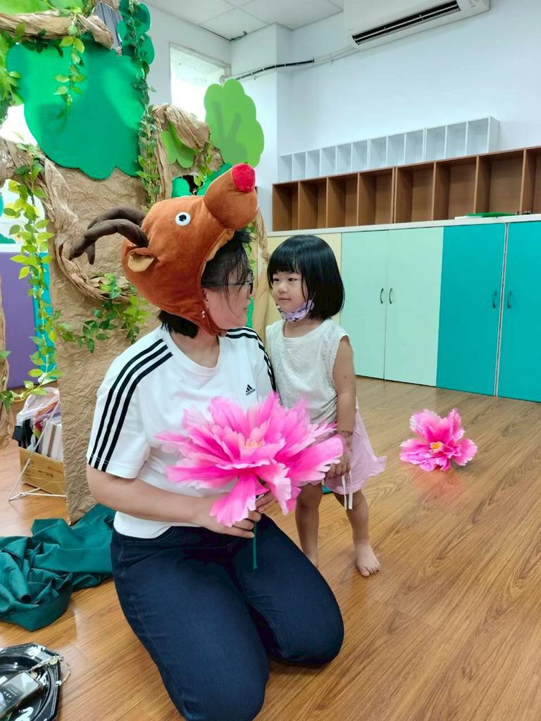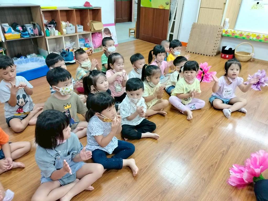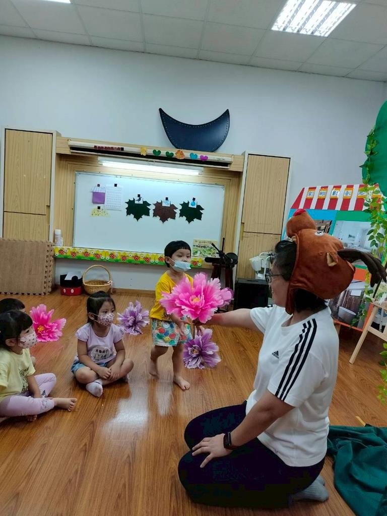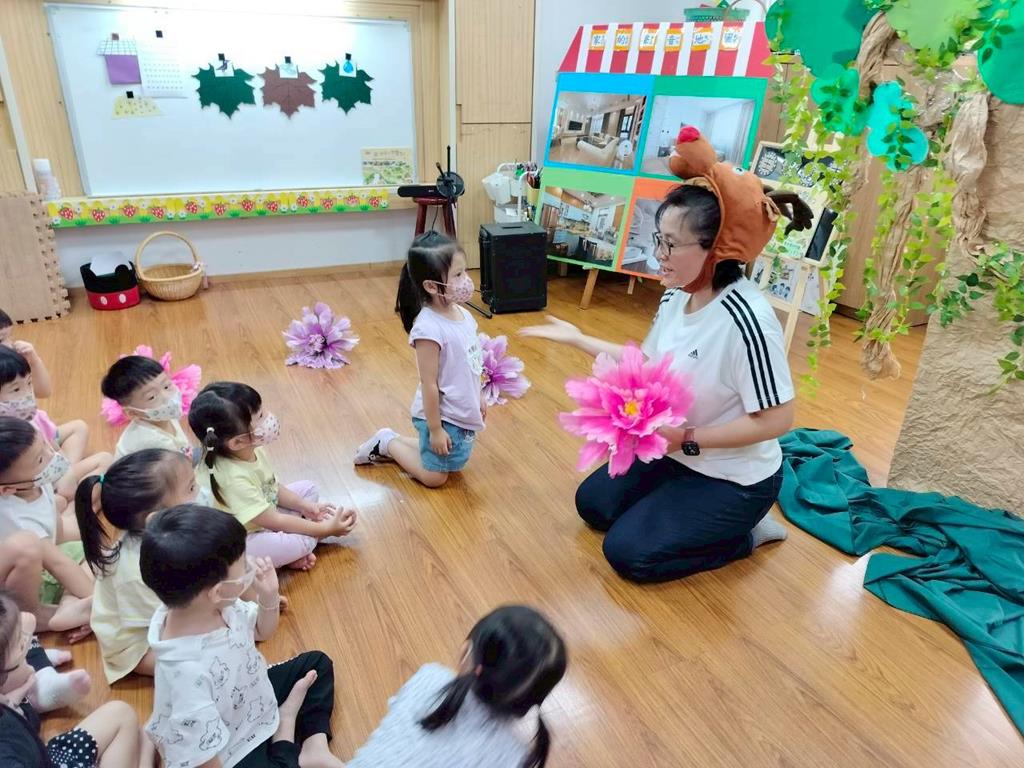 教室布置森林場景,用耳朵聽身體表現各種聲音,如小鳥叫雨聲風聲,培養聆聽和表達