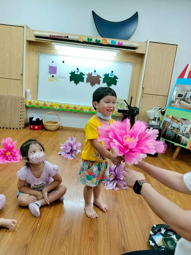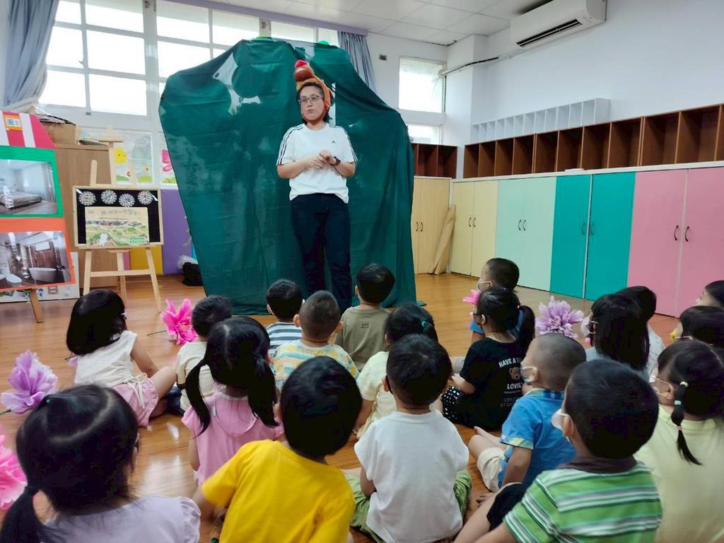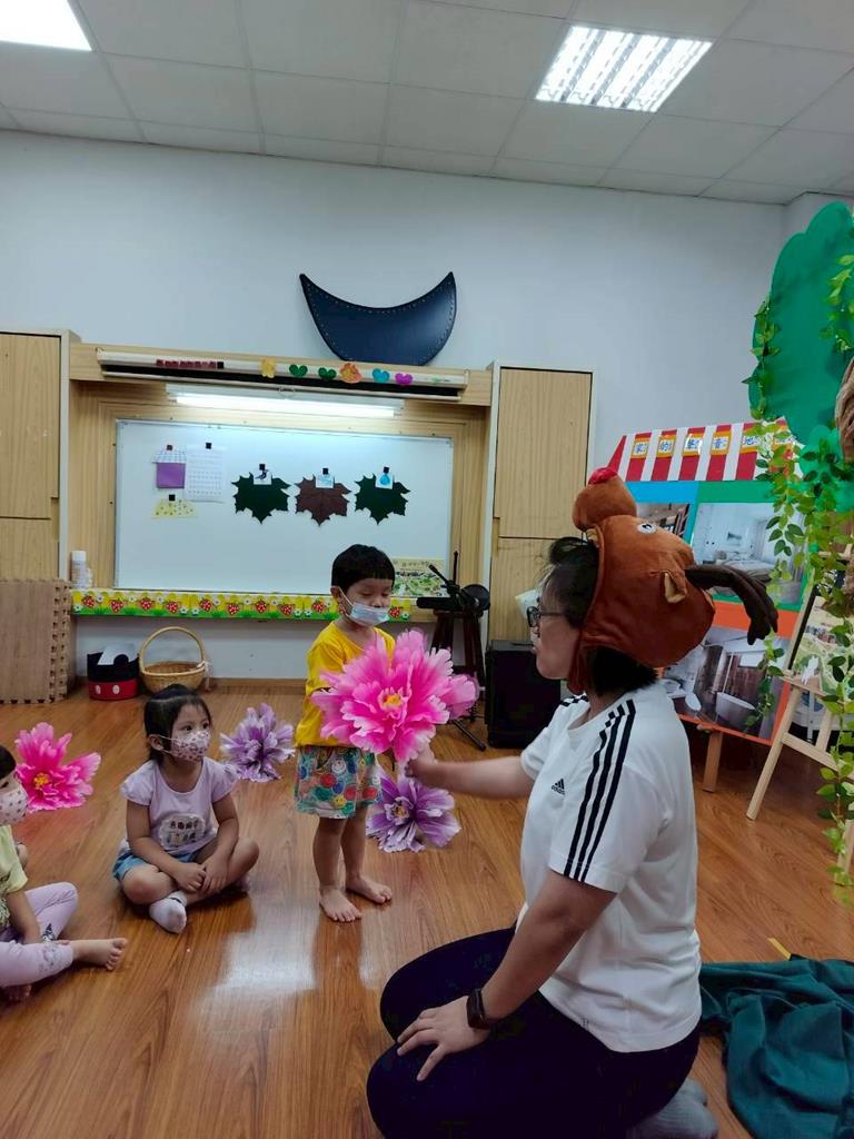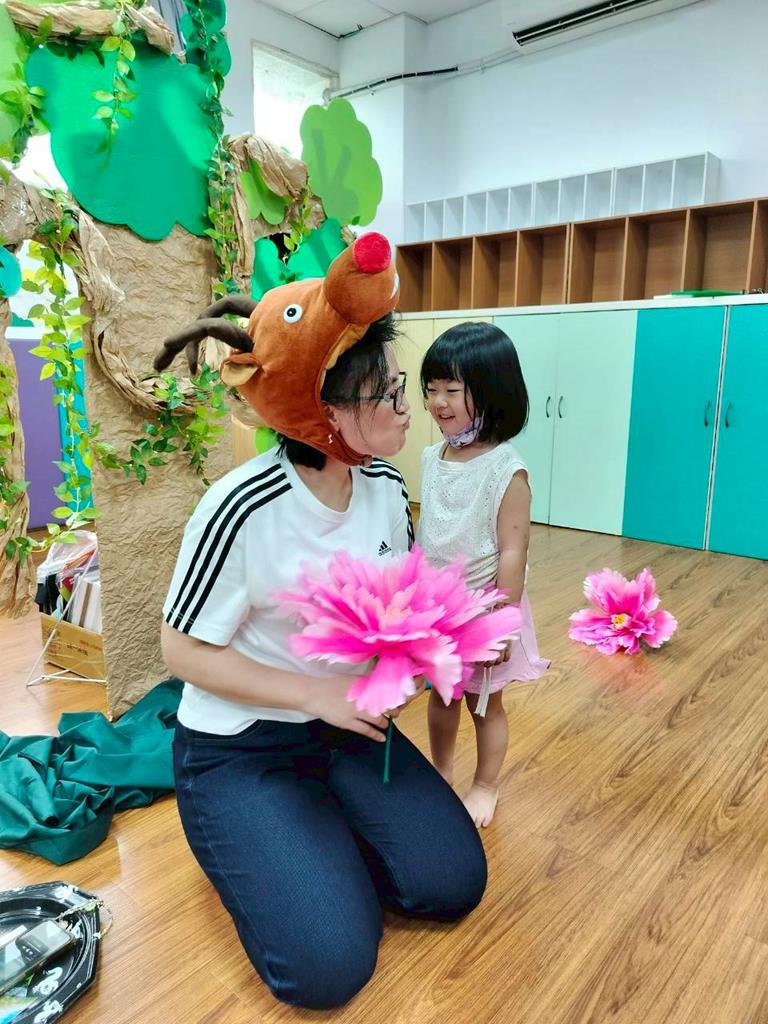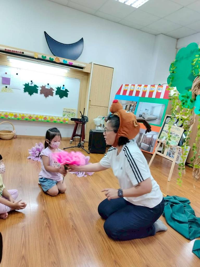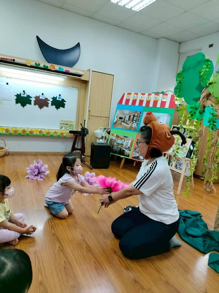 教室布置森林場景,用耳朵聽身體表現各種聲音,如小鳥叫雨聲風聲,培養聆聽和表達