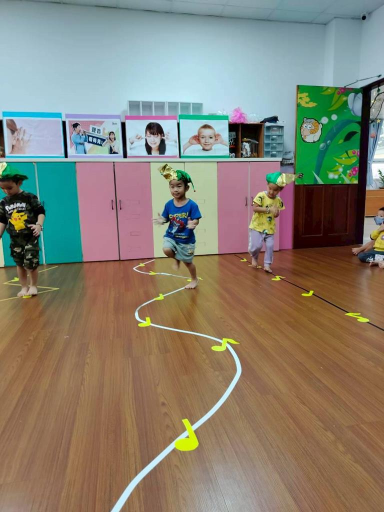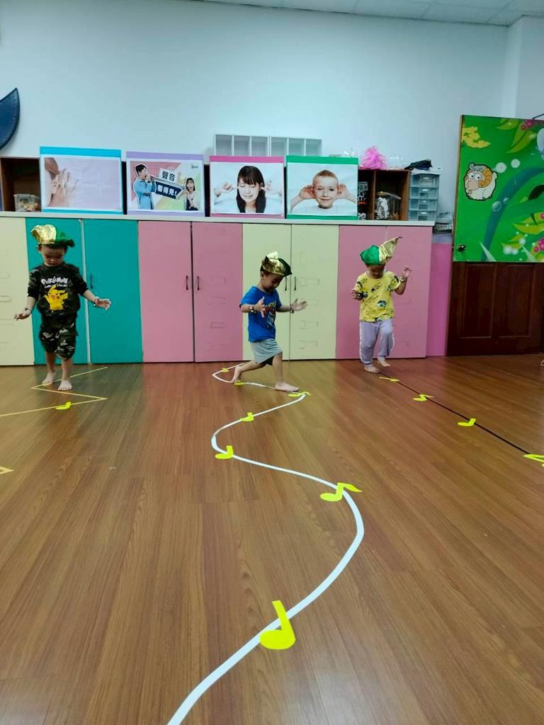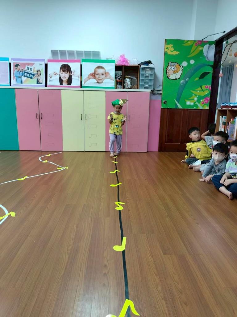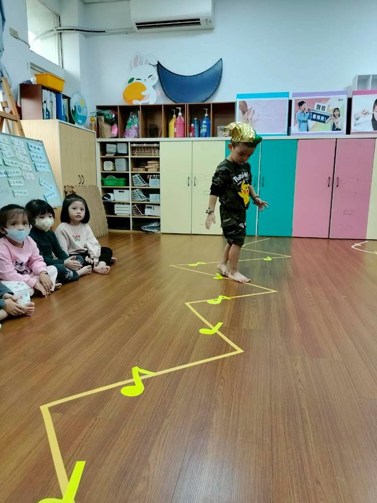 老師在地板貼出三條不同線條,讓孩子跟著節奏拍手走出不伐