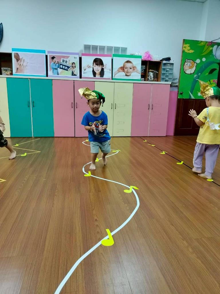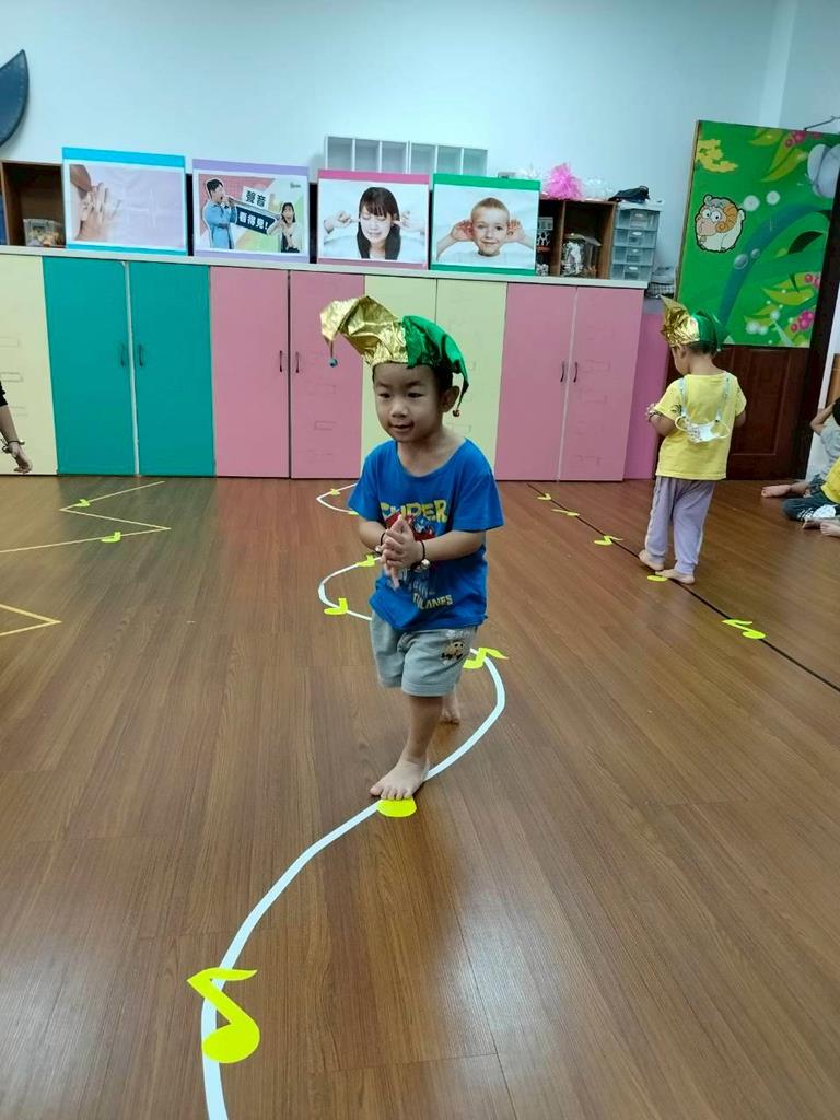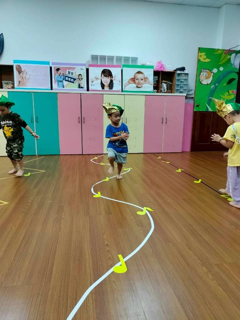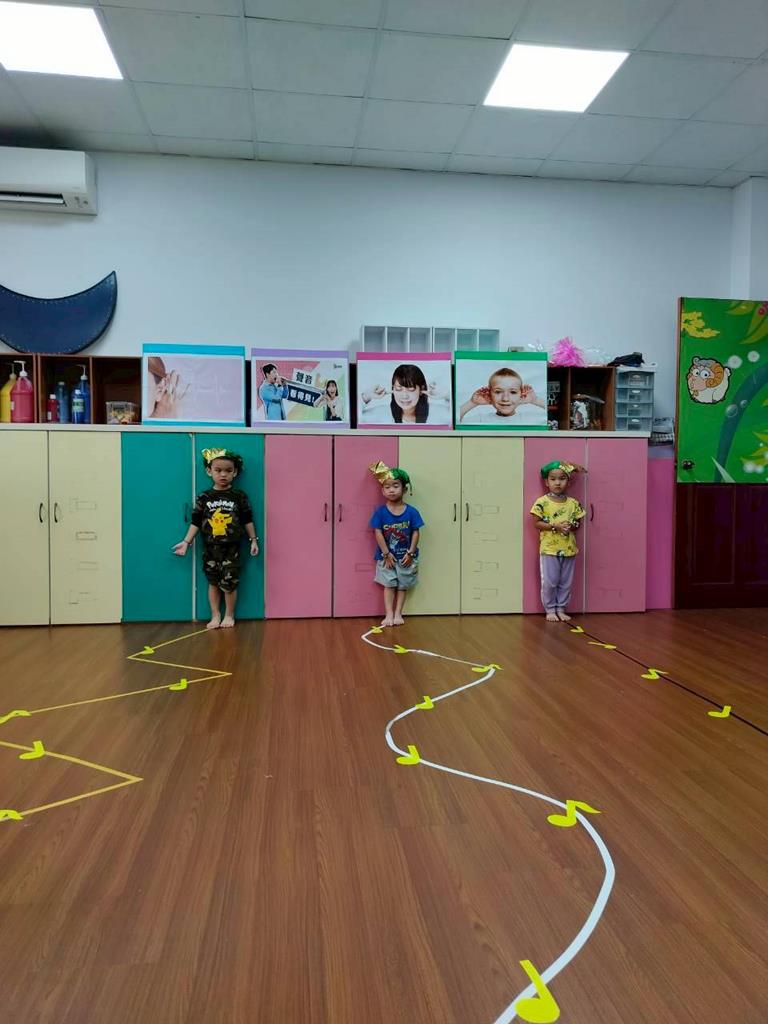老師在地板貼出三條不同線條,讓孩子跟著節奏拍手走出不伐