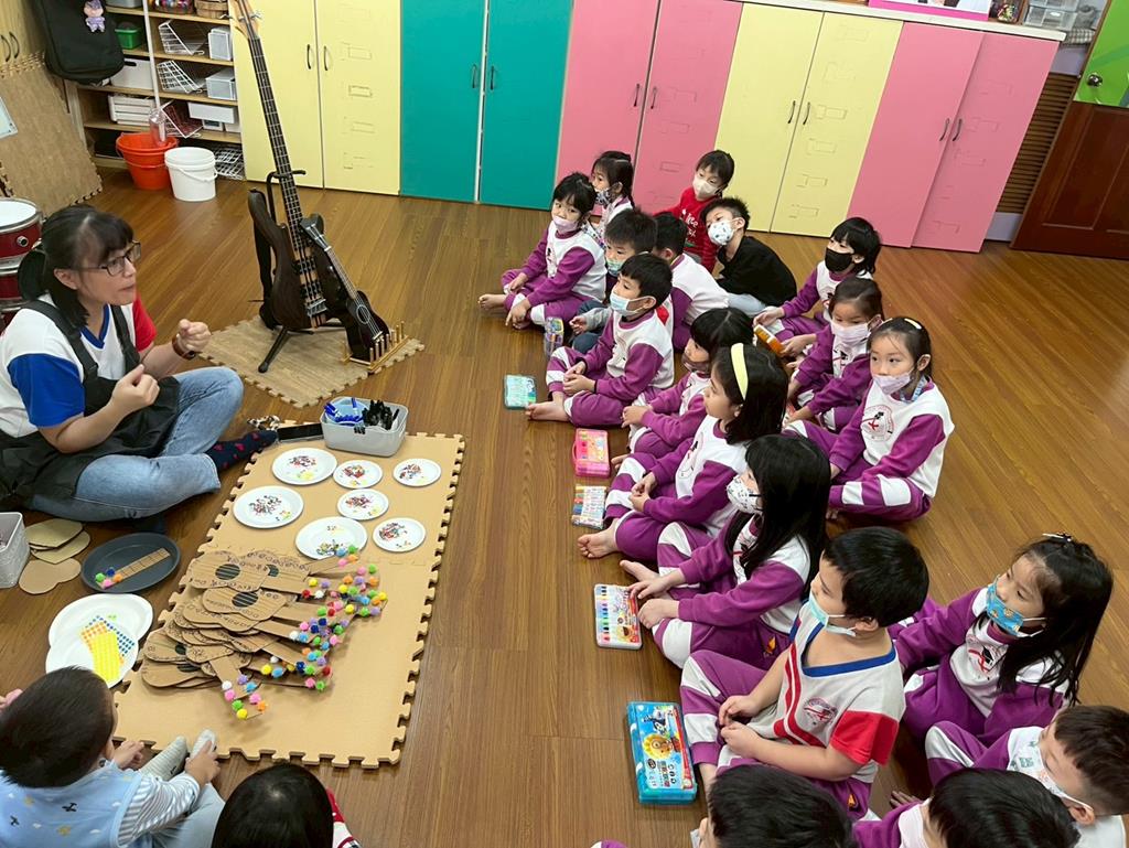 老師提供裝飾素材讓孩子動手裝飾自己的橡皮筋琴,體驗創作的樂趣