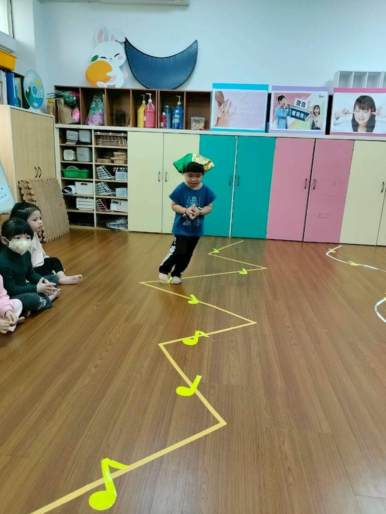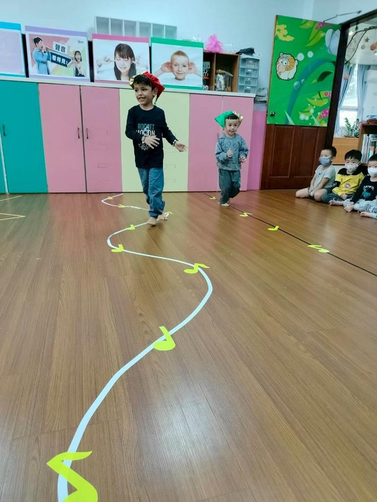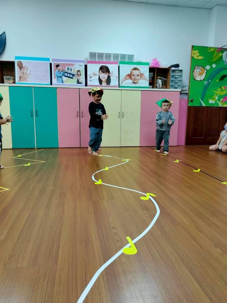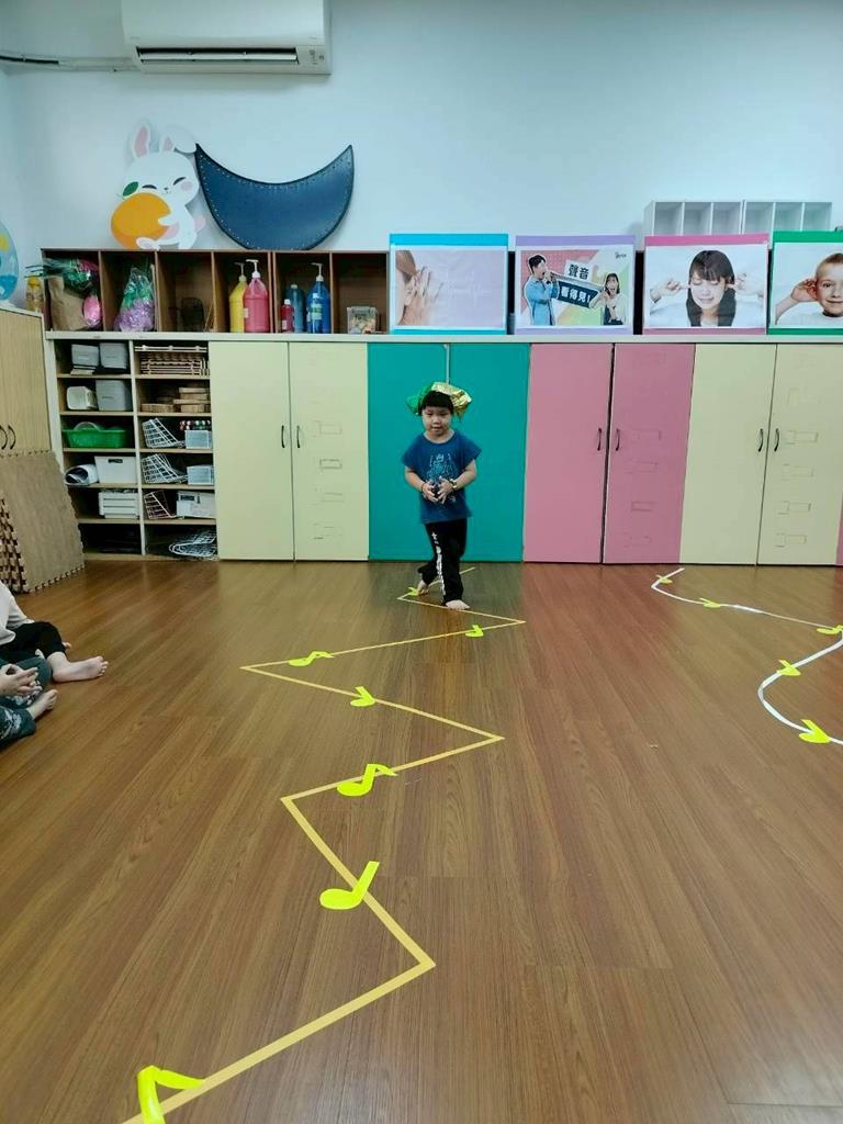 老師在地板貼出三條不同線條,讓孩子跟著節奏拍手走出不伐