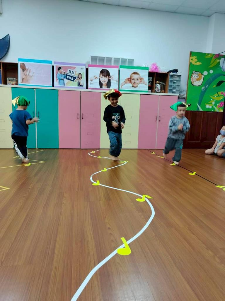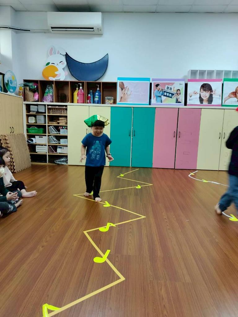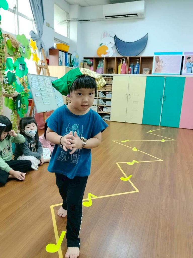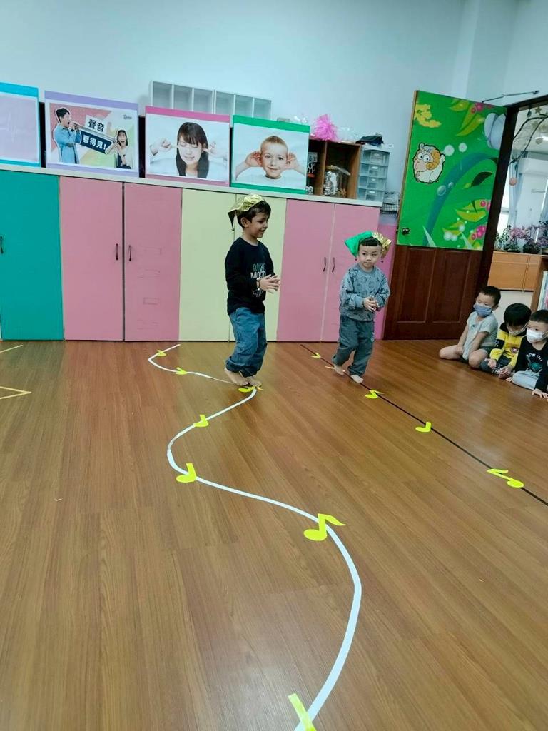 老師在地板貼出三條不同線條,讓孩子跟著節奏拍手走出不伐