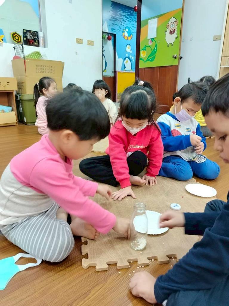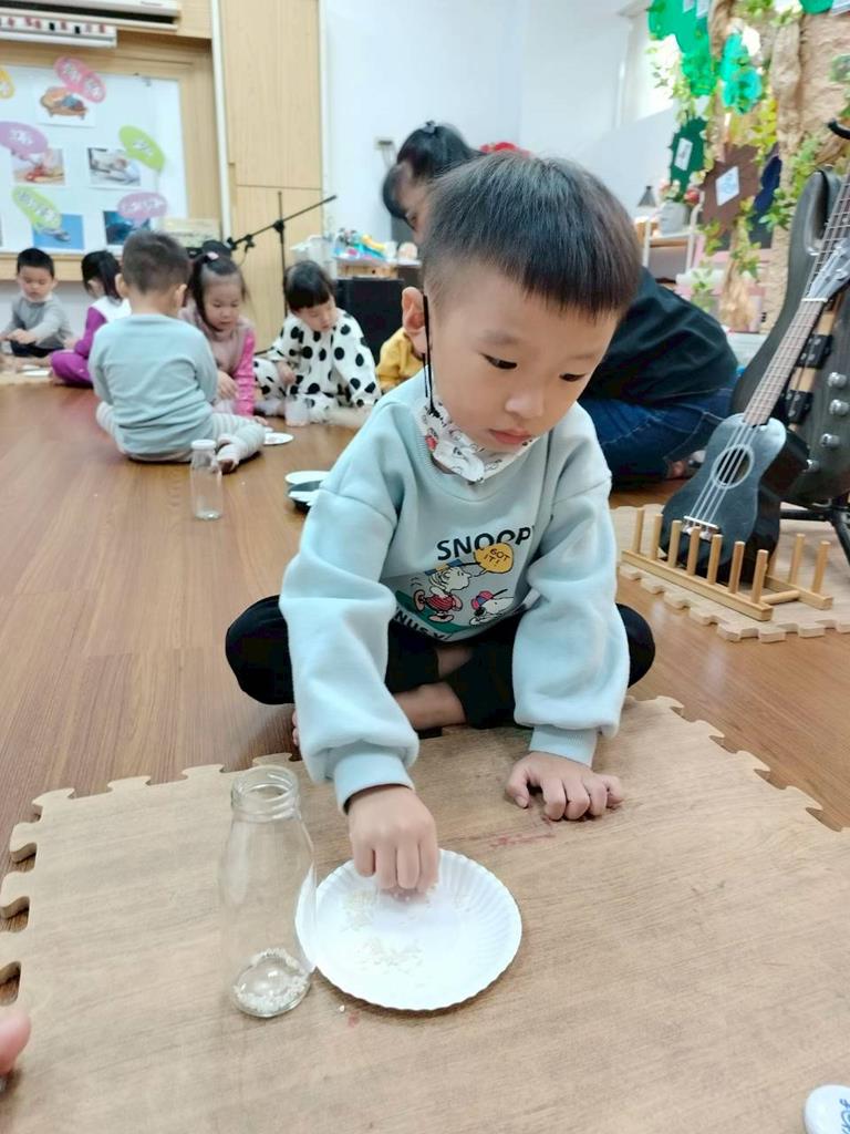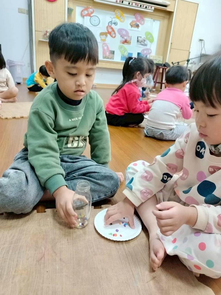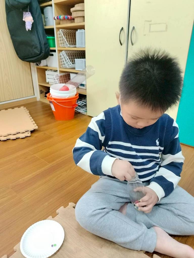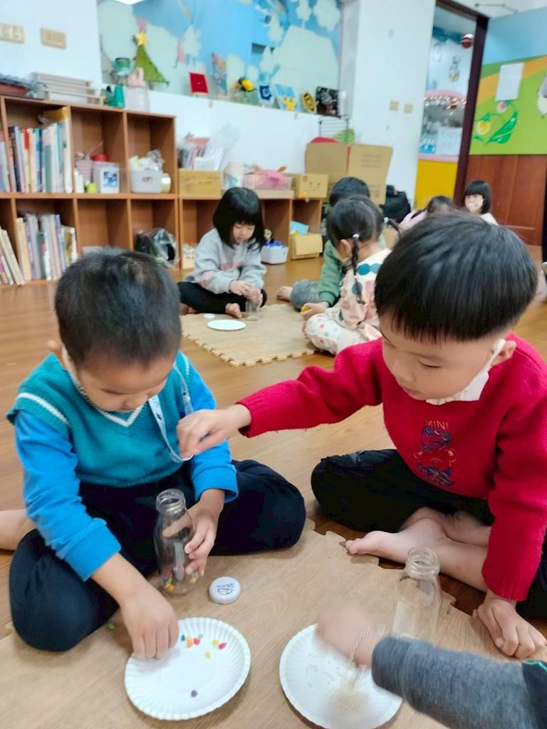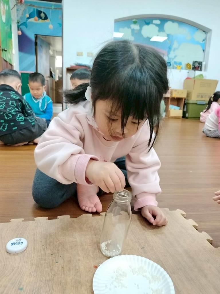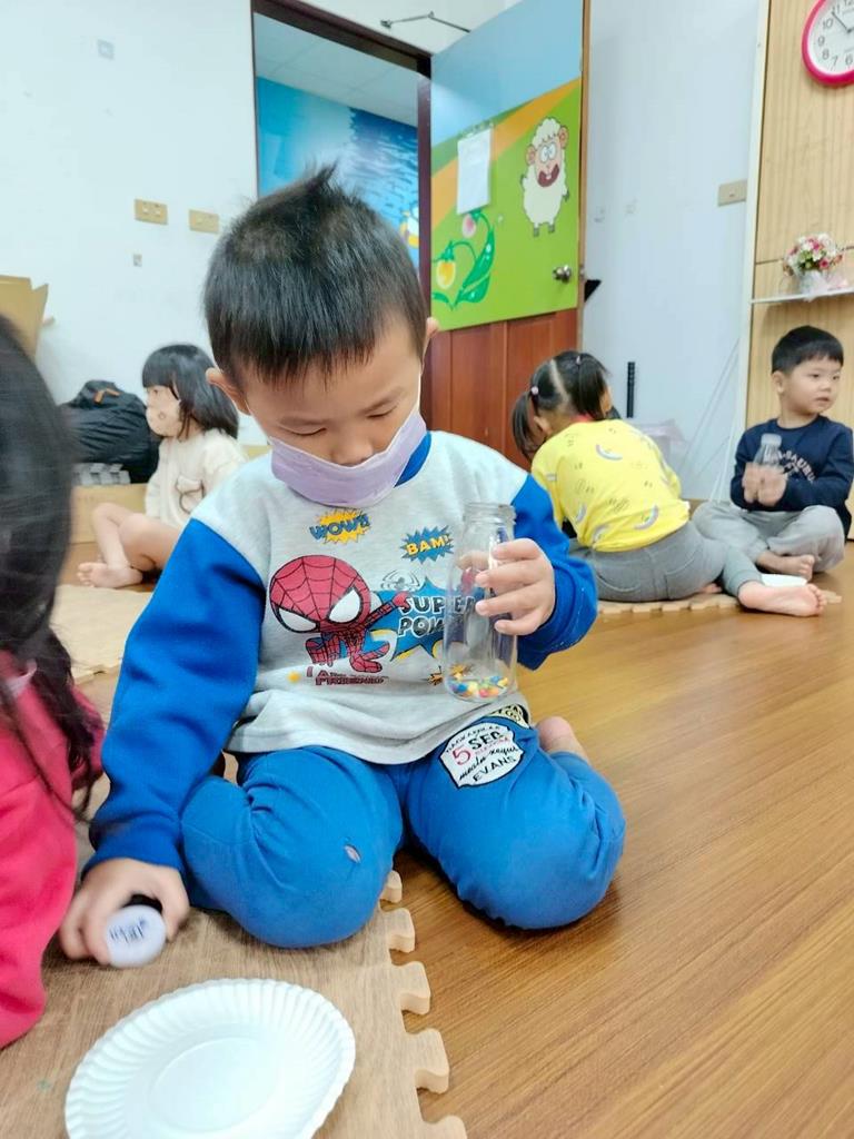 今天孩子們探索搖搖瓶的聲音,孩子聆聽瓶子裡的米粒或小石頭發出的聲音,通過快速或慢慢搖動瓶子感受強弱