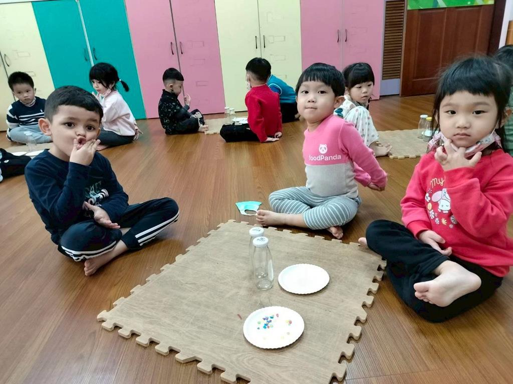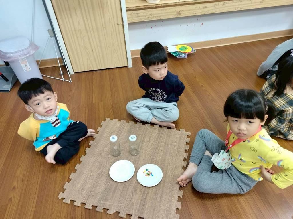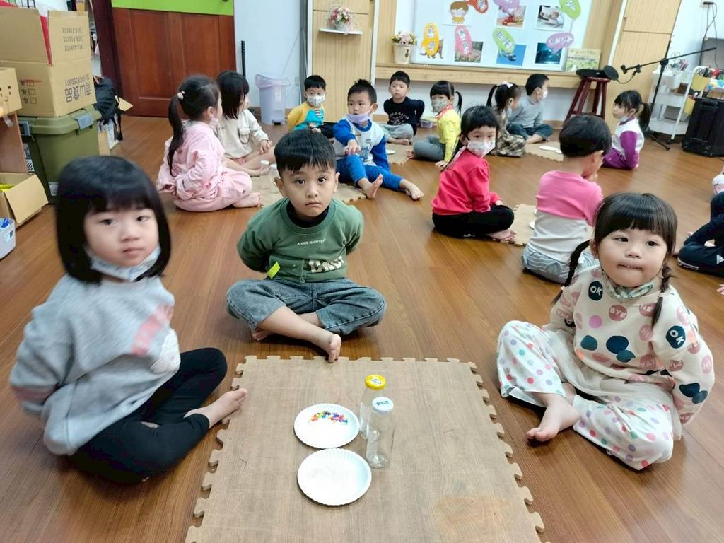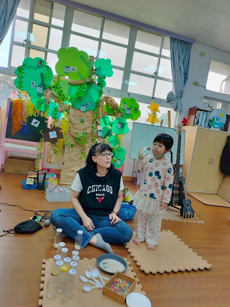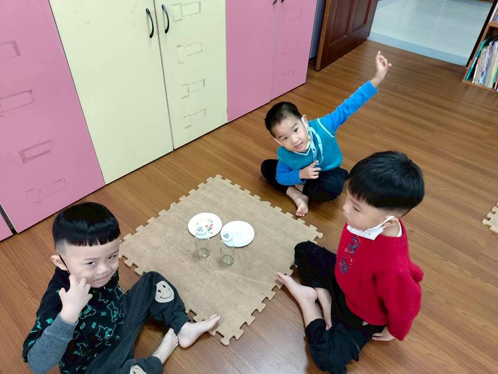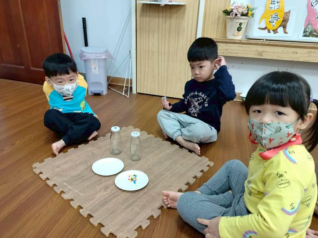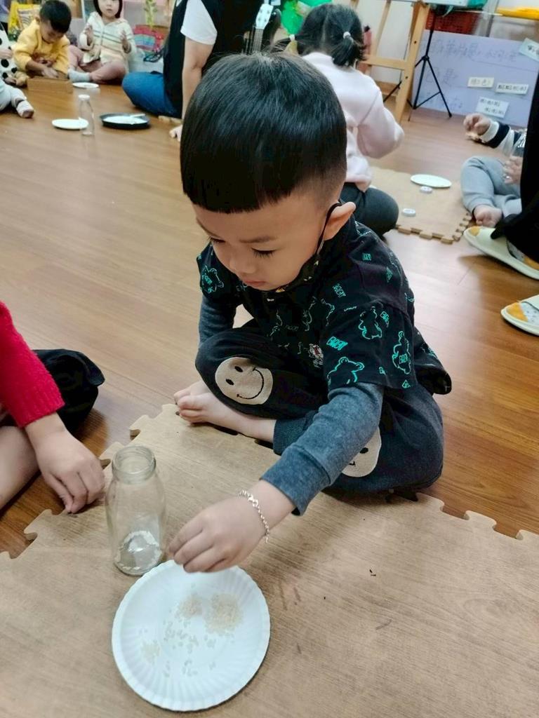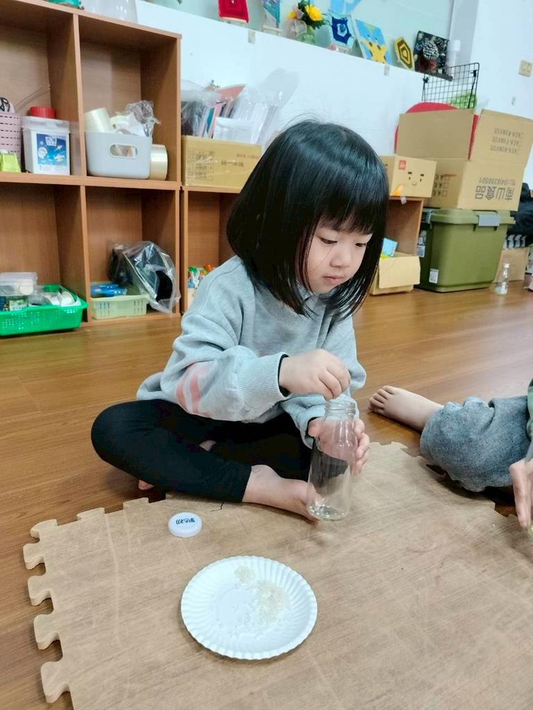 今天孩子們探索搖搖瓶的聲音,孩子聆聽瓶子裡的米粒或小石頭發出的聲音,通過快速或慢慢搖動瓶子感受強弱