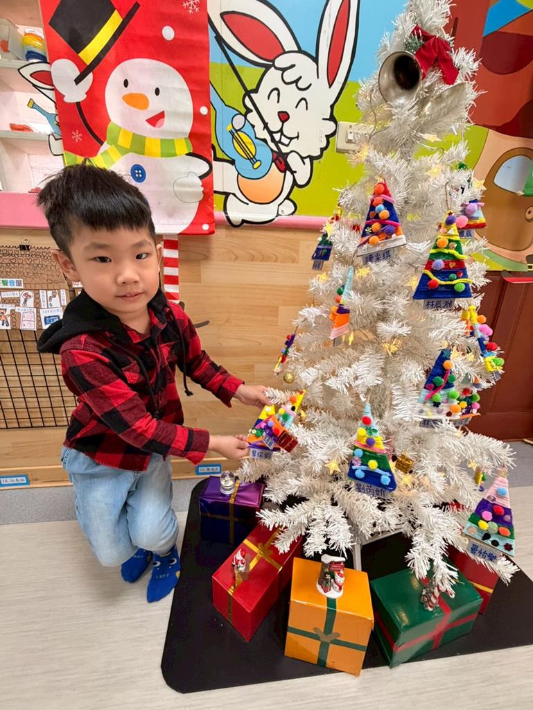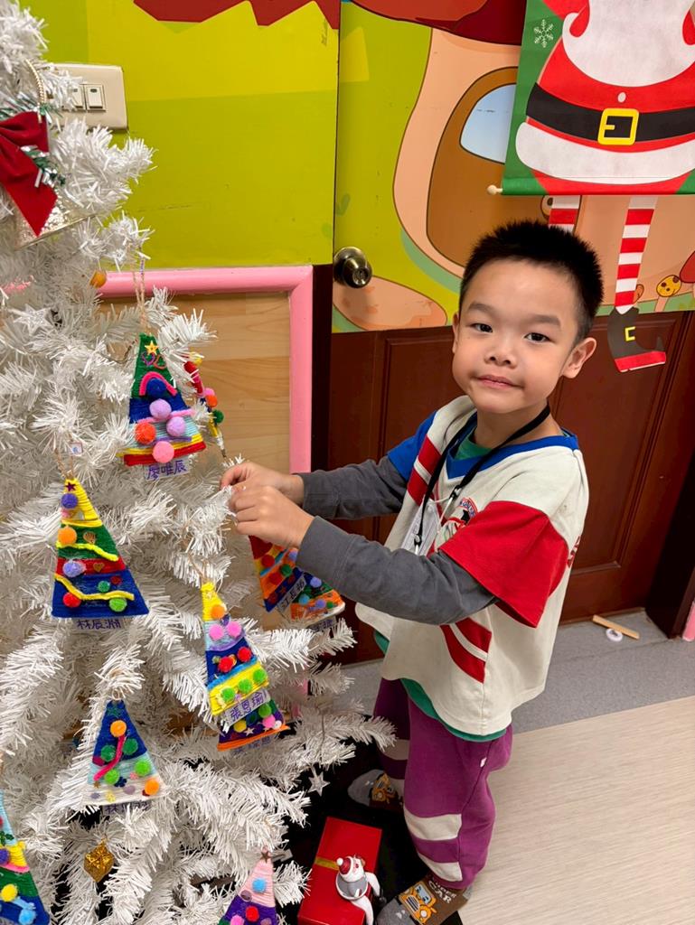 邀請孩子們利用美勞素材進行毛線纏繞,並裝飾在聖誕樹上