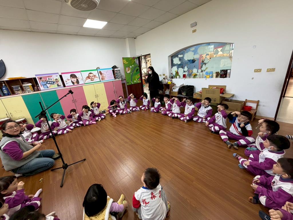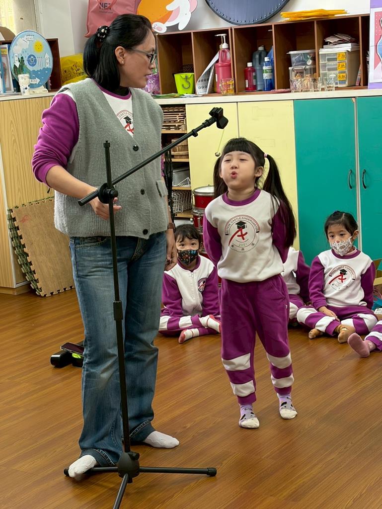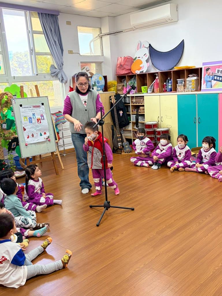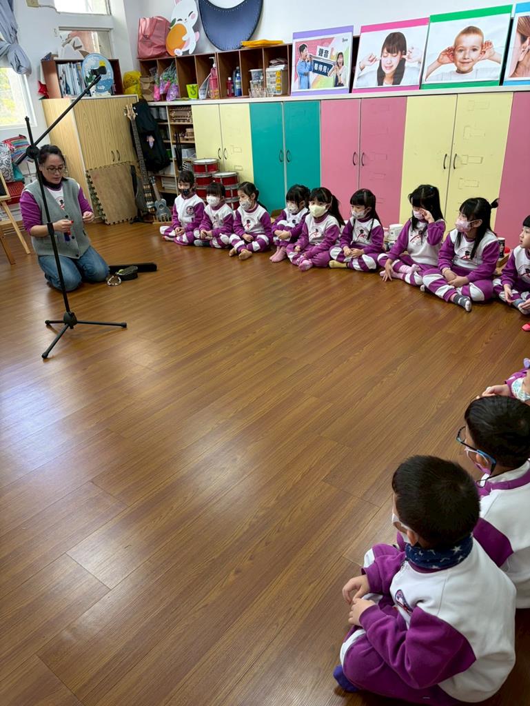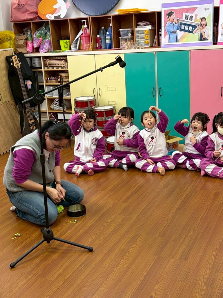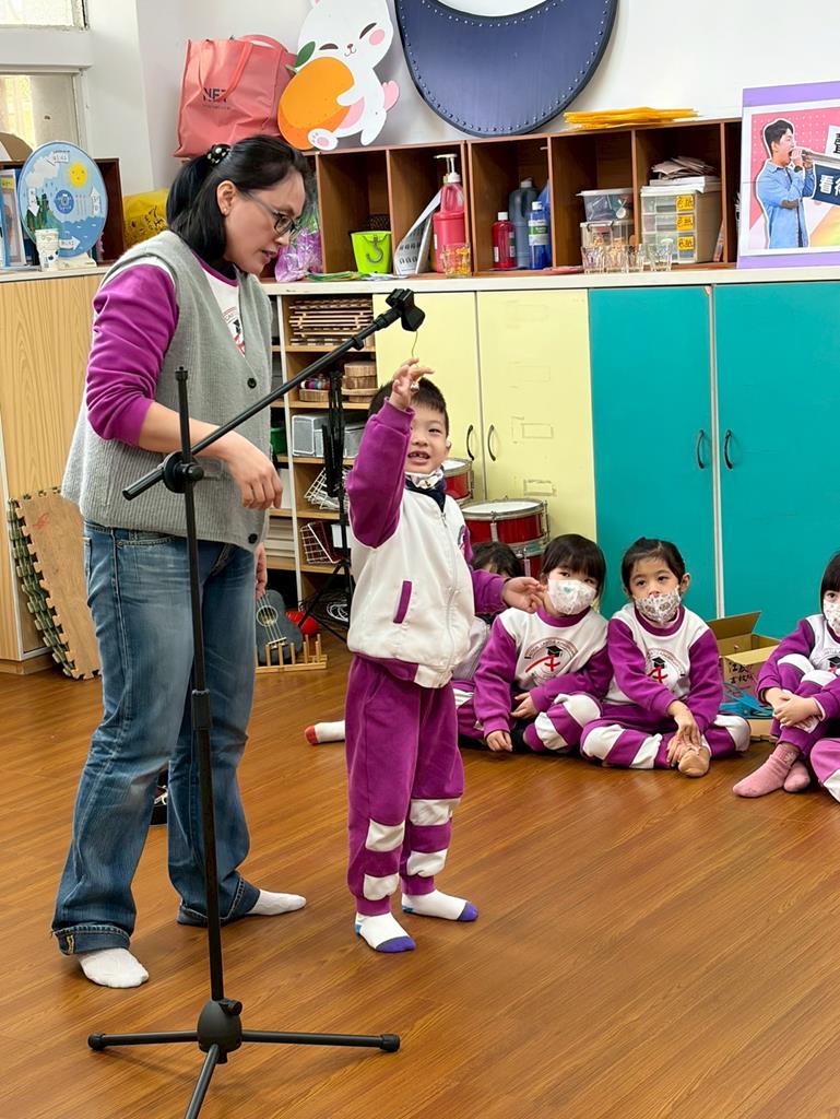 老師引導孩子嘗試用嘴巴吹小鈴鐺,感受聲音的輕柔變化。