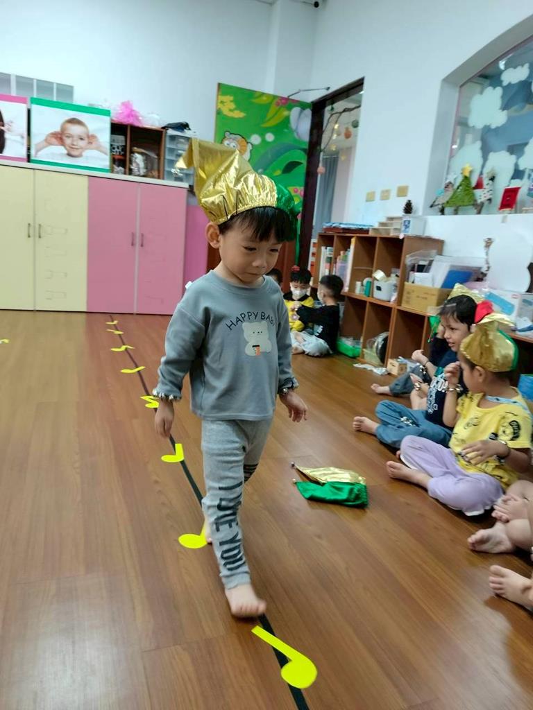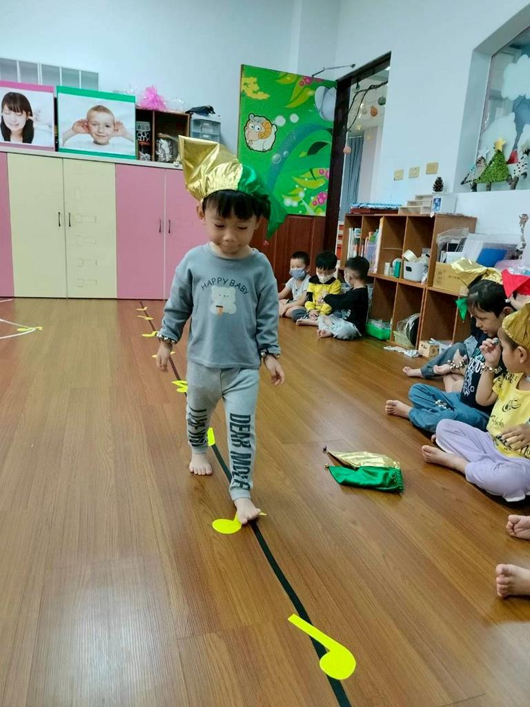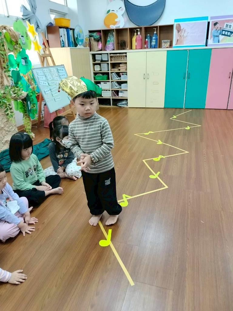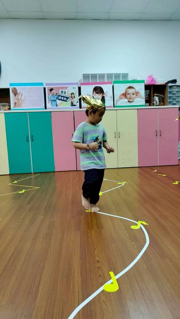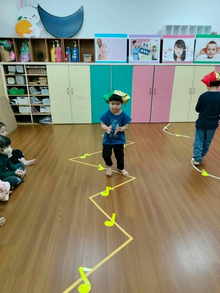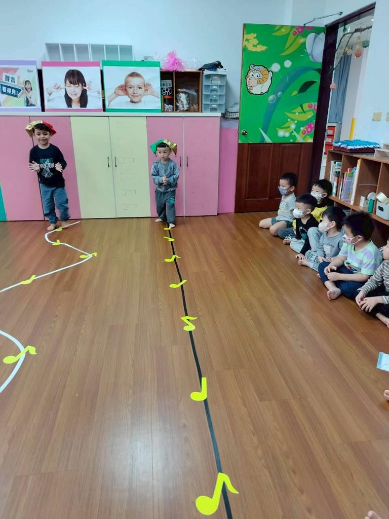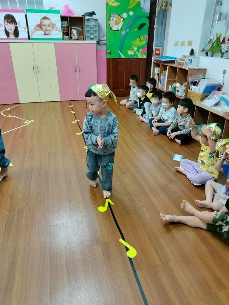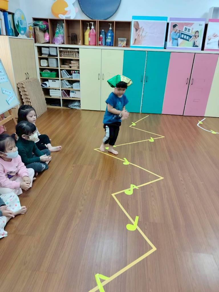 老師在地板貼出三條不同線條,讓孩子跟著節奏拍手走出不伐