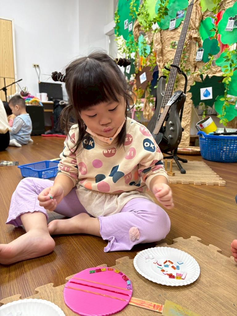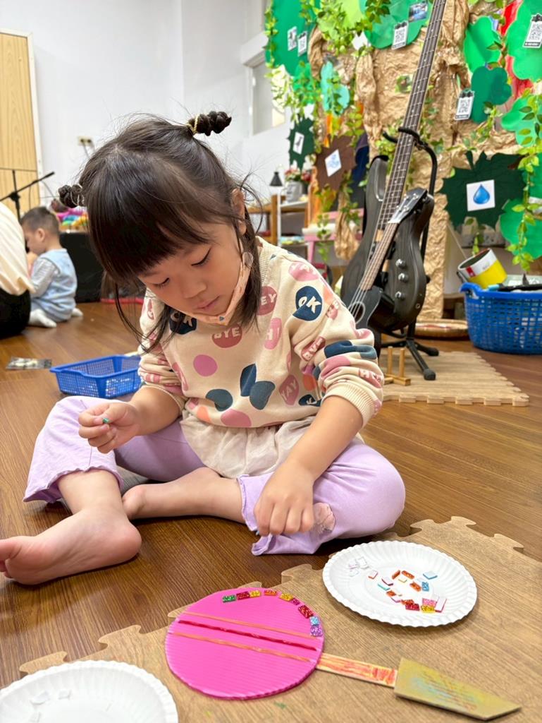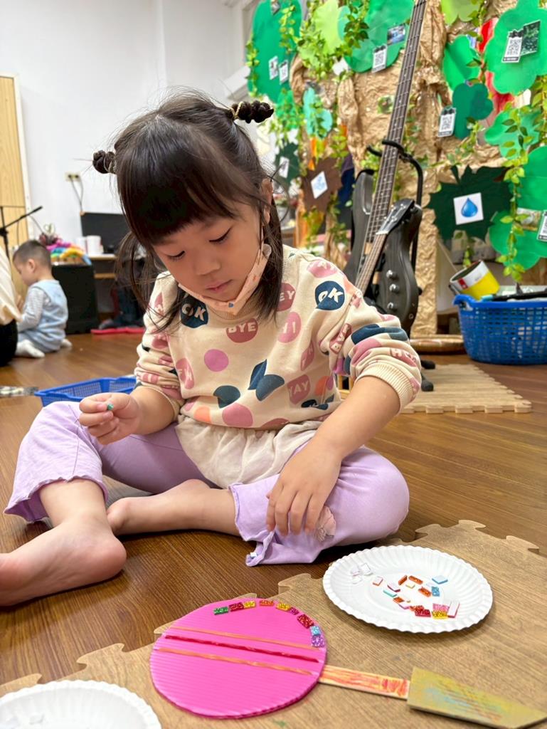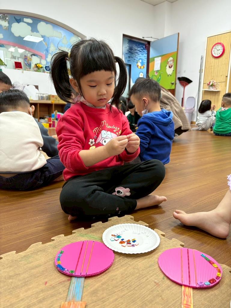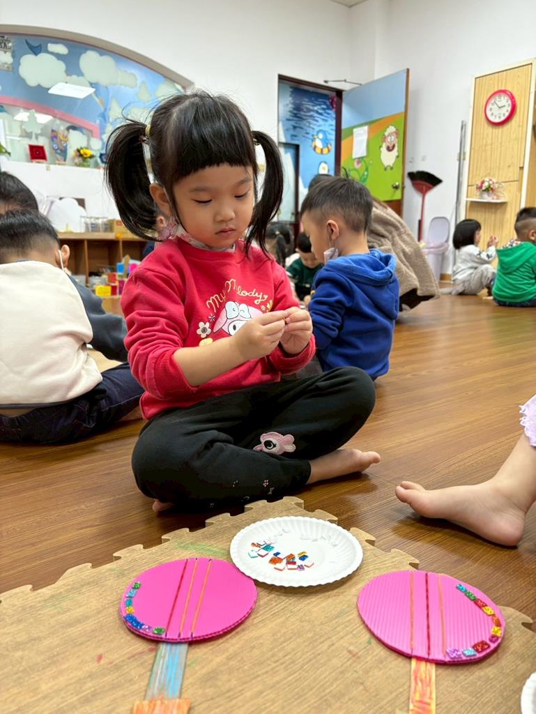 老師引導幼兒把橡皮筋套在紙盤上,小手動一動在自己的小琴上動手裝飾創作出獨一無二的作品。