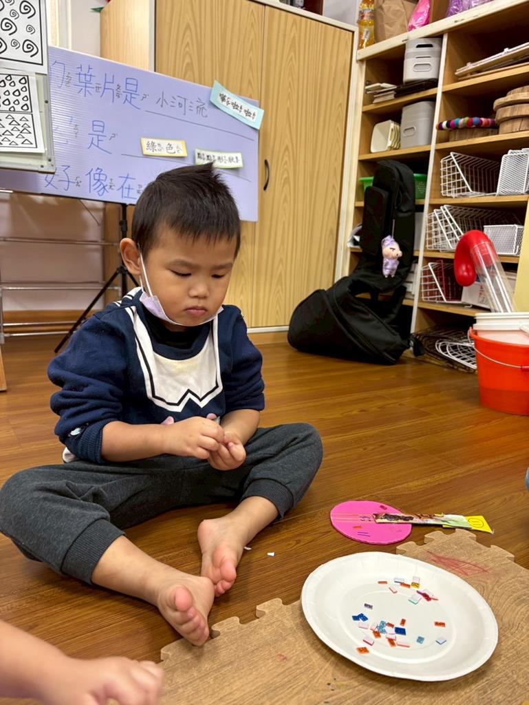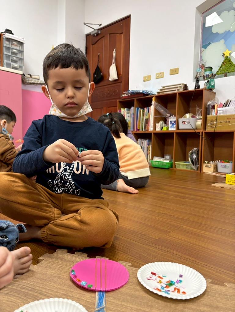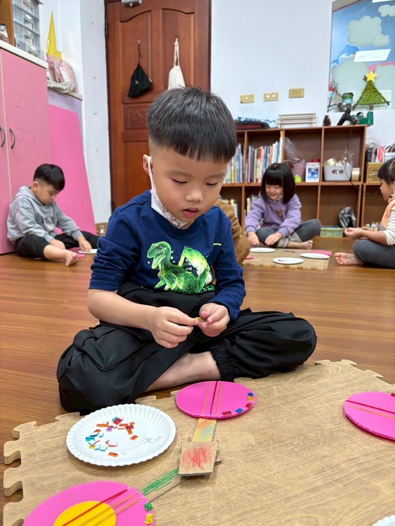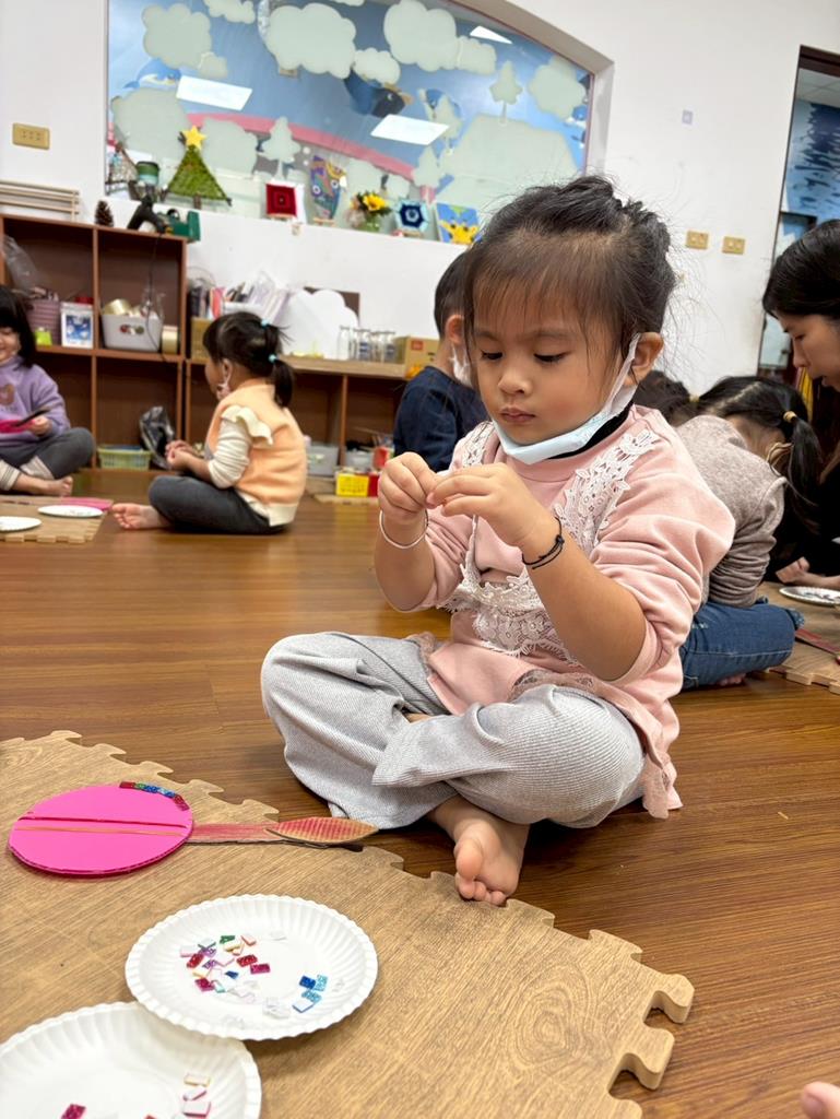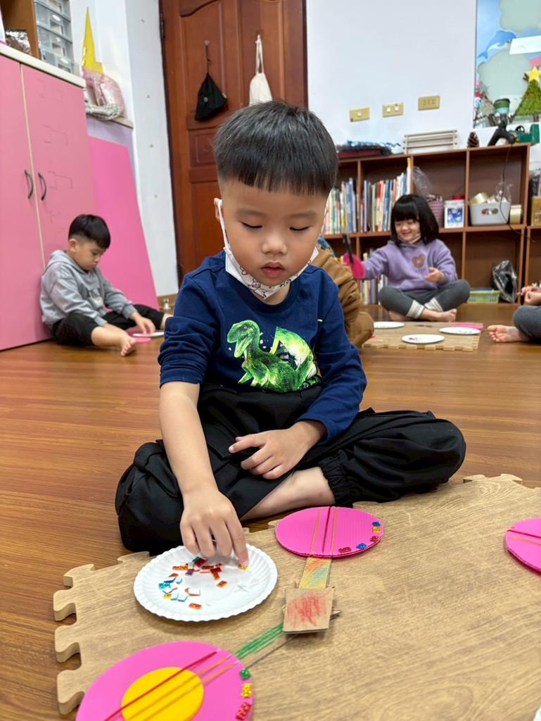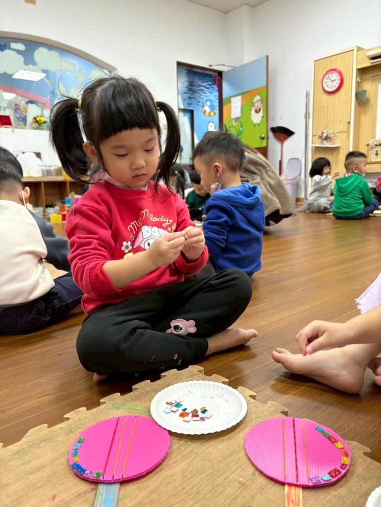 老師引導幼兒把橡皮筋套在紙盤上,小手動一動在自己的小琴上動手裝飾創作出獨一無二的作品。