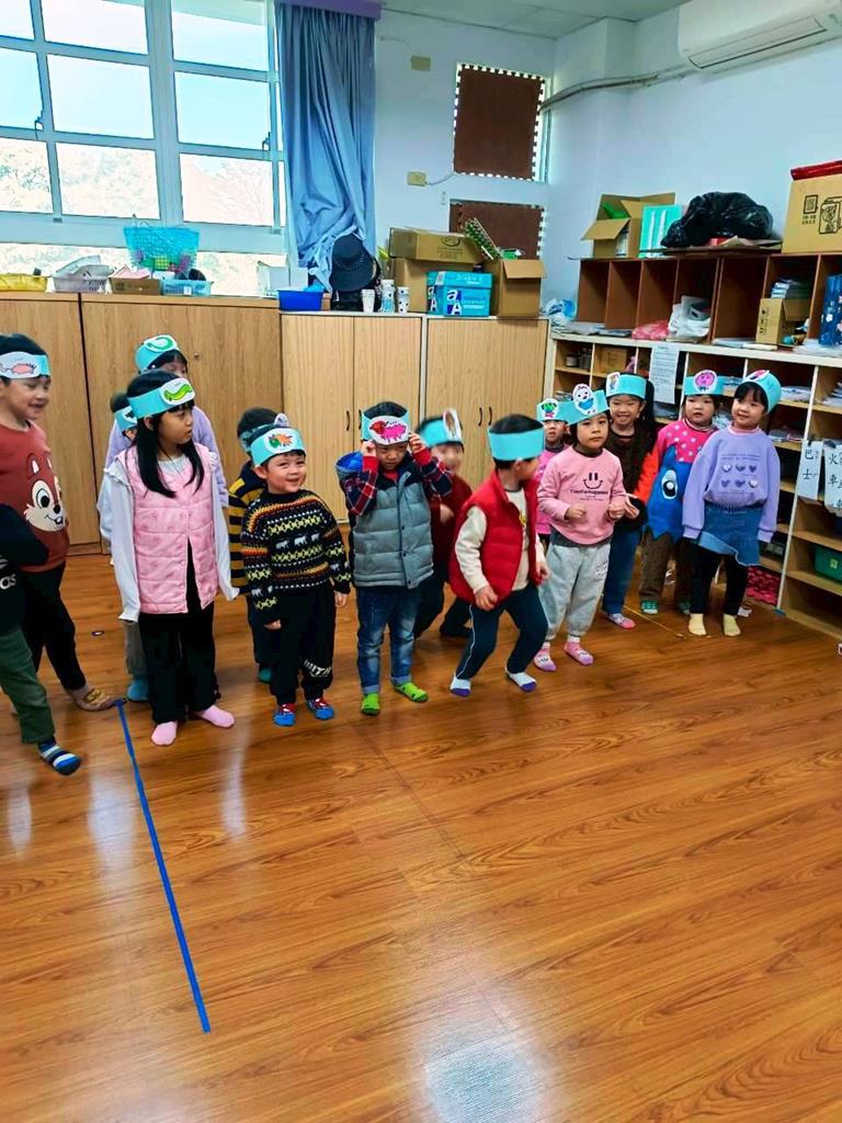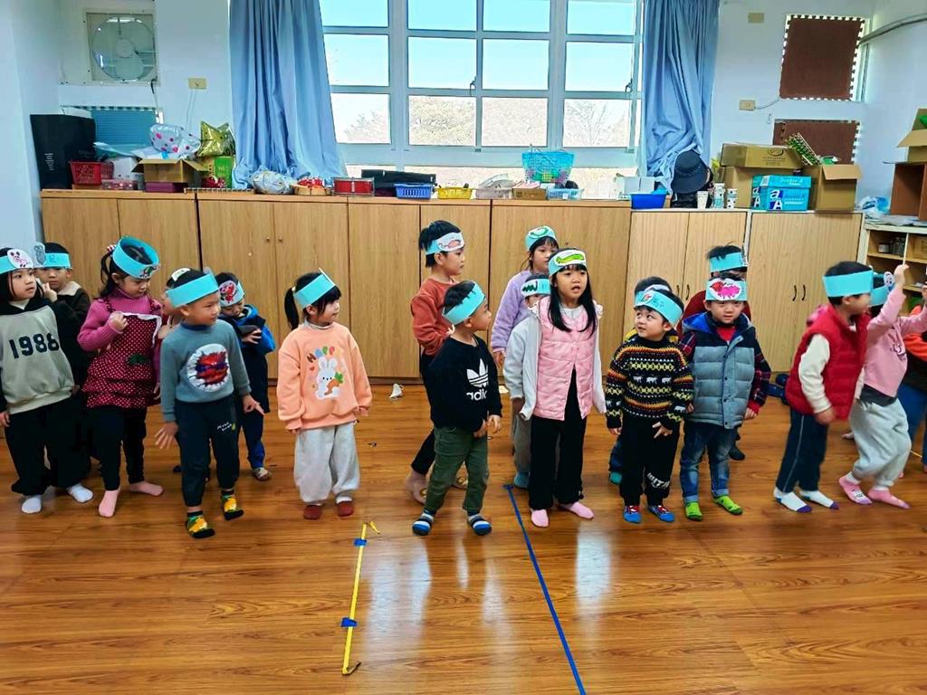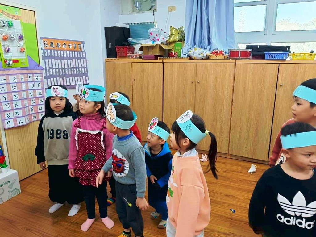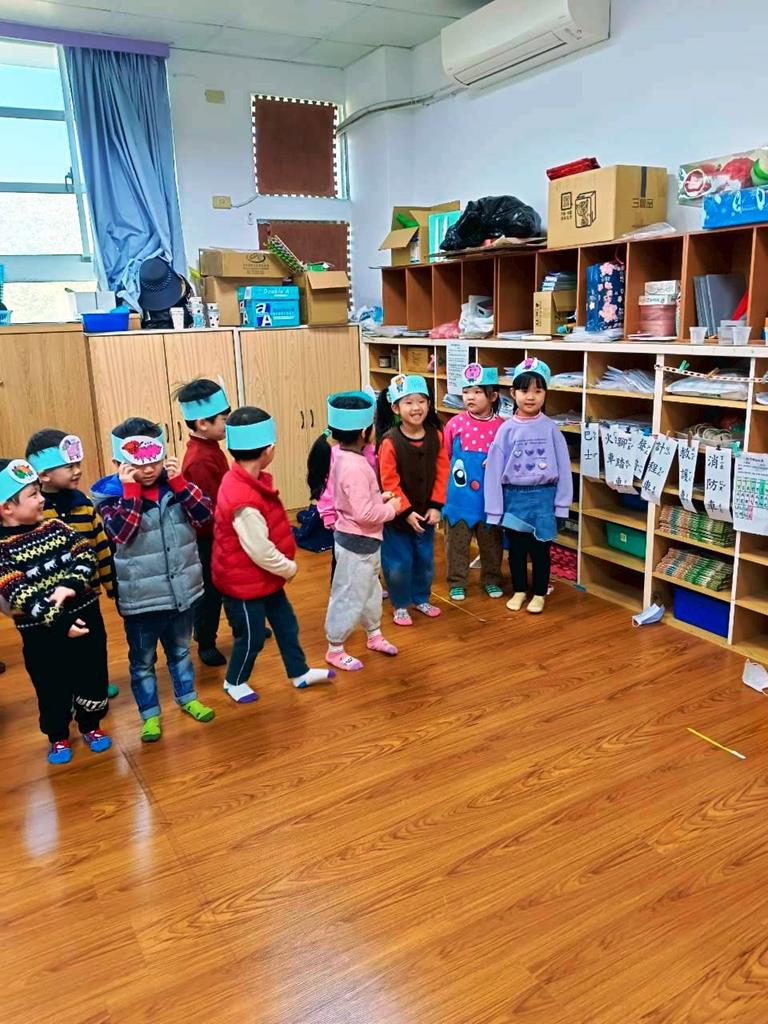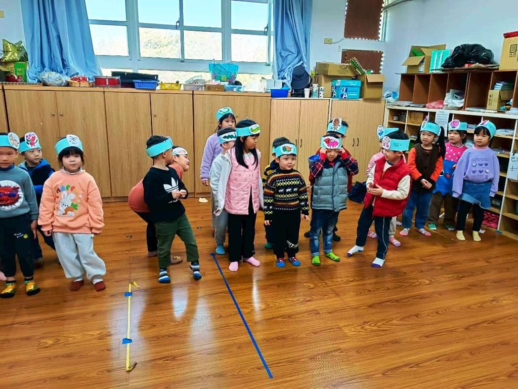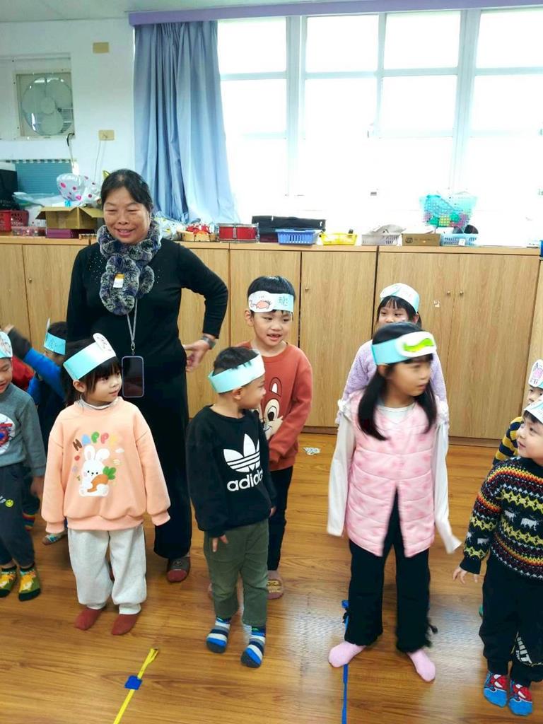 請幼兒戴上自製的動物頭 套老師並帶領幼兒進 行「十二生肖動物蹲」的遊戲。