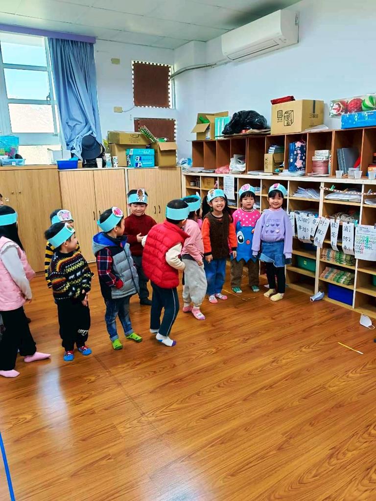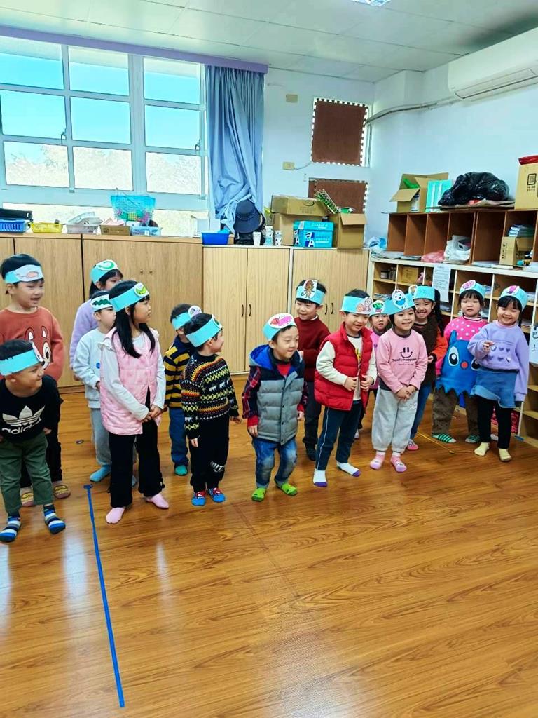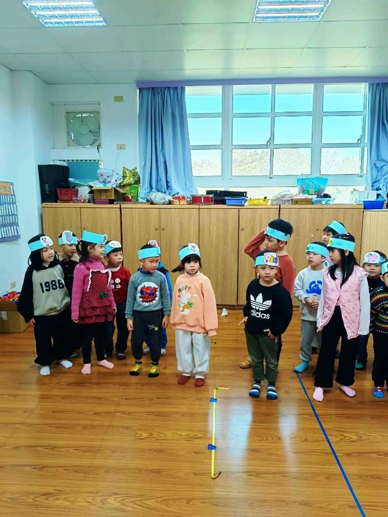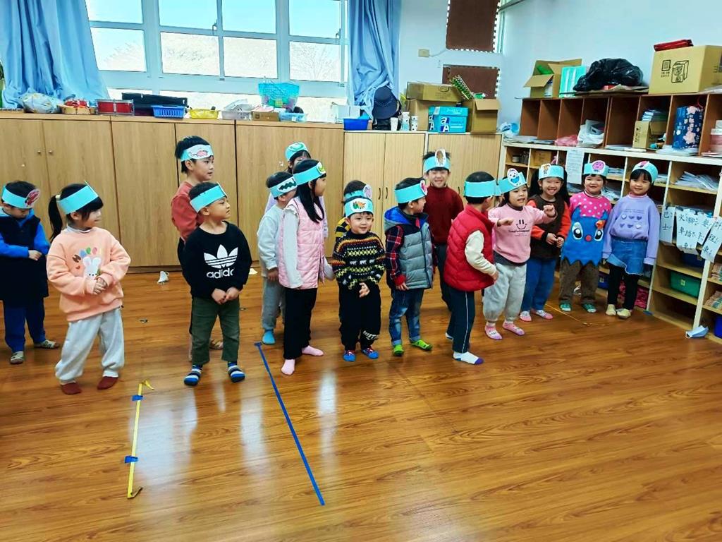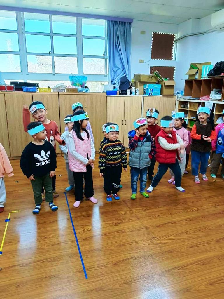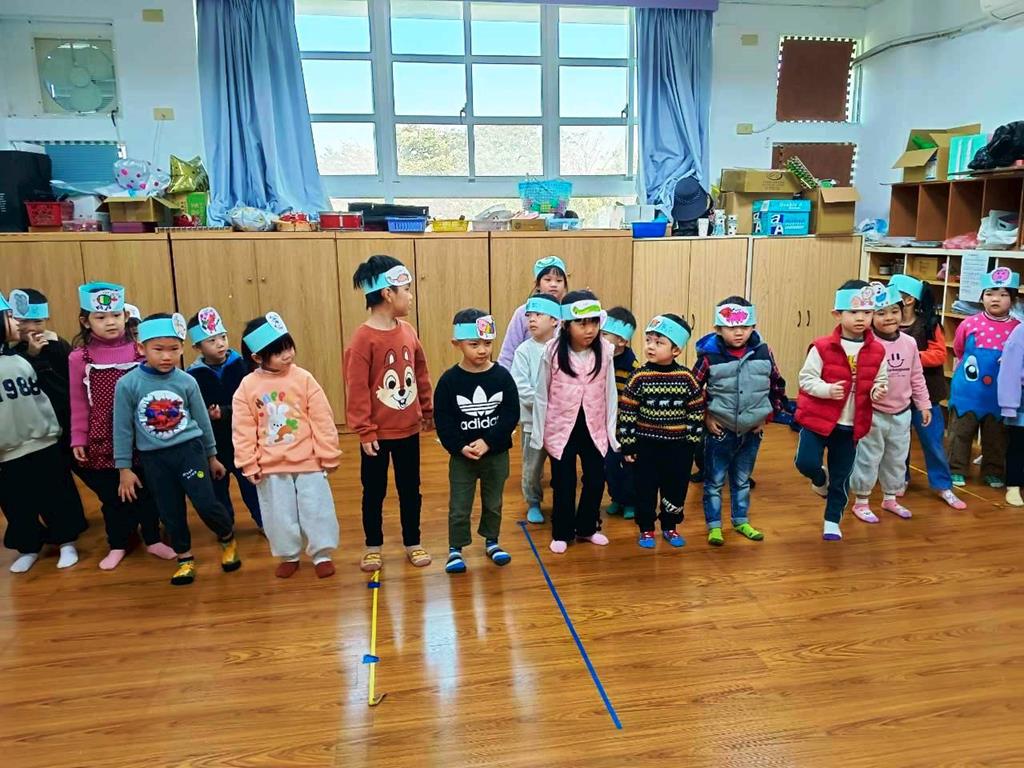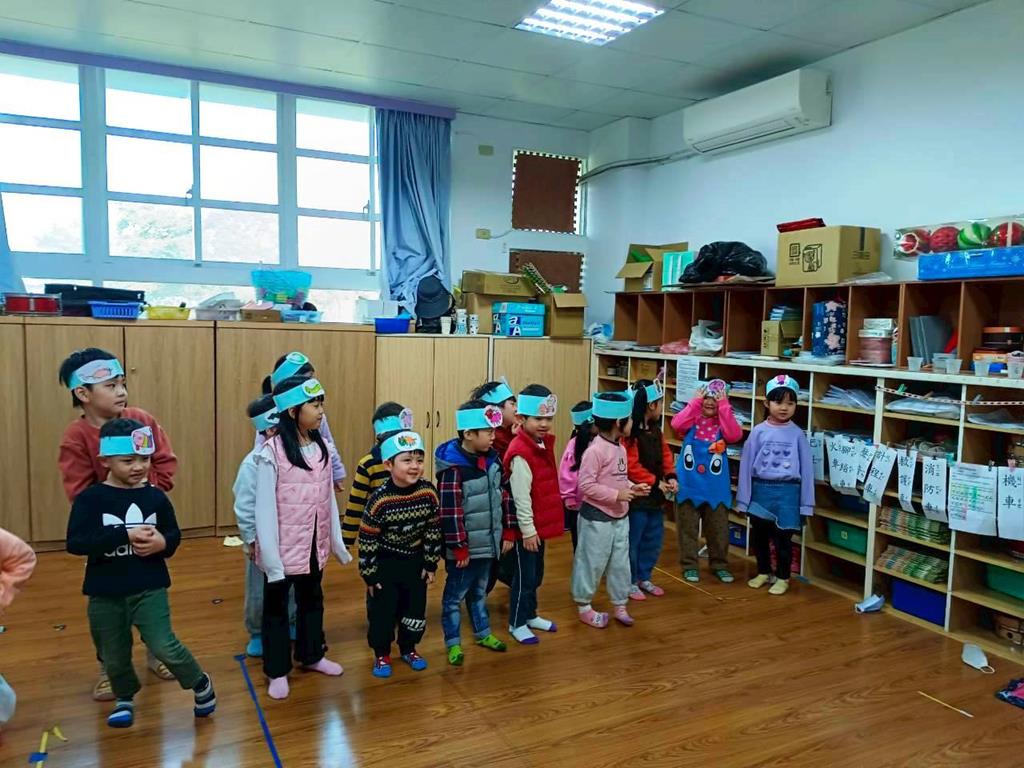請幼兒戴上自製的動物頭 套老師並帶領幼兒進 行「十二生肖動物蹲」的遊戲。