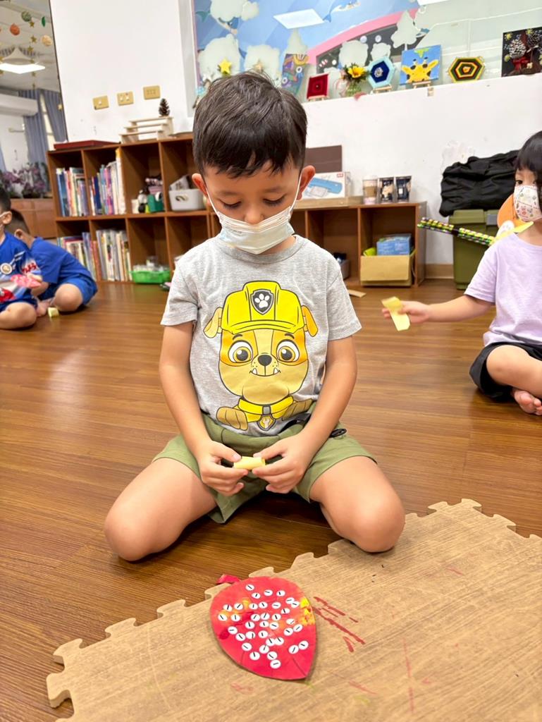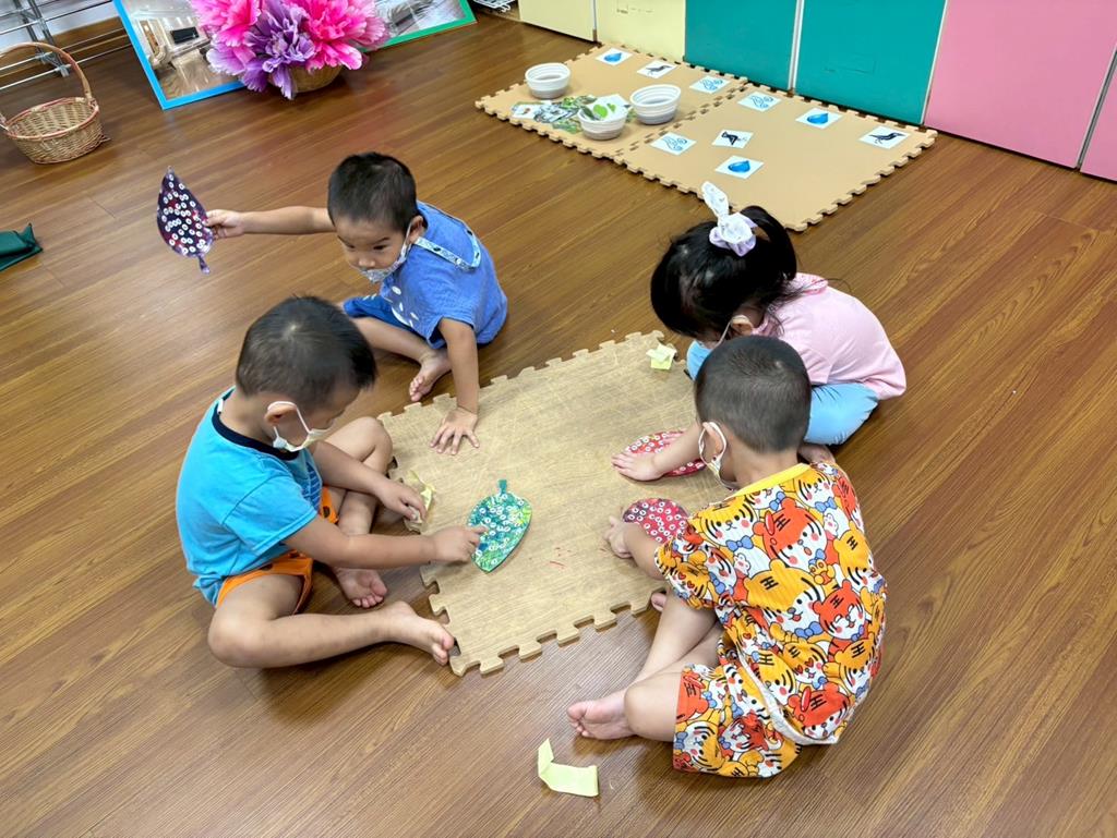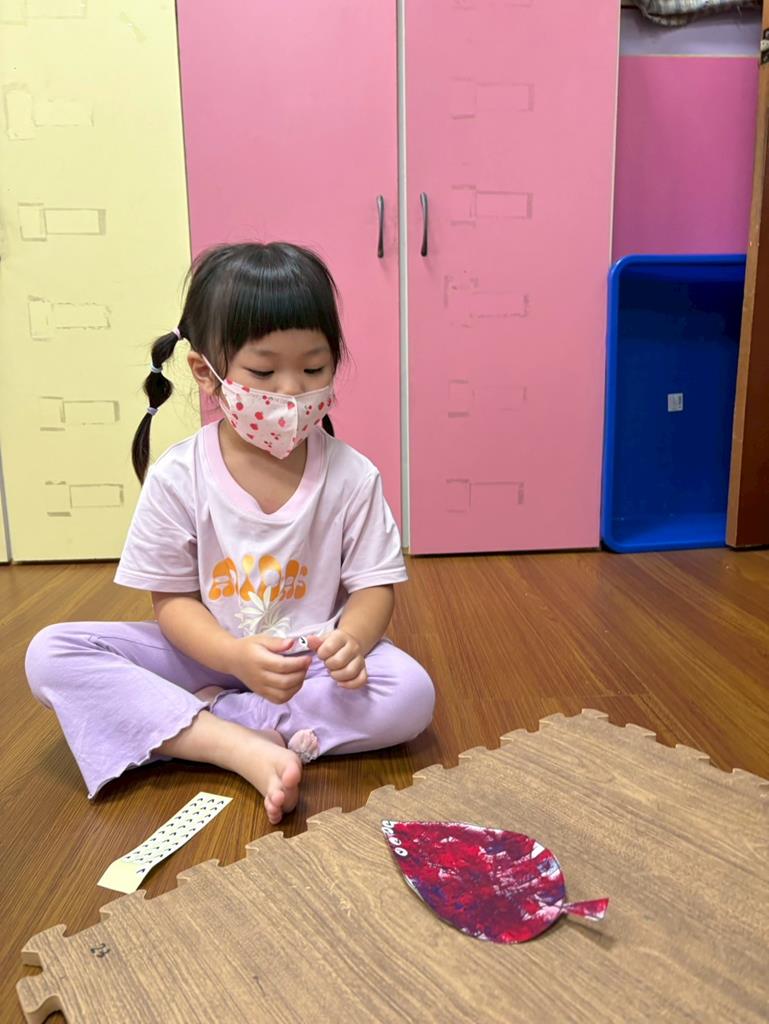 孩子們將蓋印彩色葉片,加上自己喜歡的大自然聲音代表線條貼紙,表達葉片上。