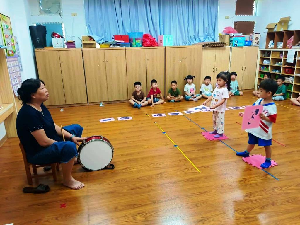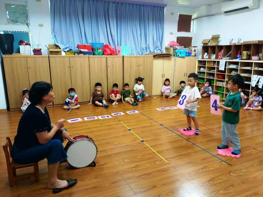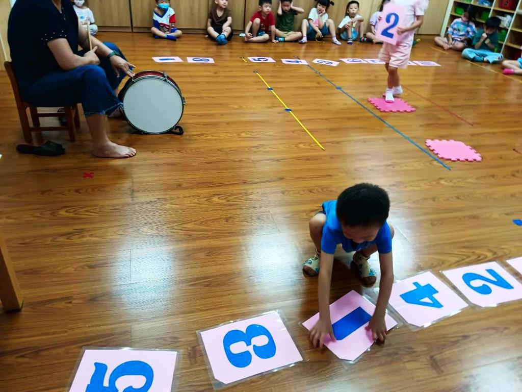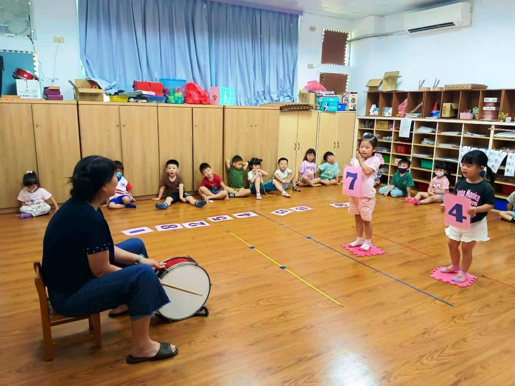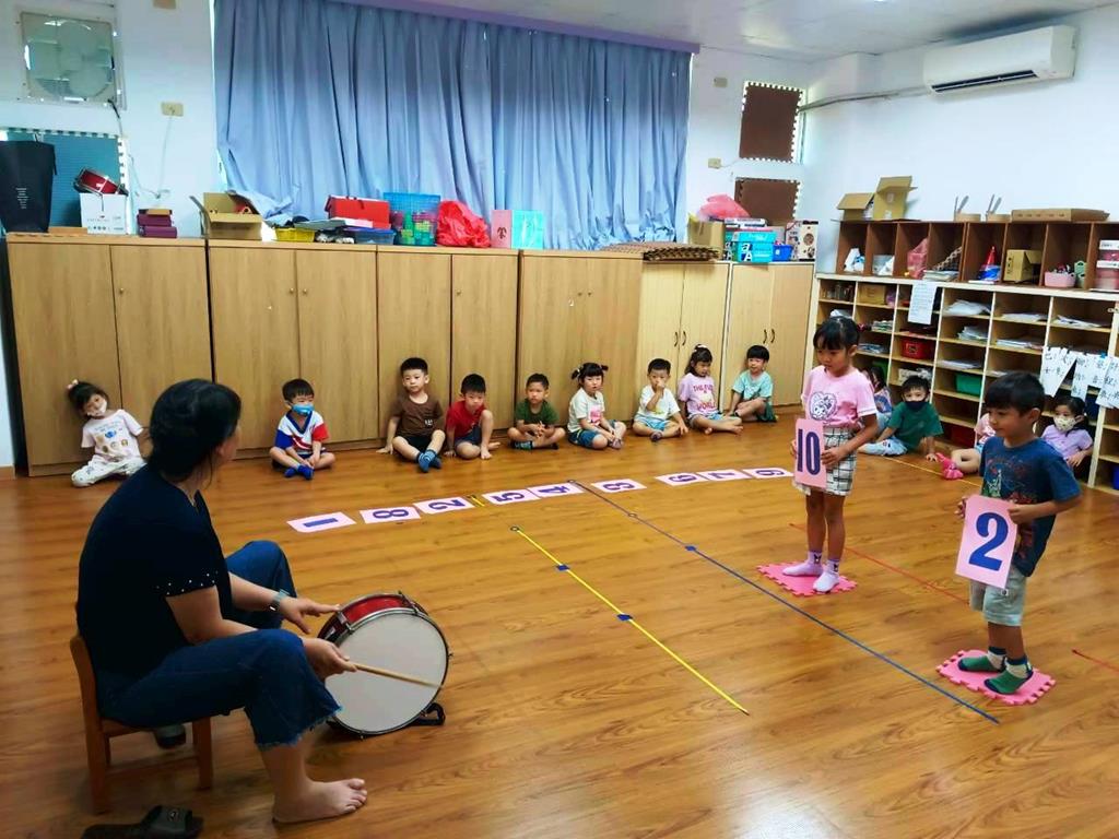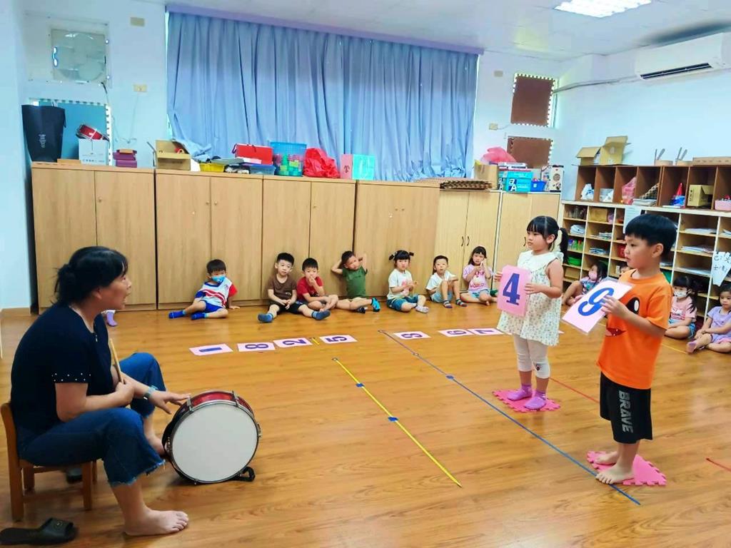 老師敲鼓,幼兒仔細聽聲音次數,搶拿對應的數字卡。