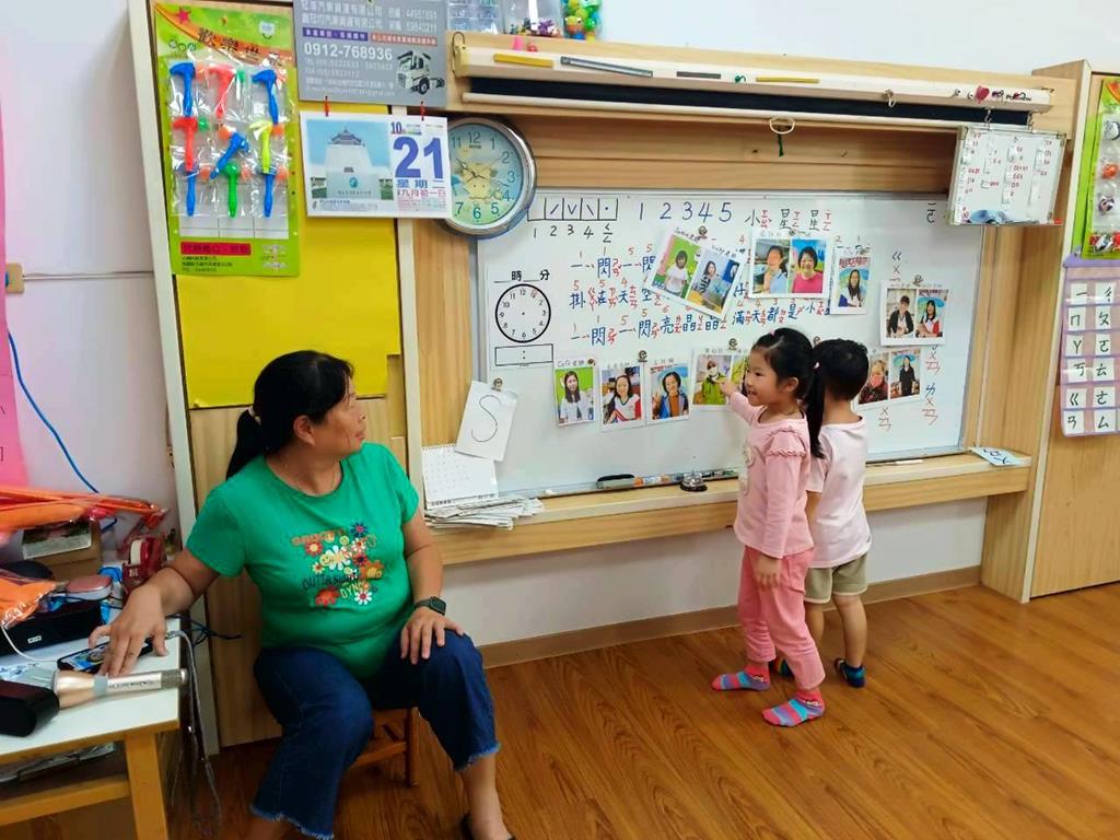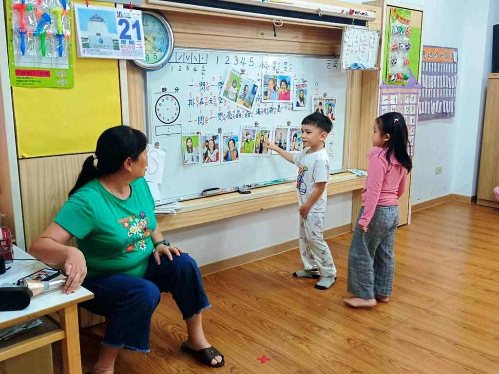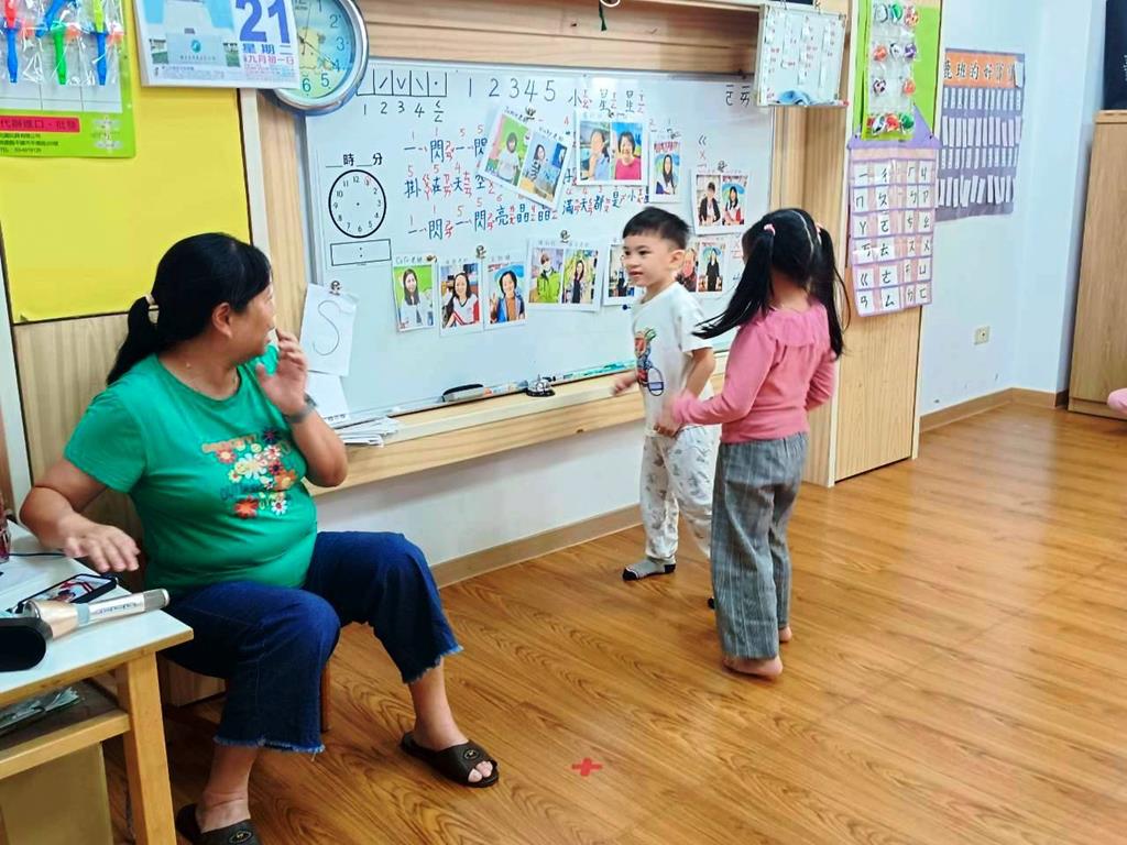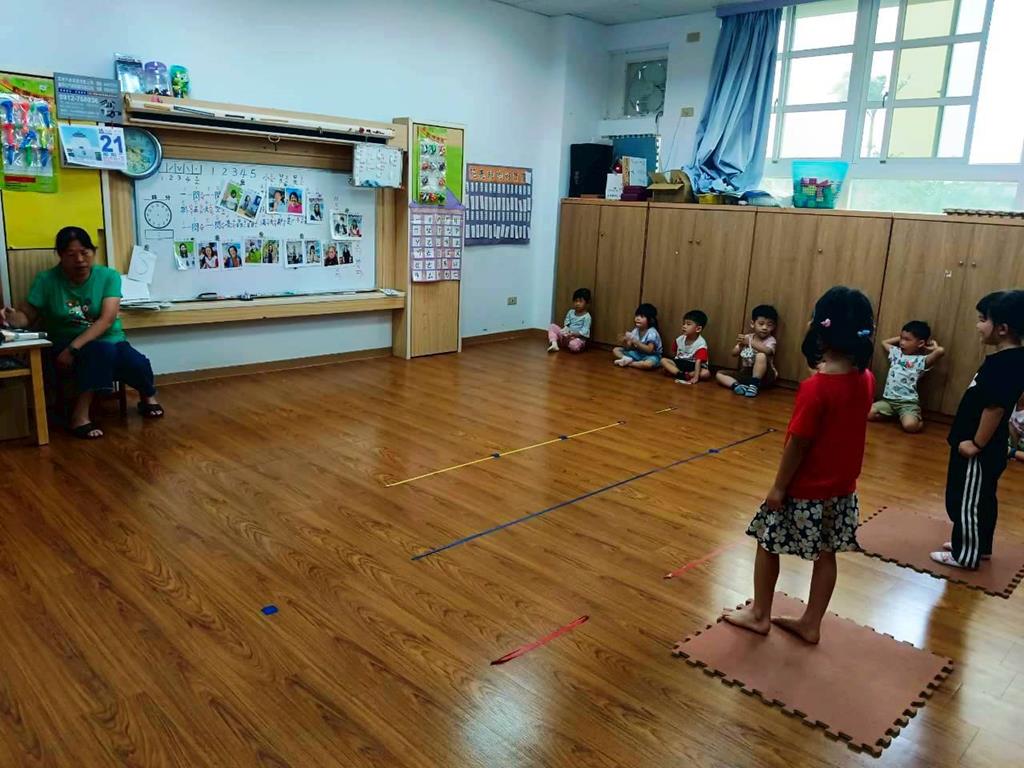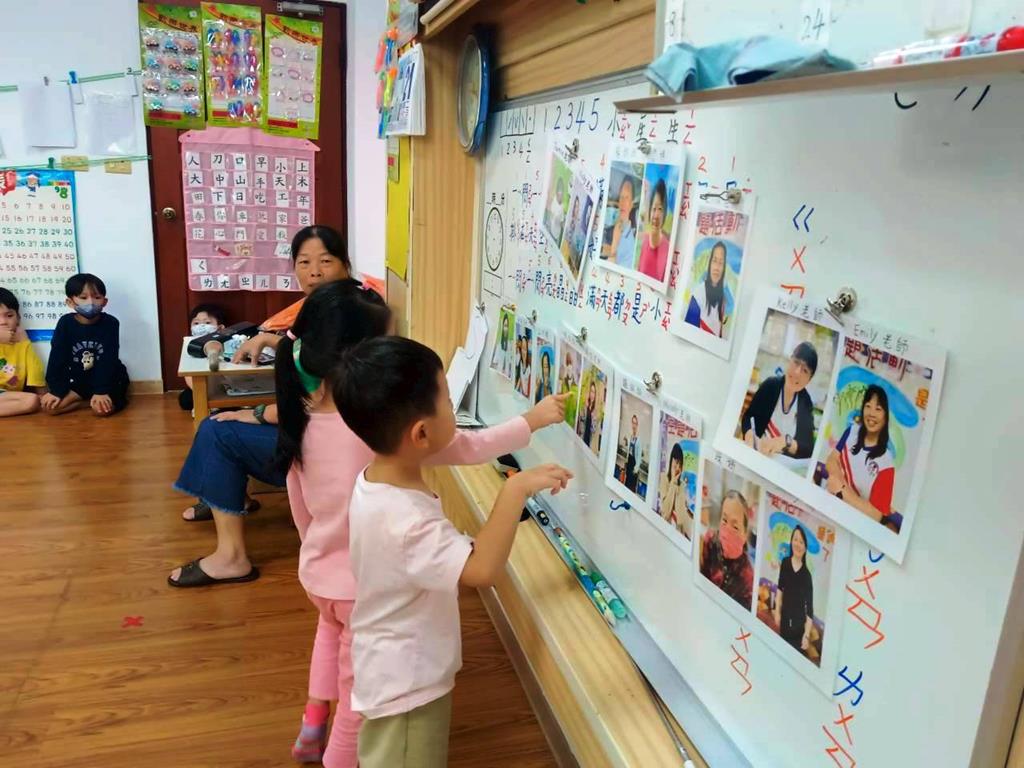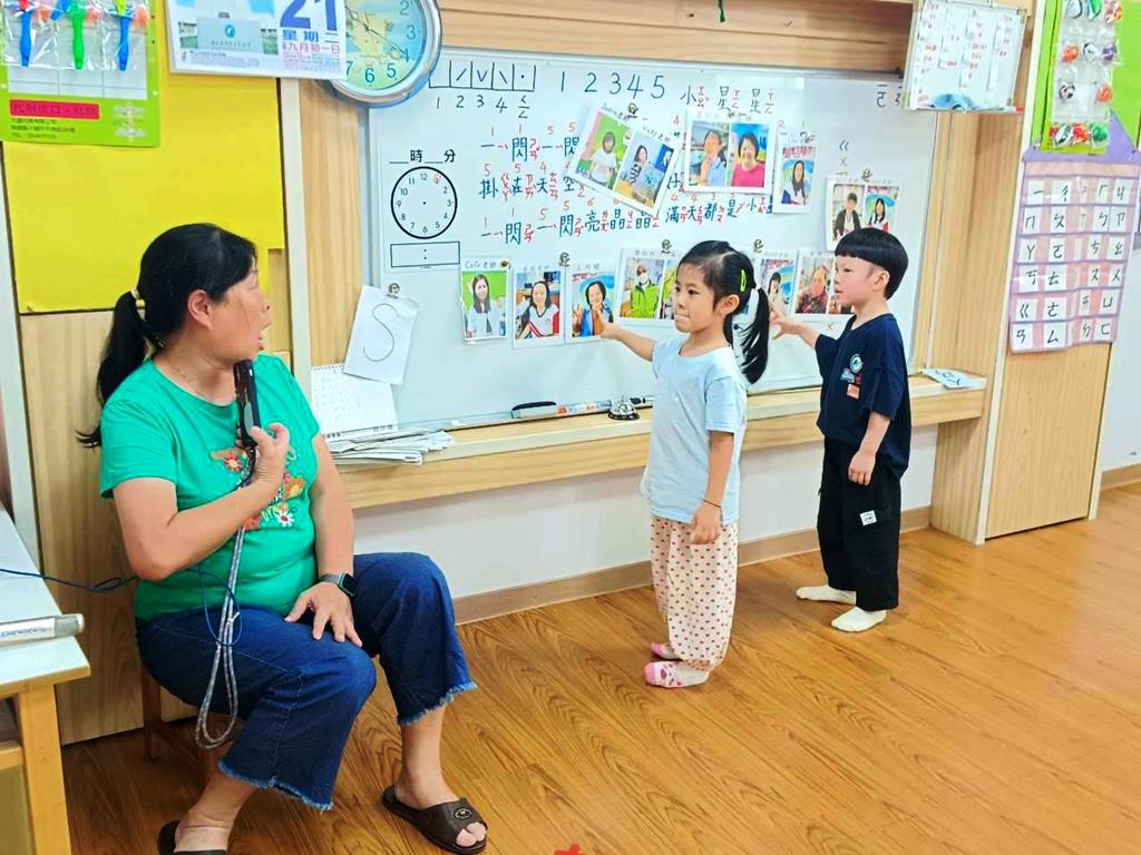 老師展示園內老師的照片,請孩子說說自己認識誰、知道她叫什麼名字。並分組進行聲音辨識遊戲〈老師說〉