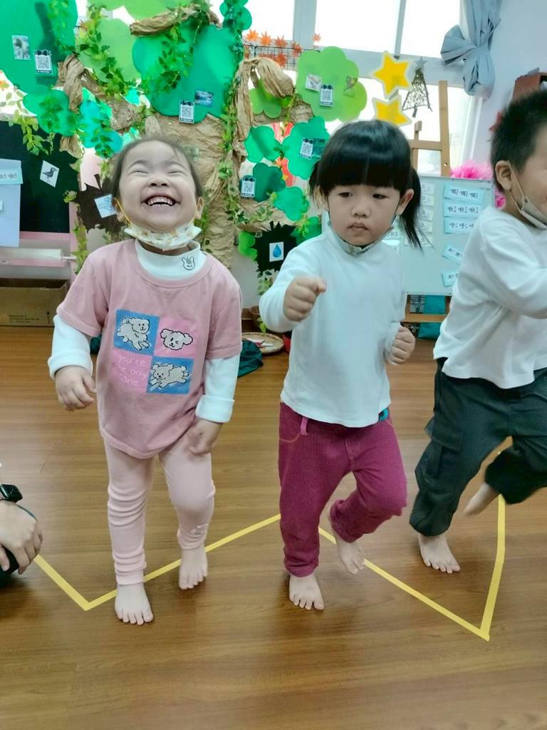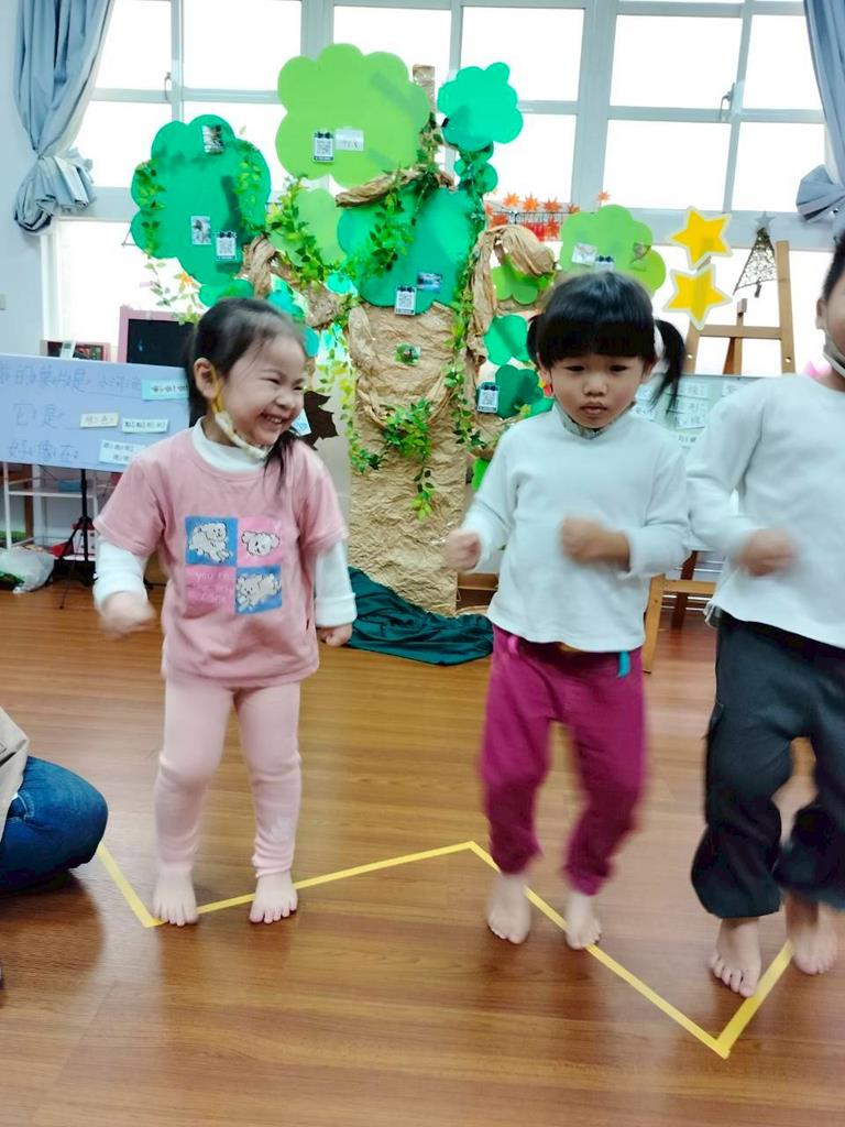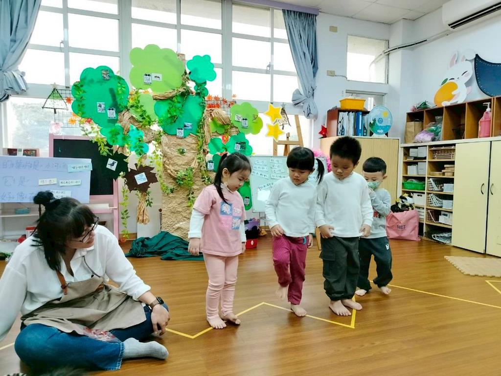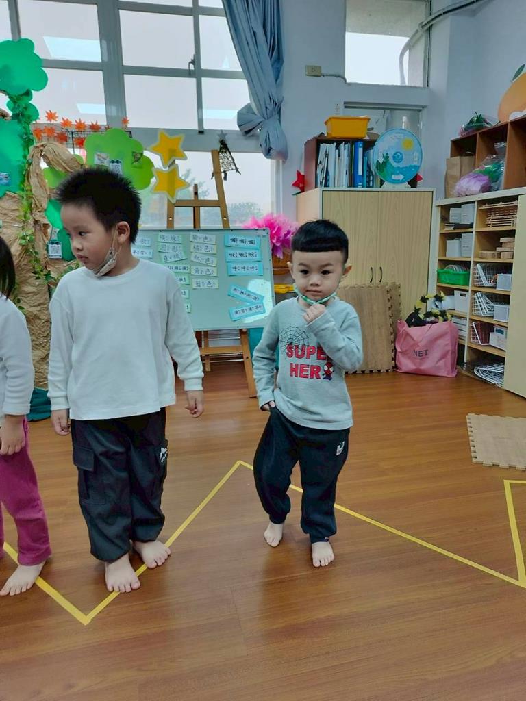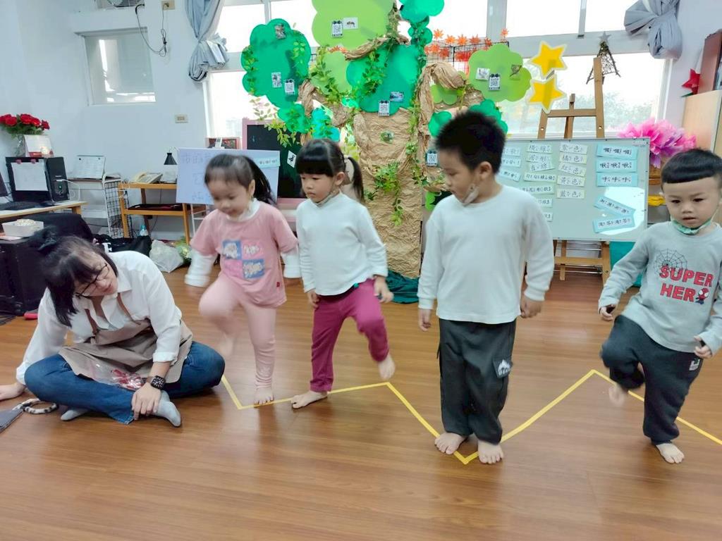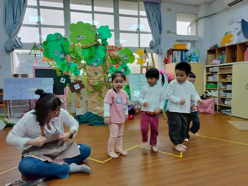老師撥放不同速度的音樂,讓孩子用小腳ㄚ走出,快快走 慢慢走 輕輕走 重重走節奏