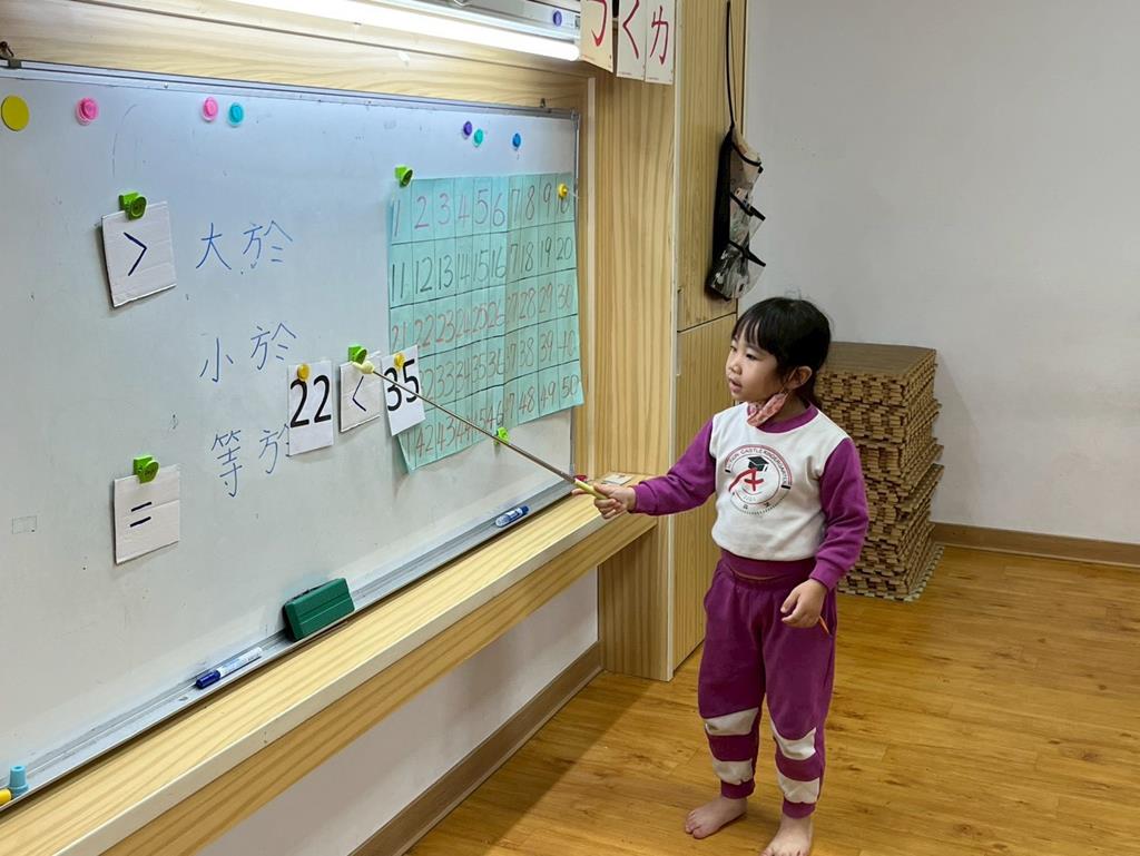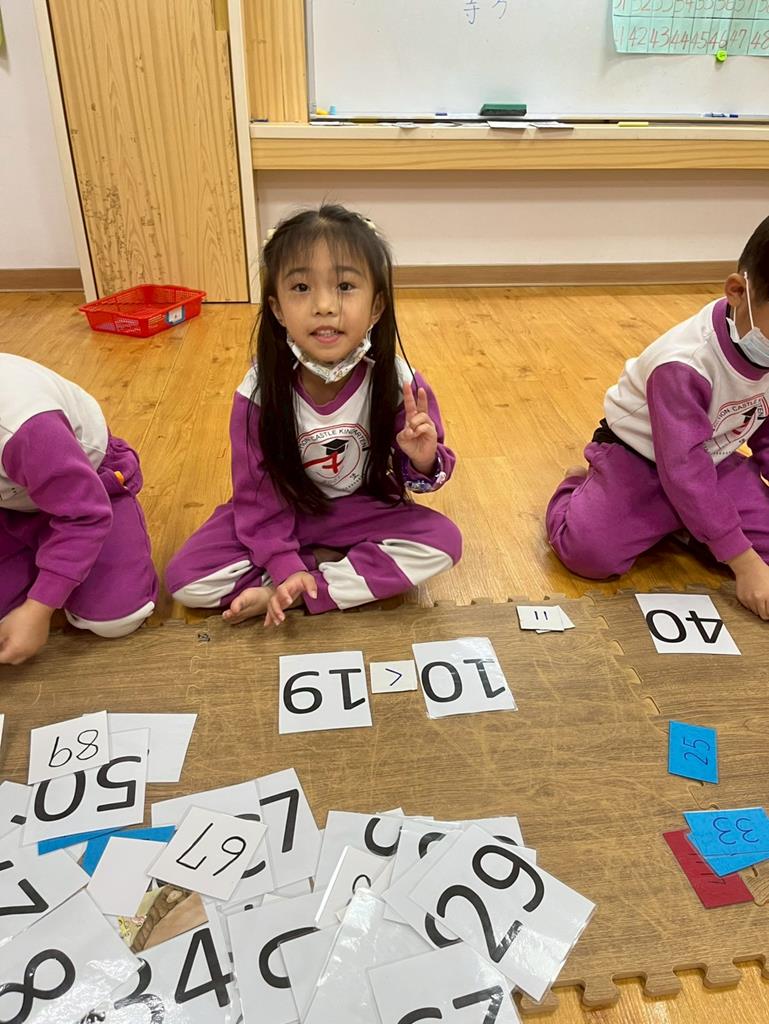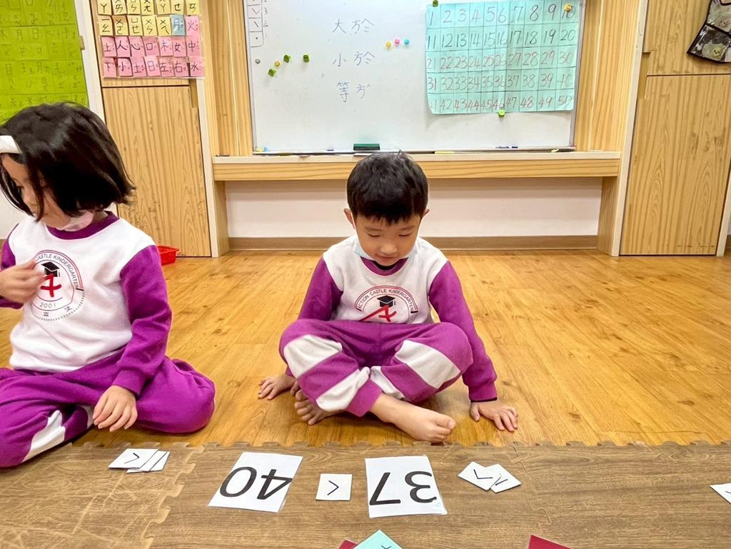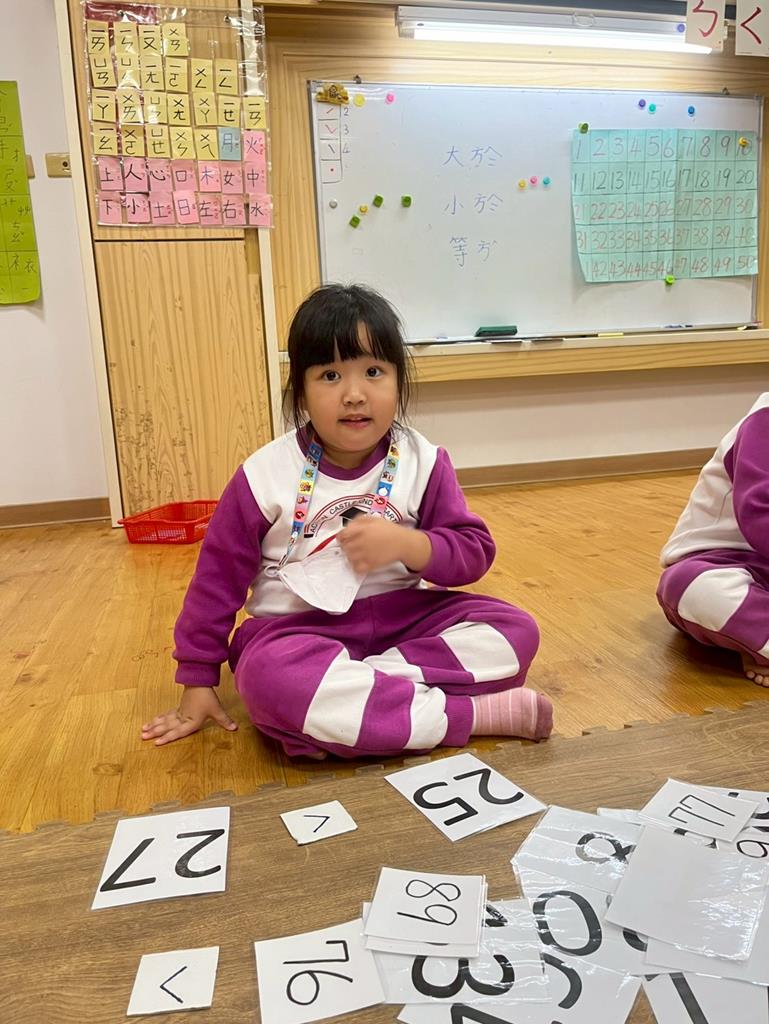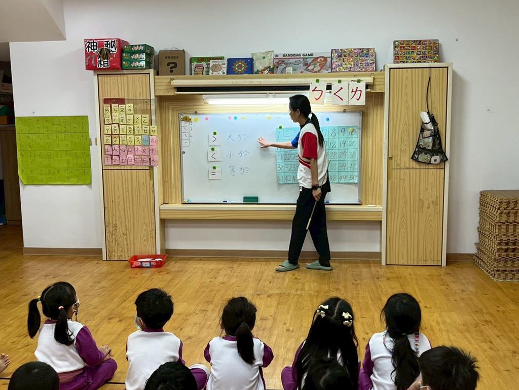 老師拿出數字卡,讓孩子熟悉數字的大小,並了解數學符號如何使用