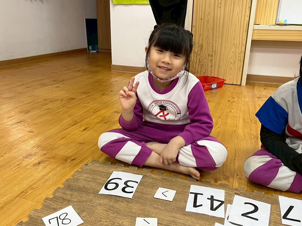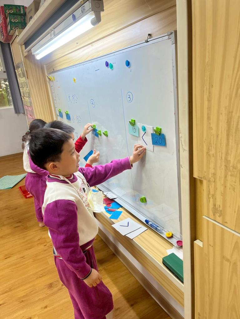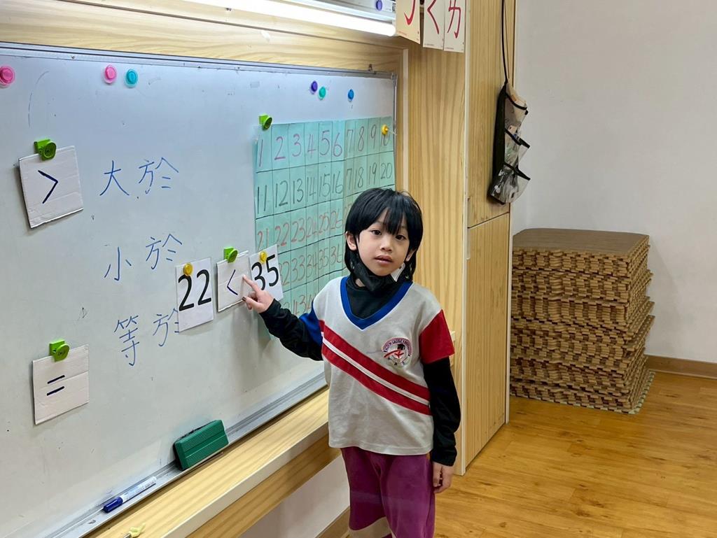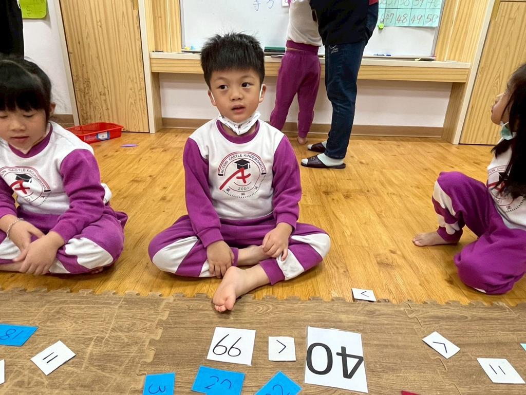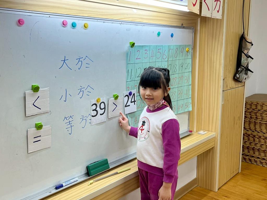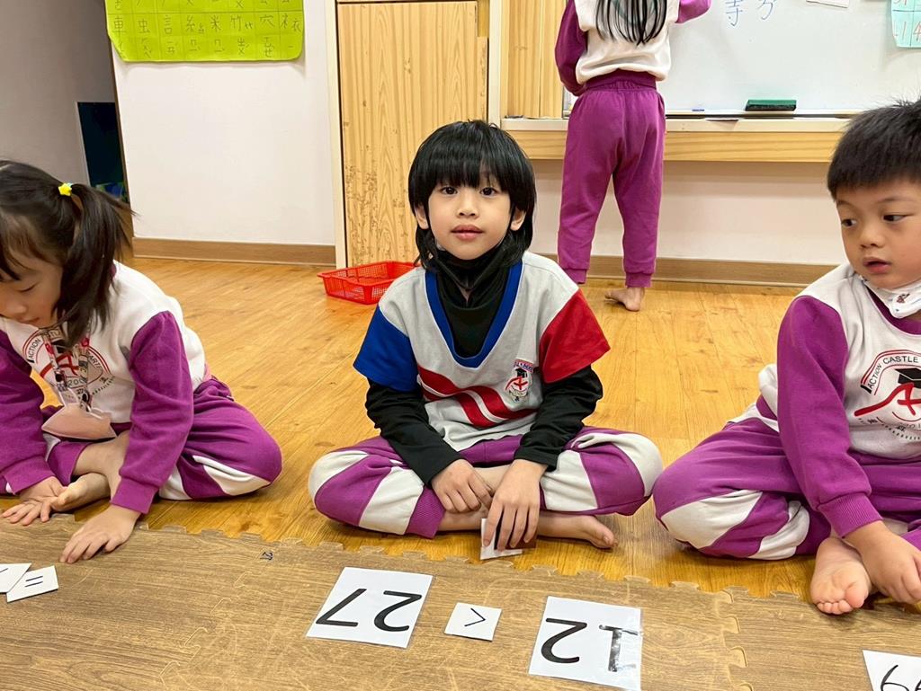 老師拿出數字卡,讓孩子熟悉數字的大小,並了解數學符號如何使用