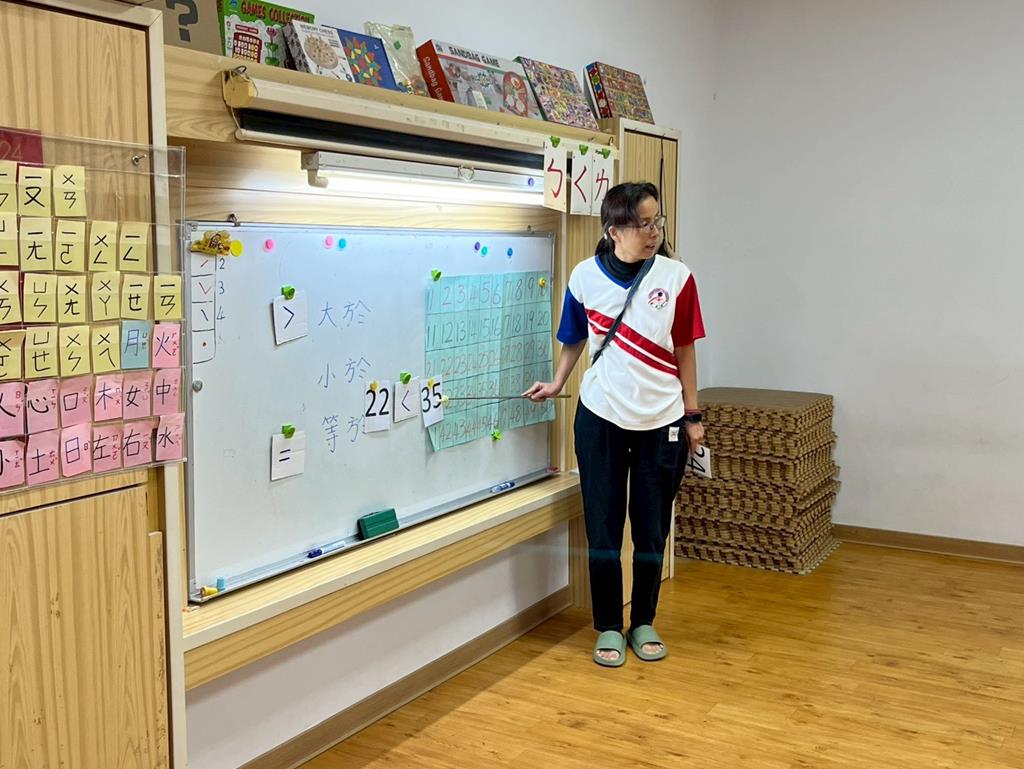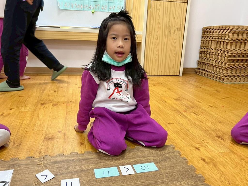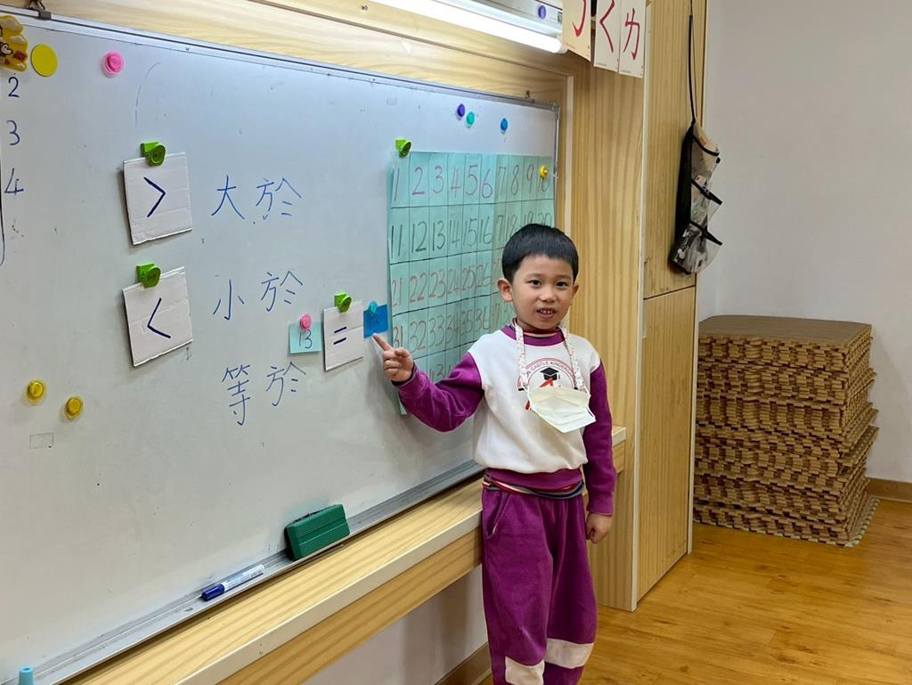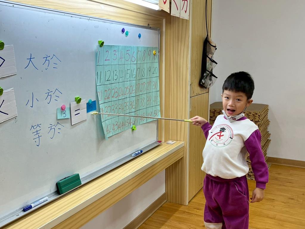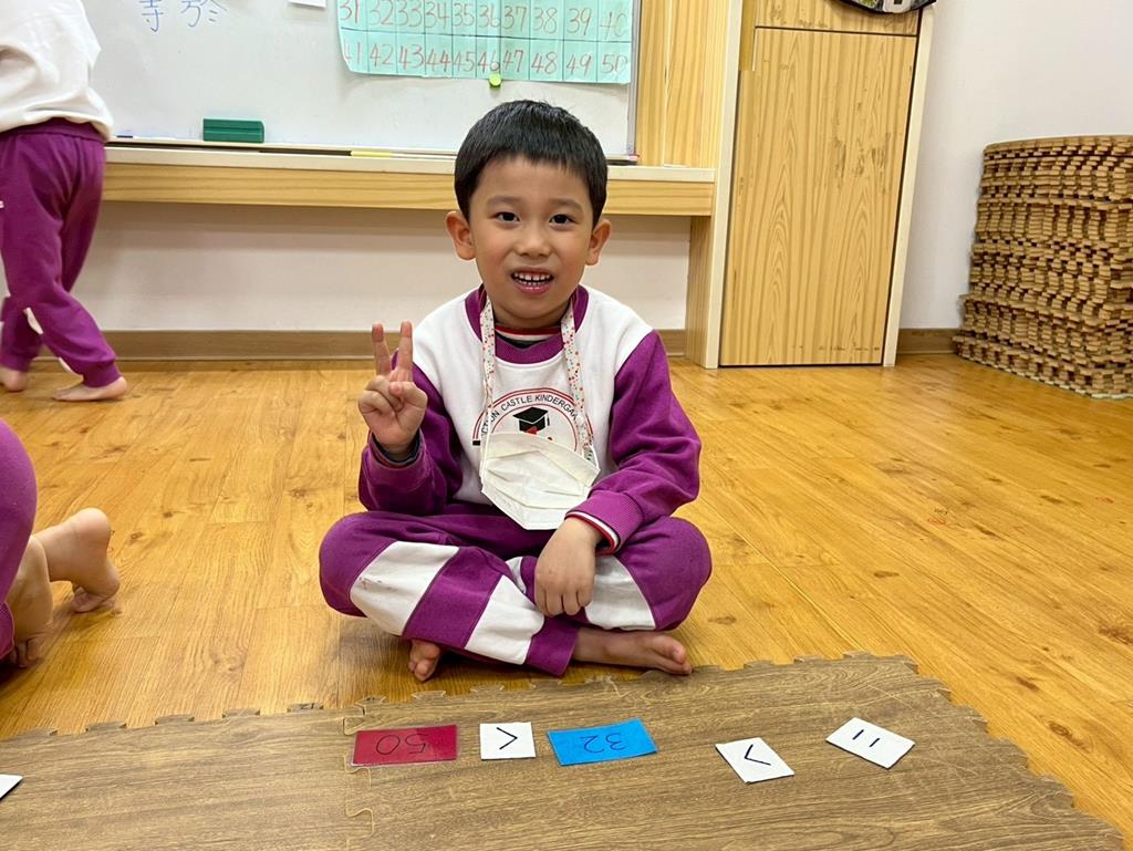 老師拿出數字卡,讓孩子熟悉數字的大小,並了解數學符號如何使用