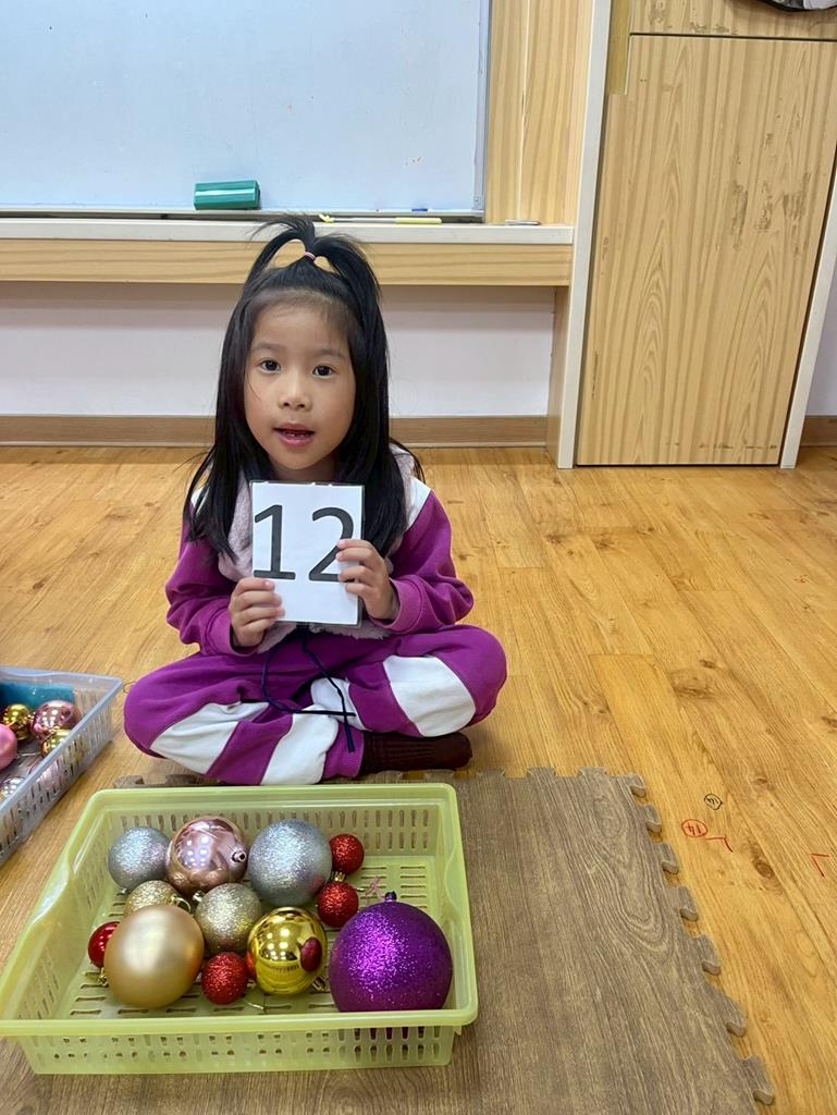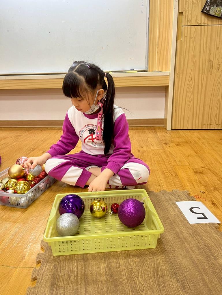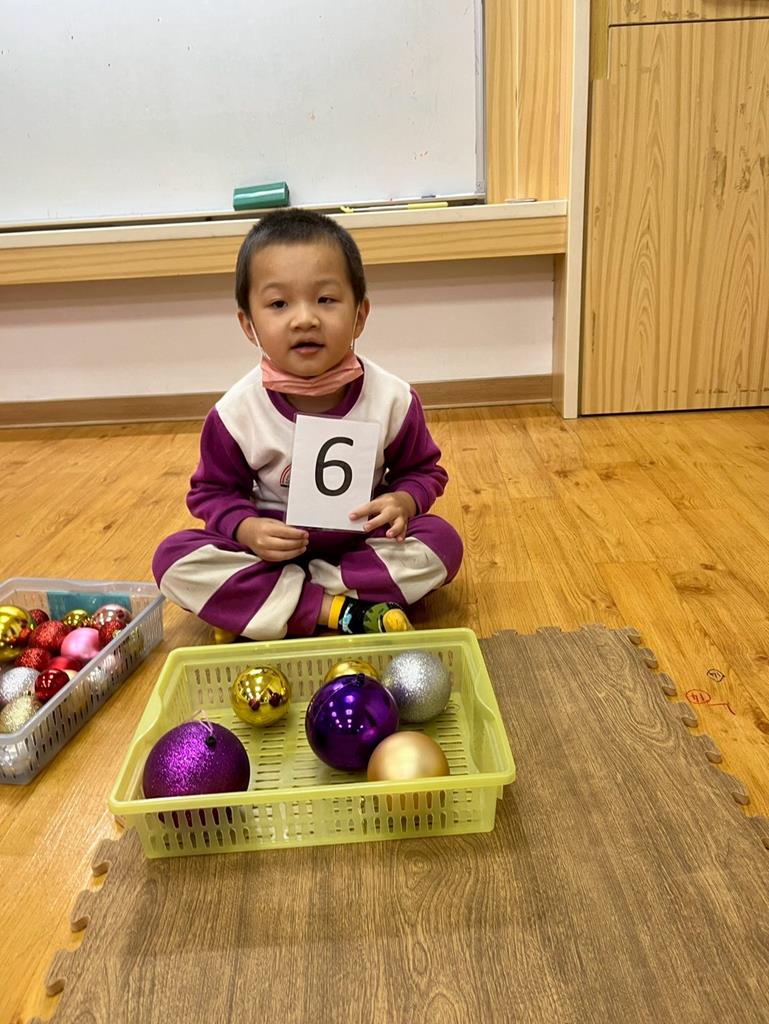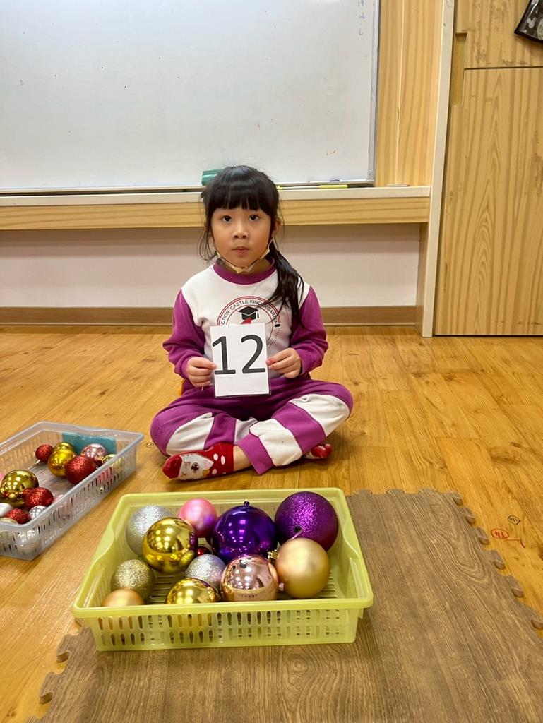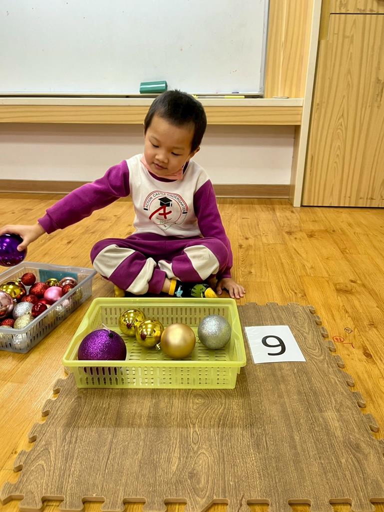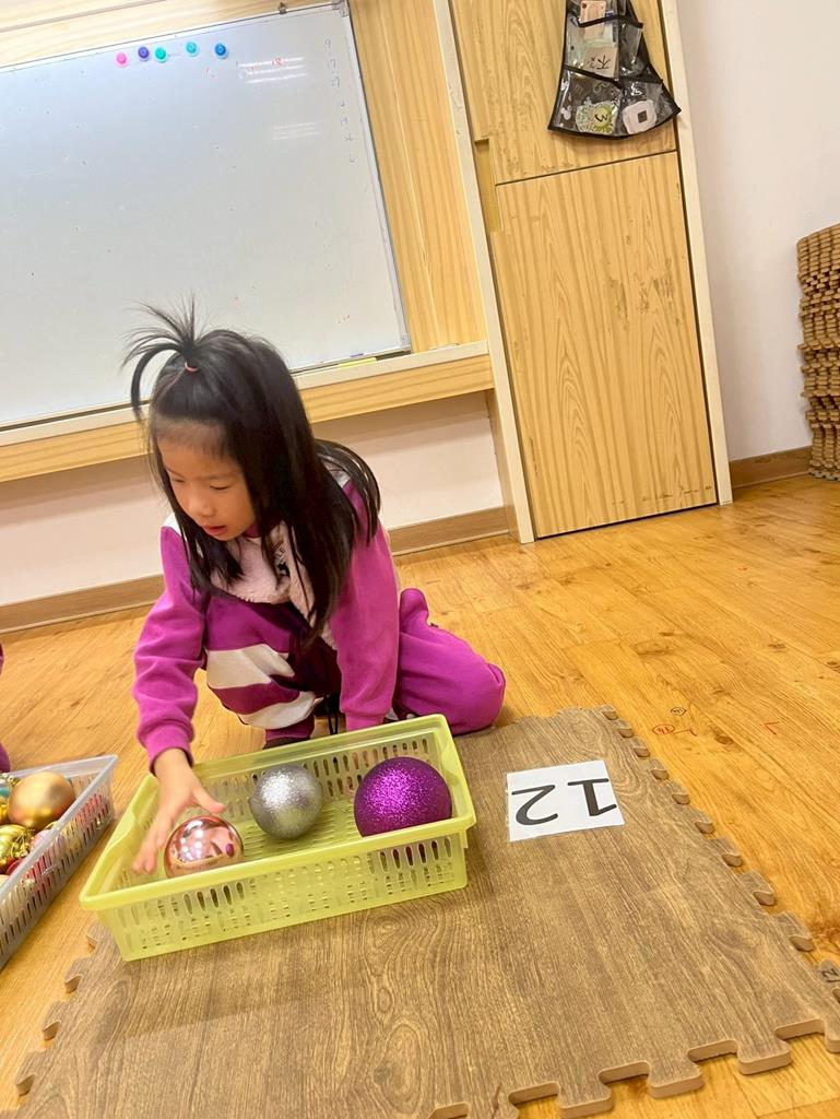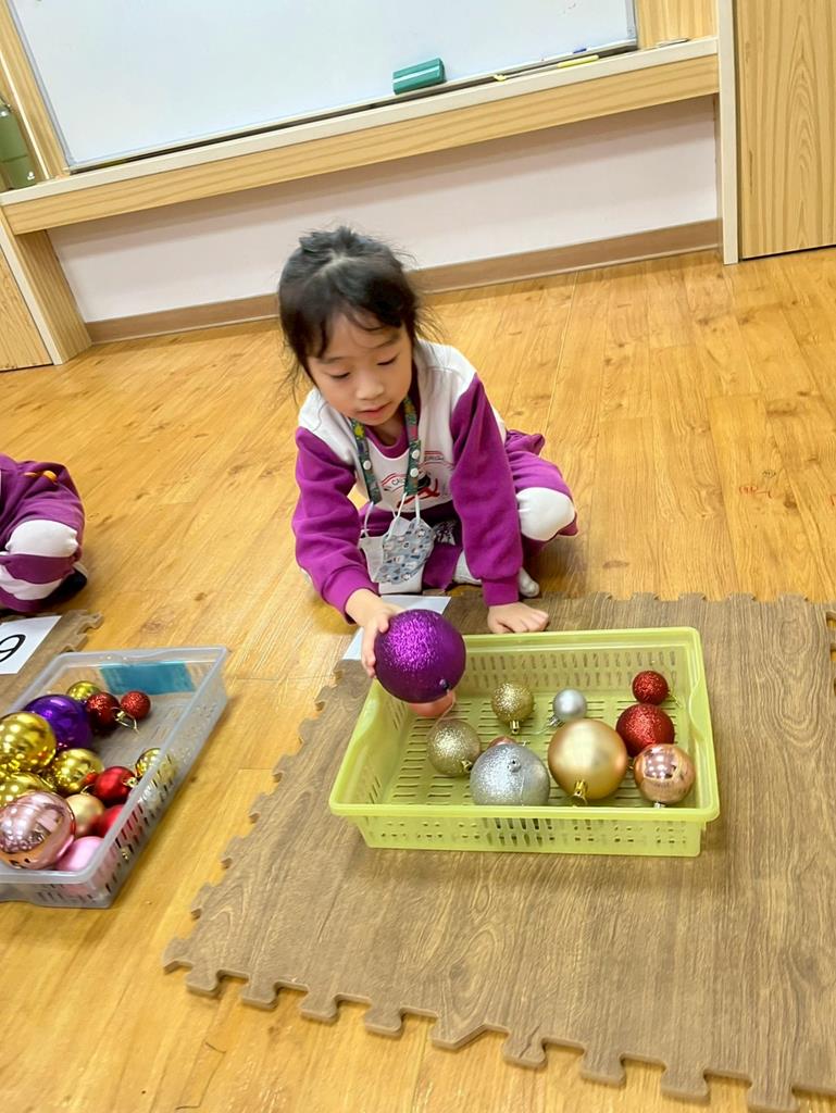 請孩子抽出一張數字卡,幫聖誕老人準備剛好數量的聖誕球放進籃子