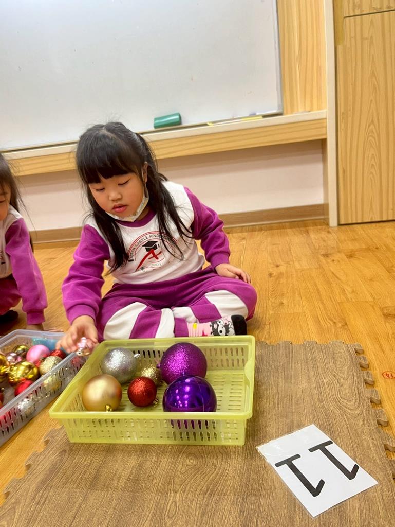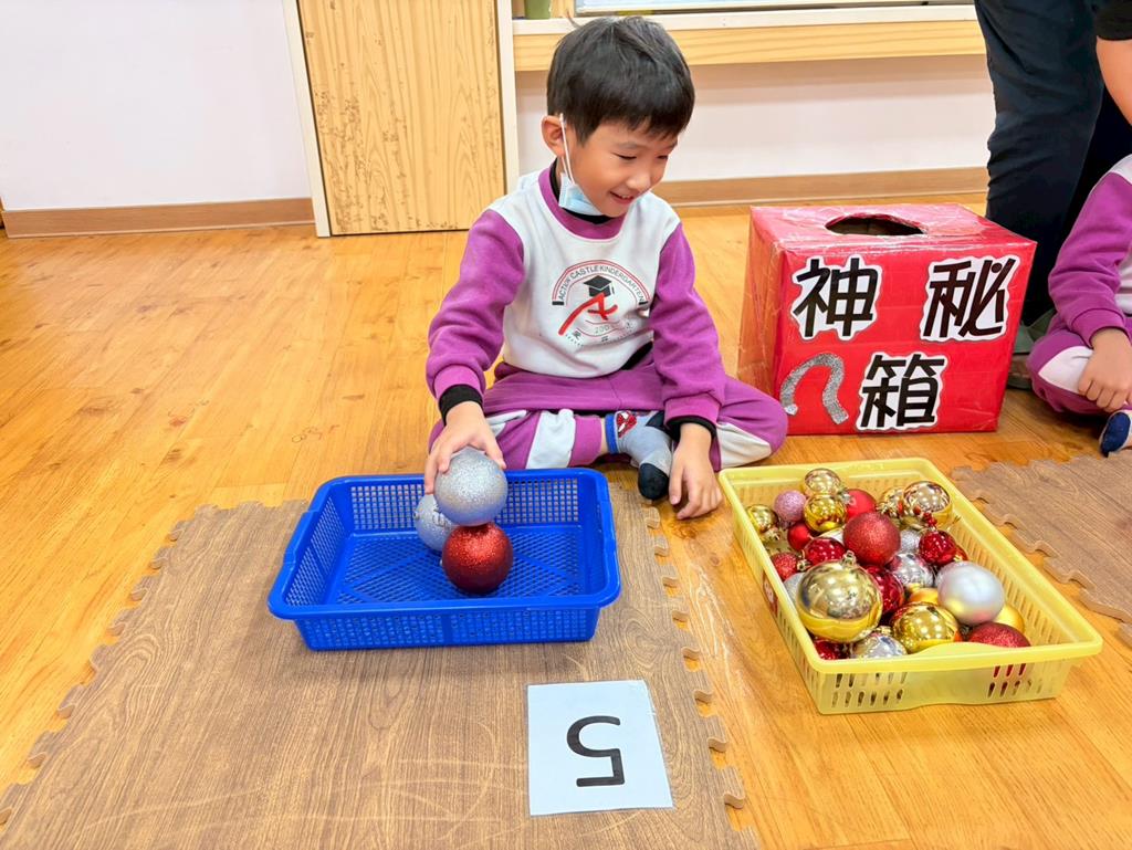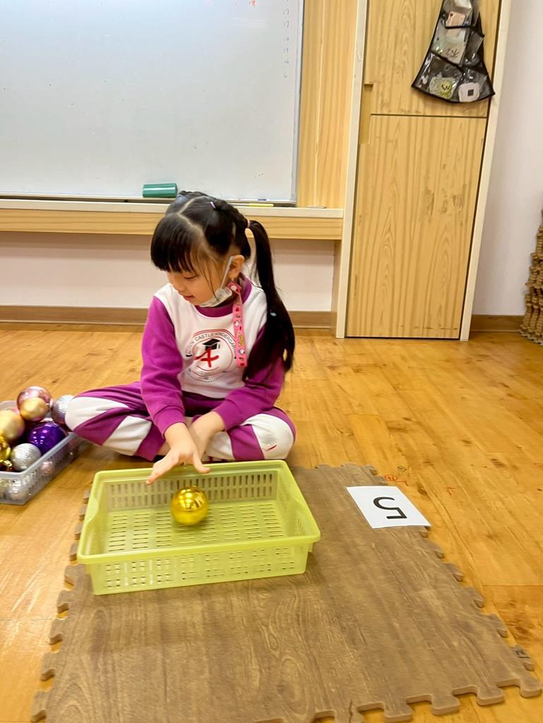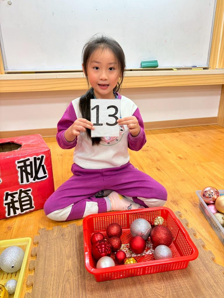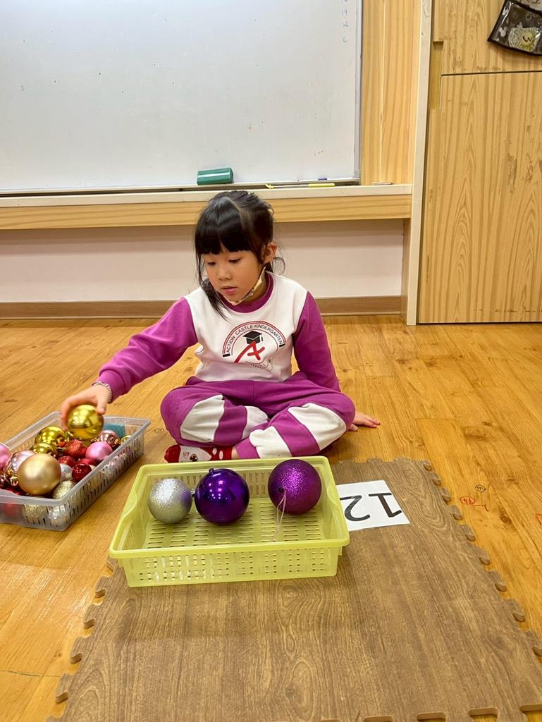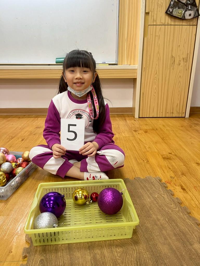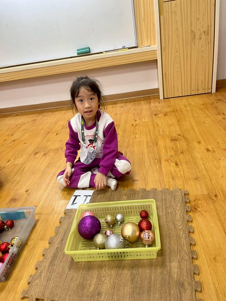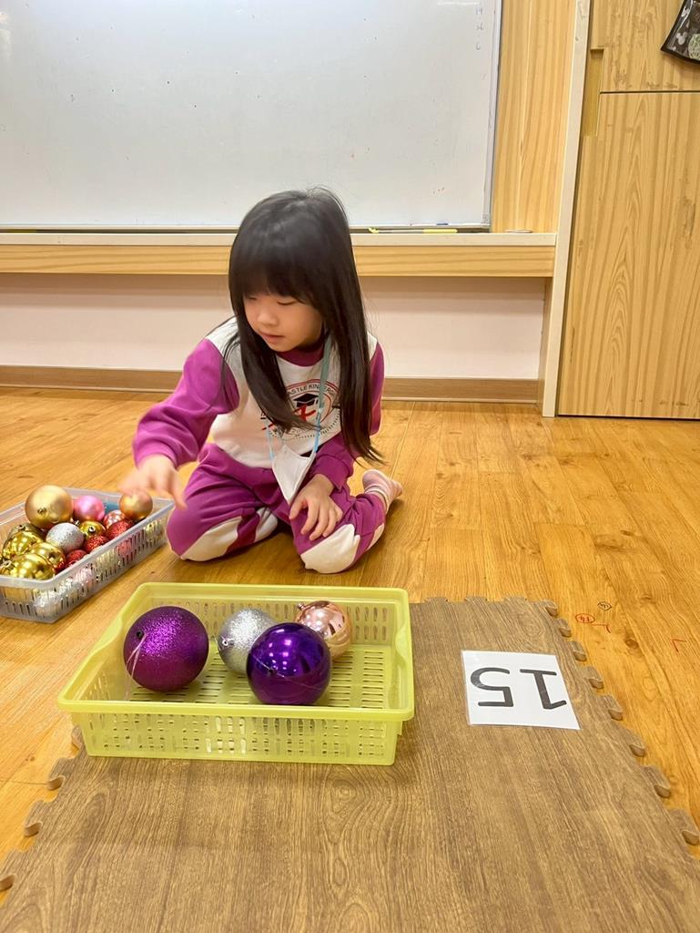 請孩子抽出一張數字卡,幫聖誕老人準備剛好數量的聖誕球放進籃子