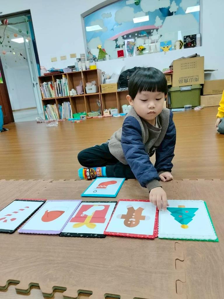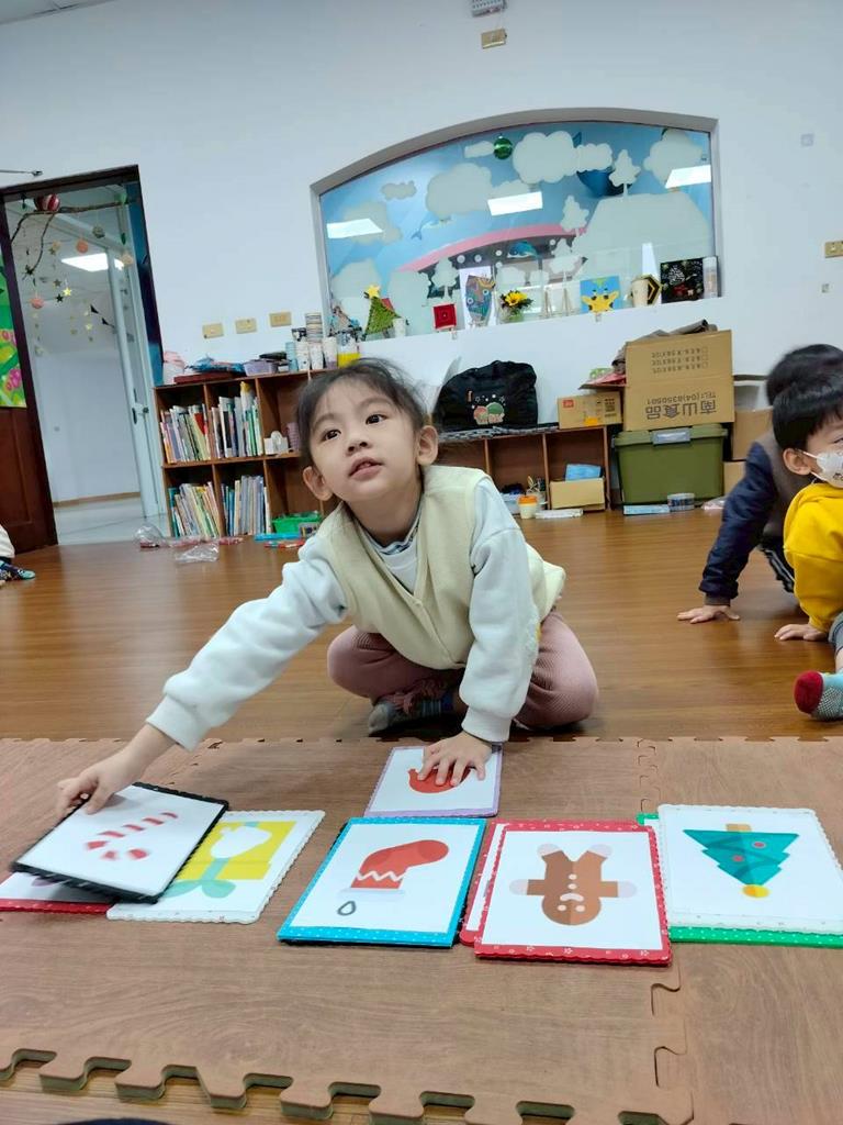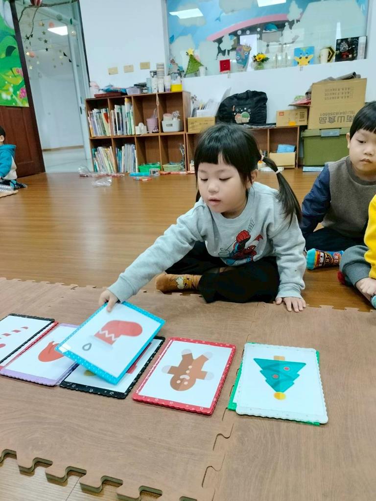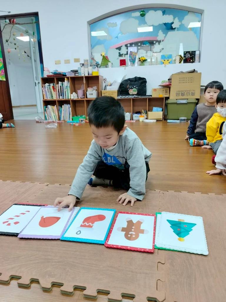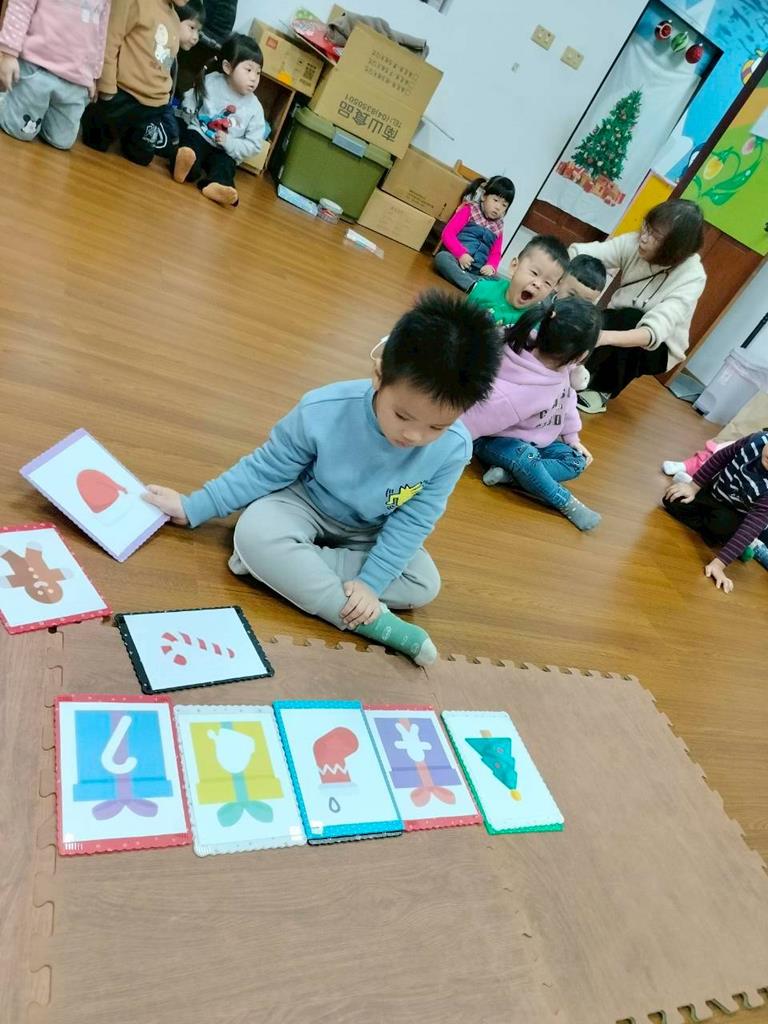 邀請孩子觀察禮物盒上的形狀 顏色,找出相同的聖誕物品