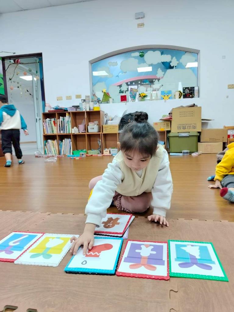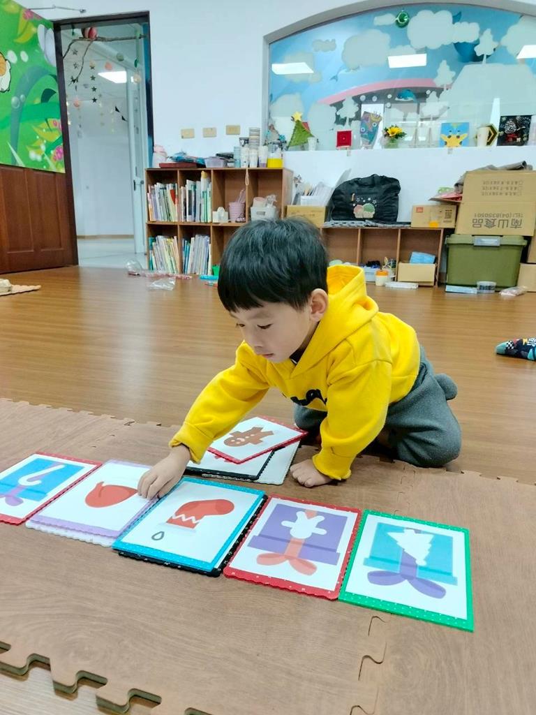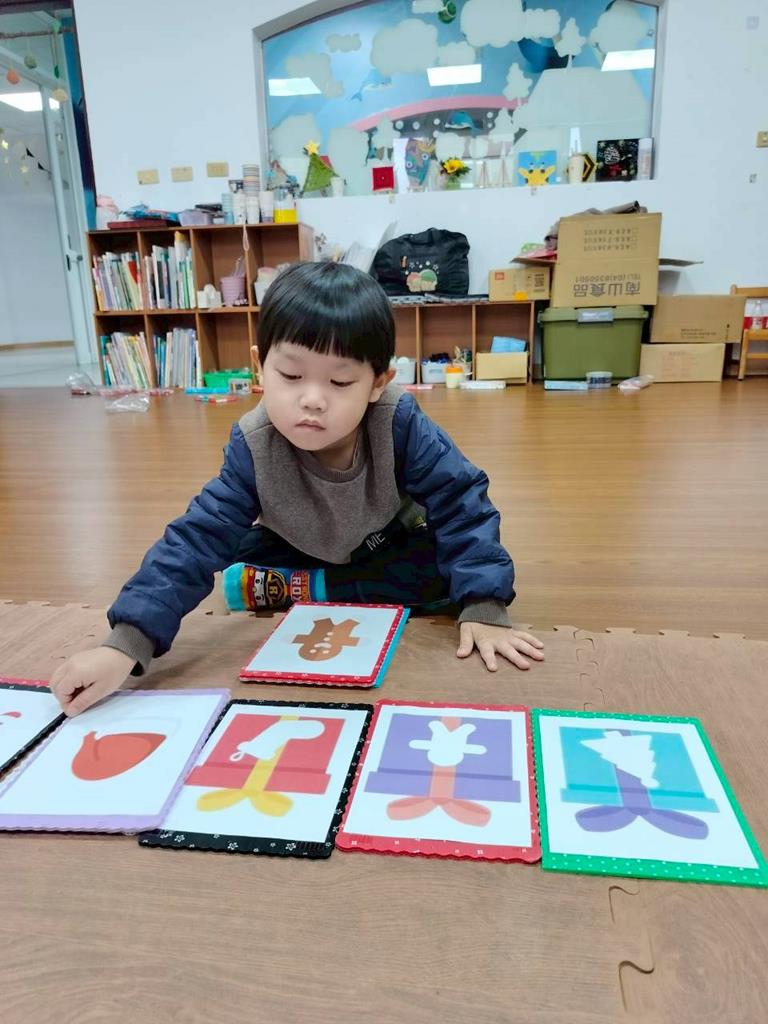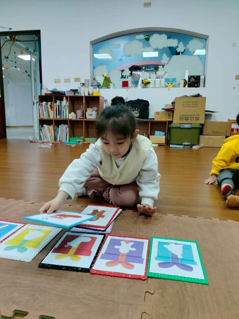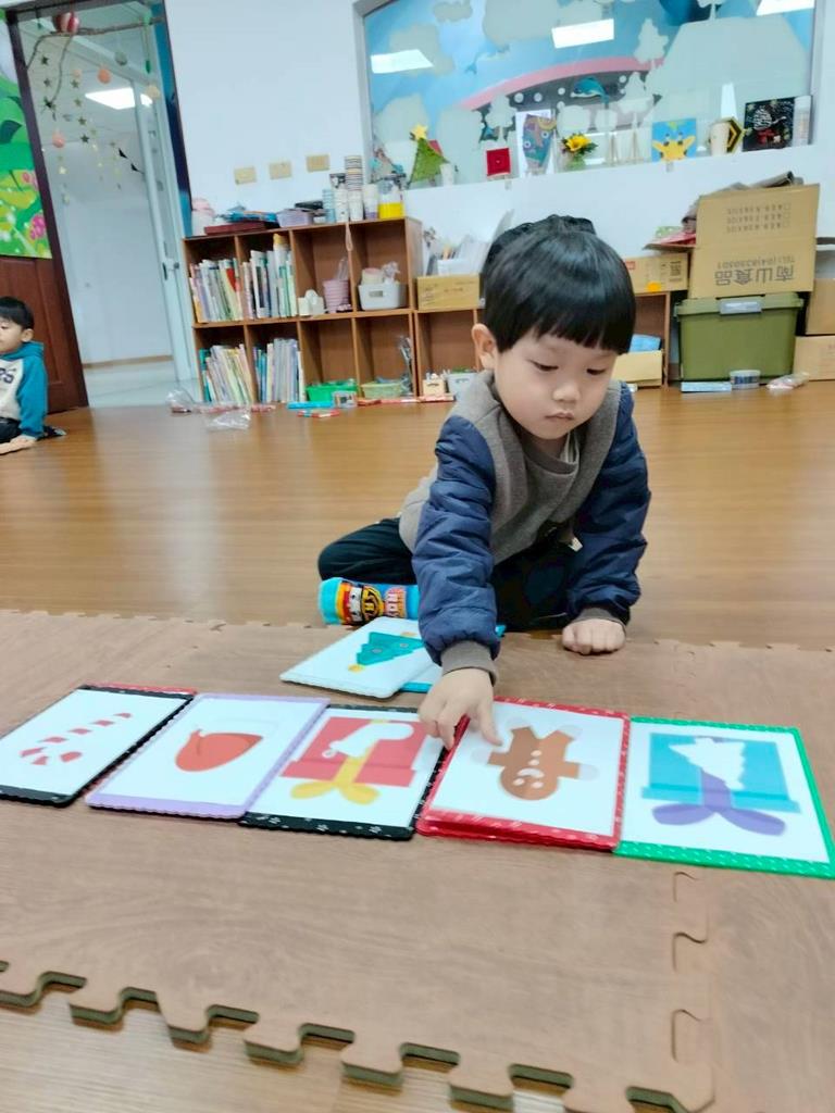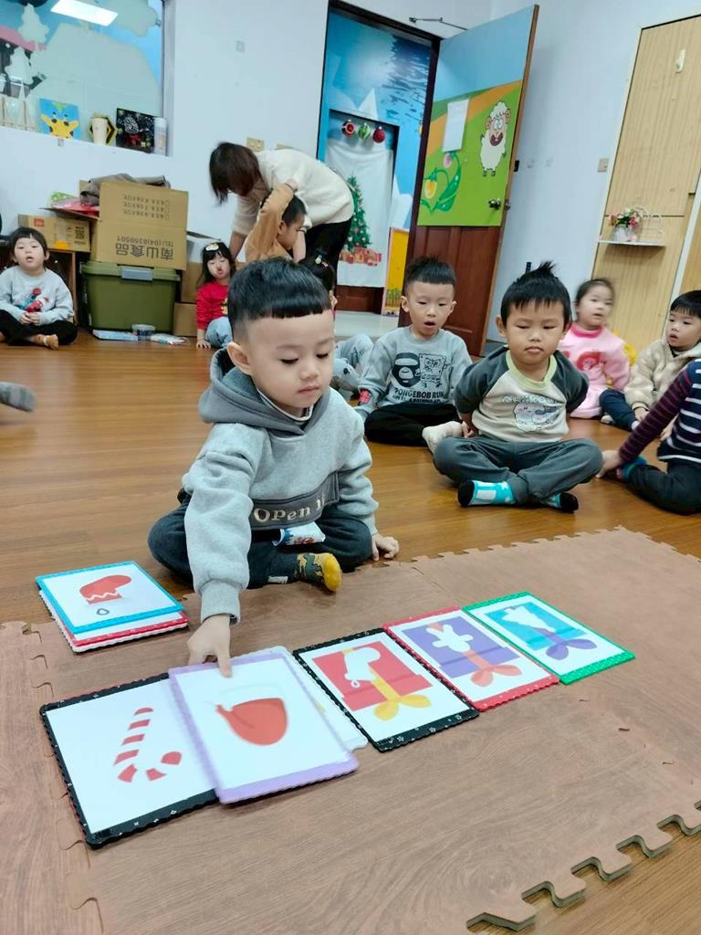 邀請孩子觀察禮物盒上的形狀 顏色,找出相同的聖誕物品