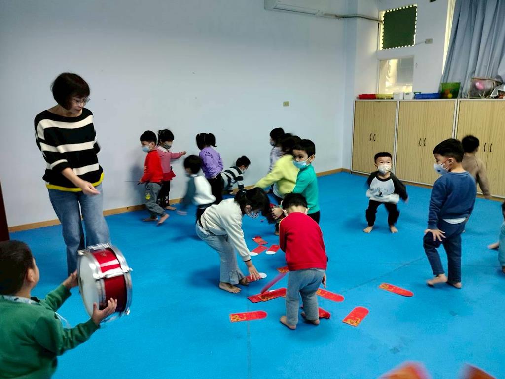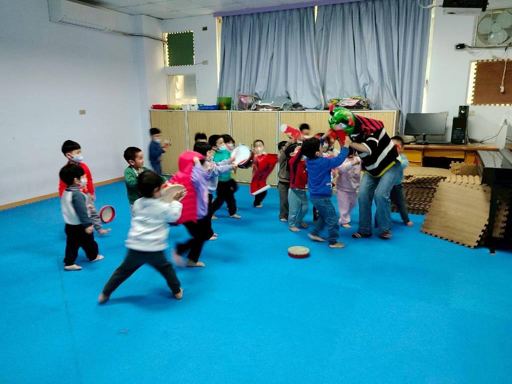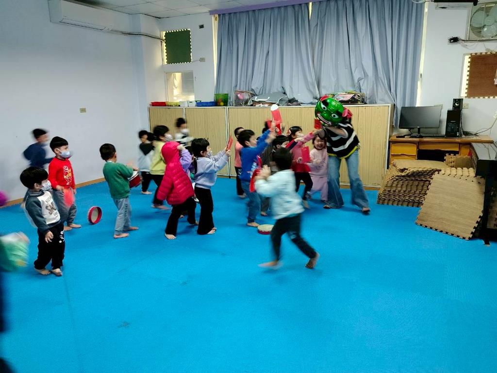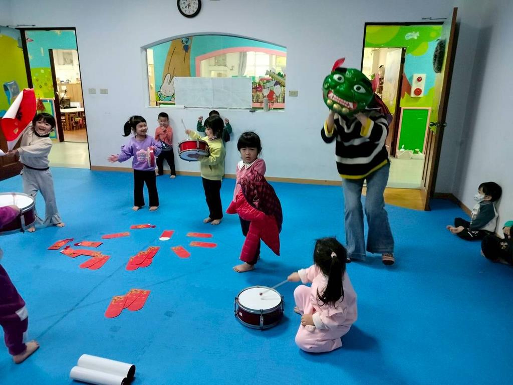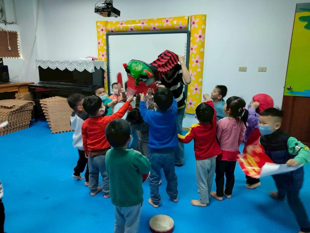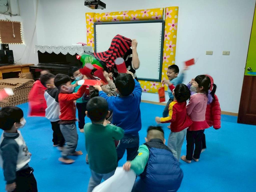 老師帶孩子回顧年獸最害怕的3樣,紅色 聲音 亮光,帶領幼兒進行一場趕年獸的遊戲