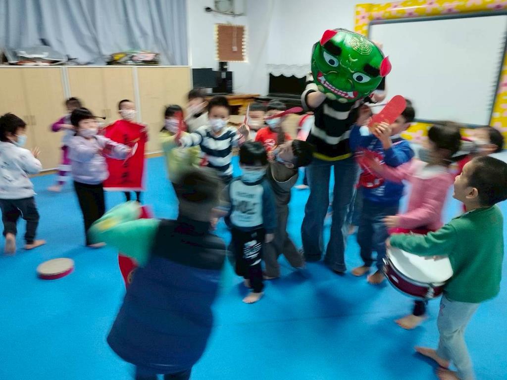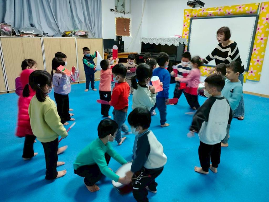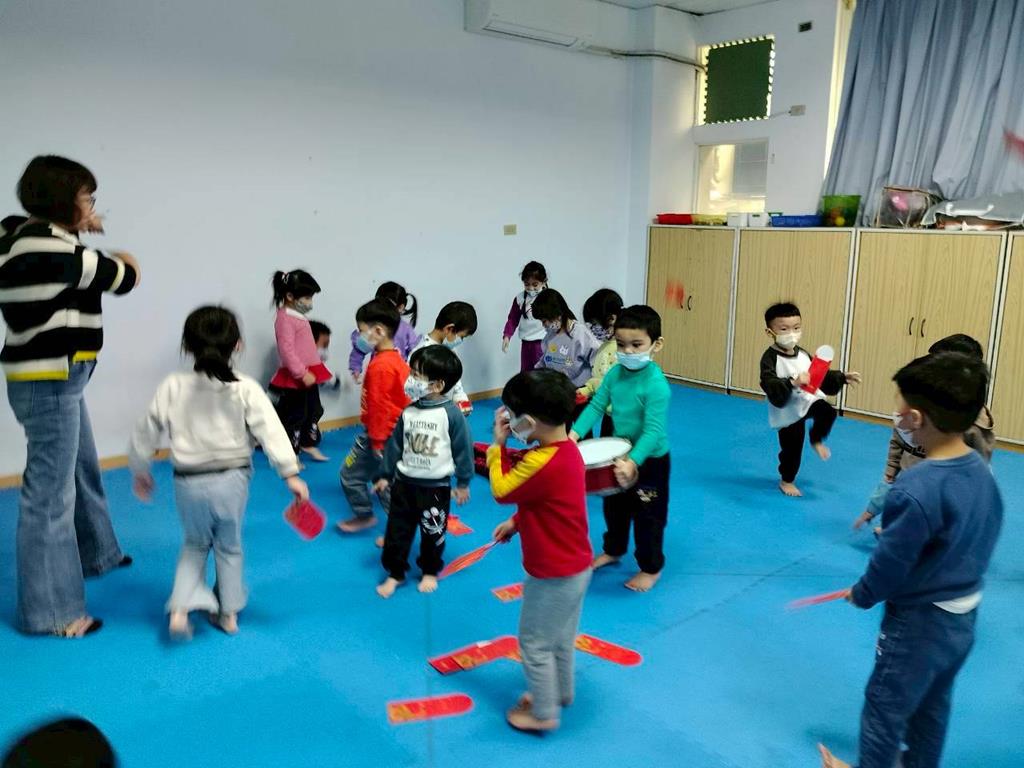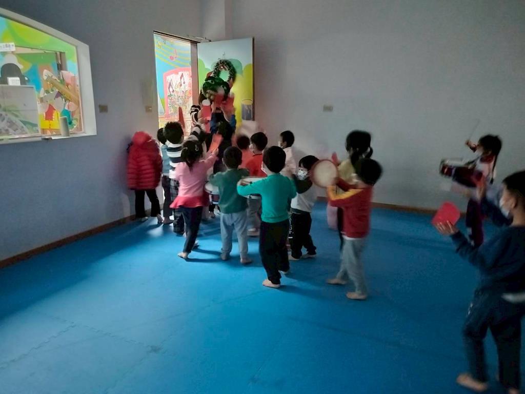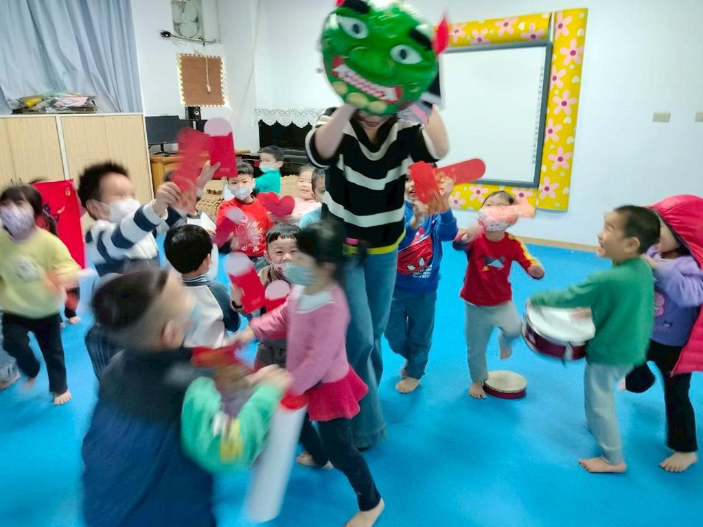 老師帶孩子回顧年獸最害怕的3樣,紅色 聲音 亮光,帶領幼兒進行一場趕年獸的遊戲