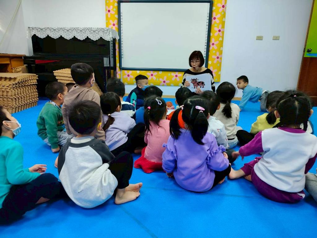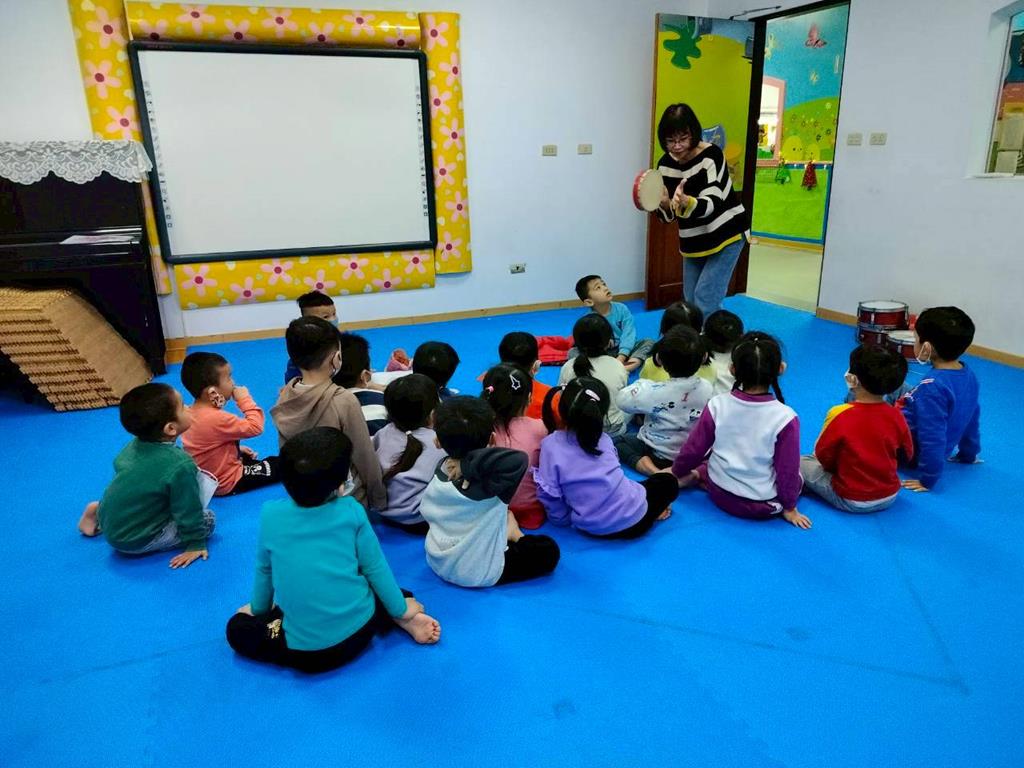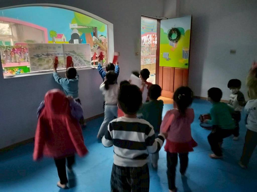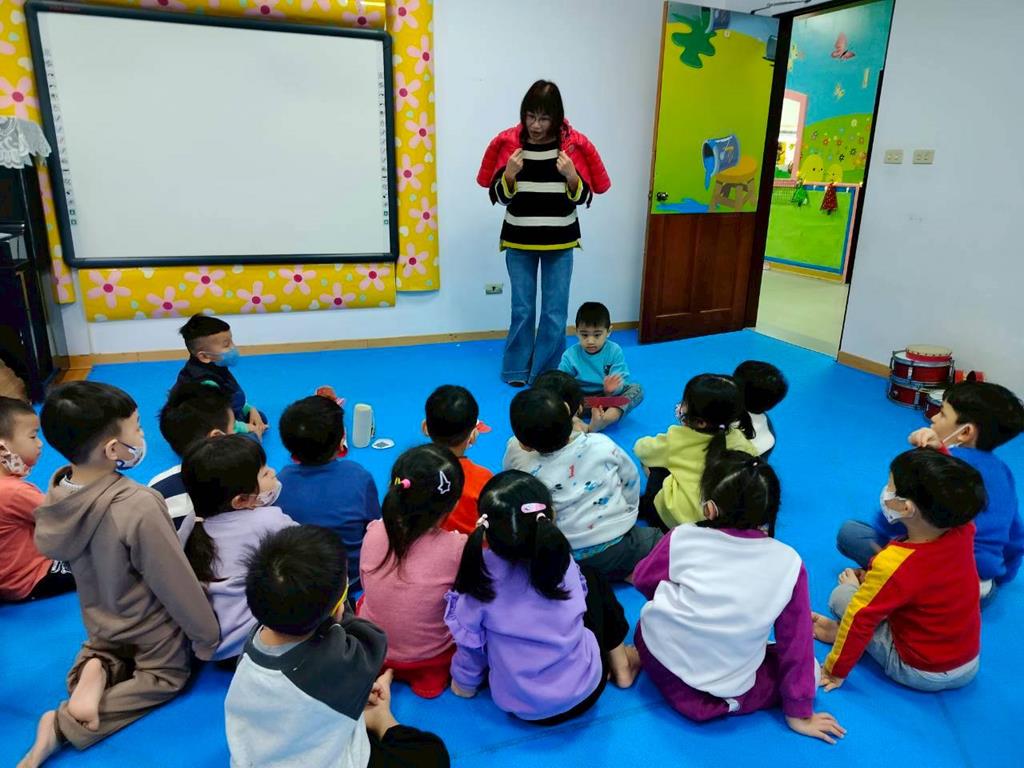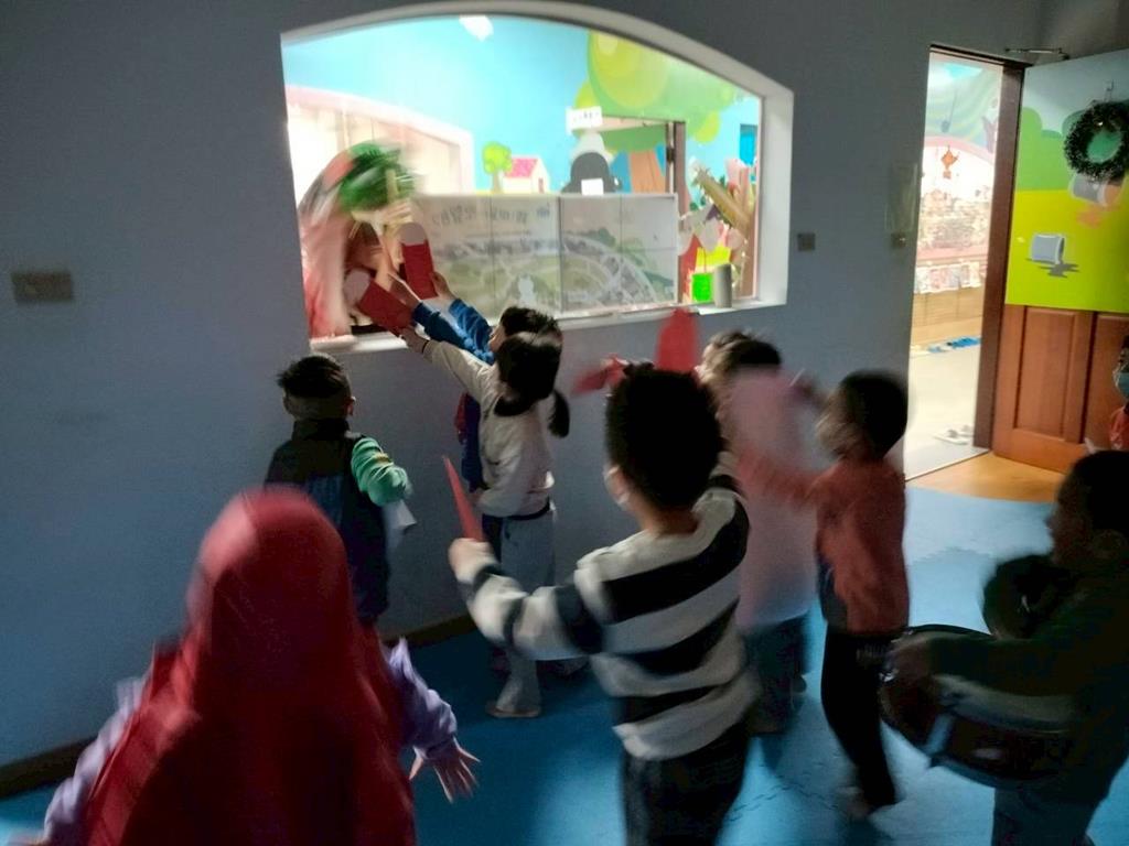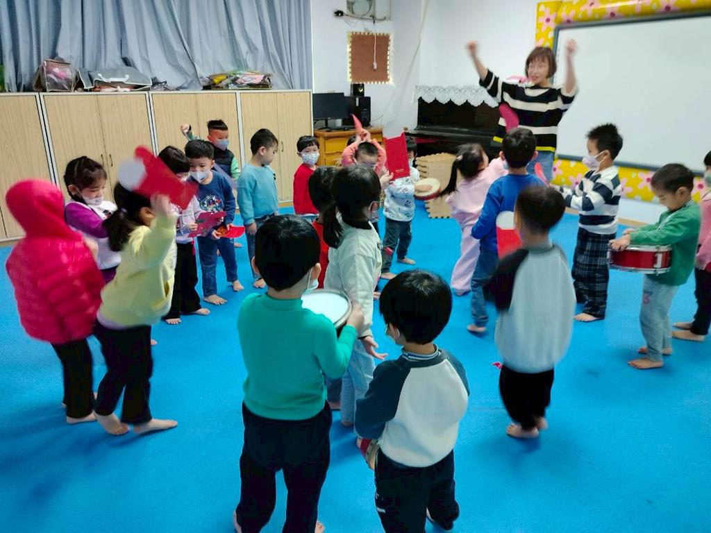 老師帶孩子回顧年獸最害怕的3樣,紅色 聲音 亮光,帶領幼兒進行一場趕年獸的遊戲