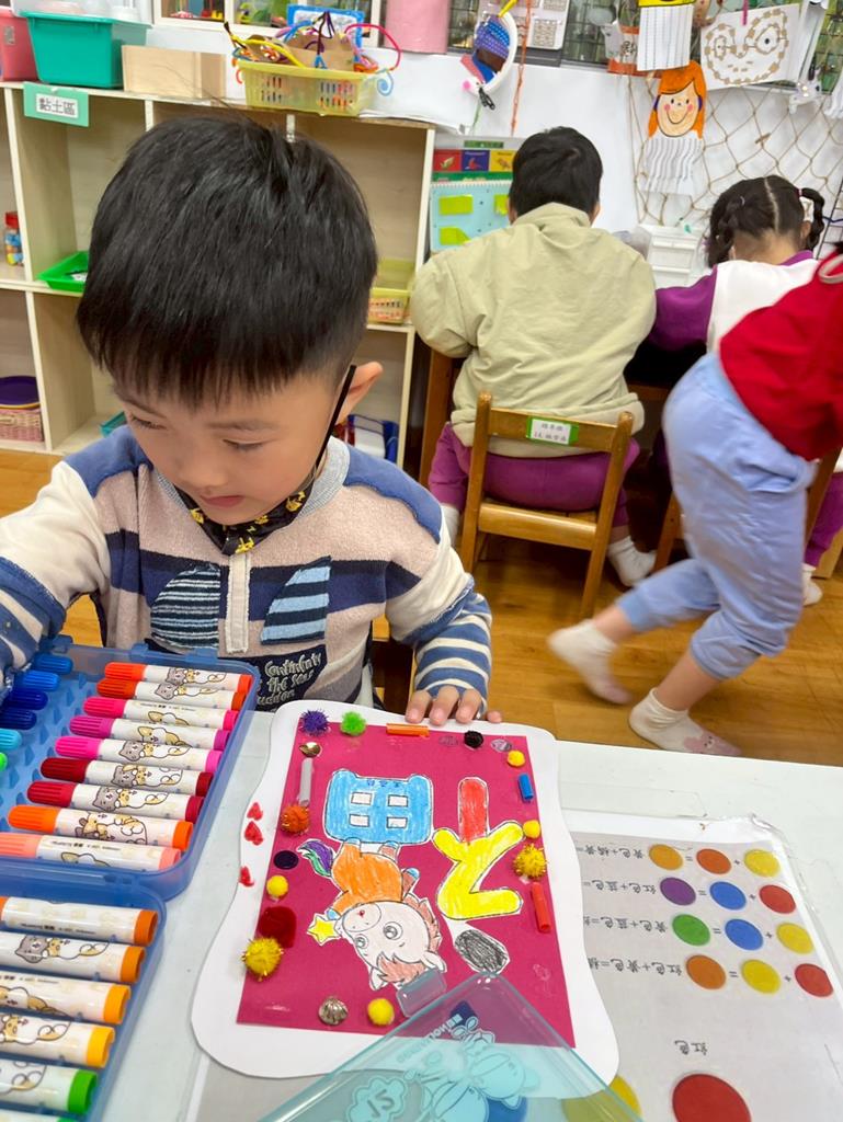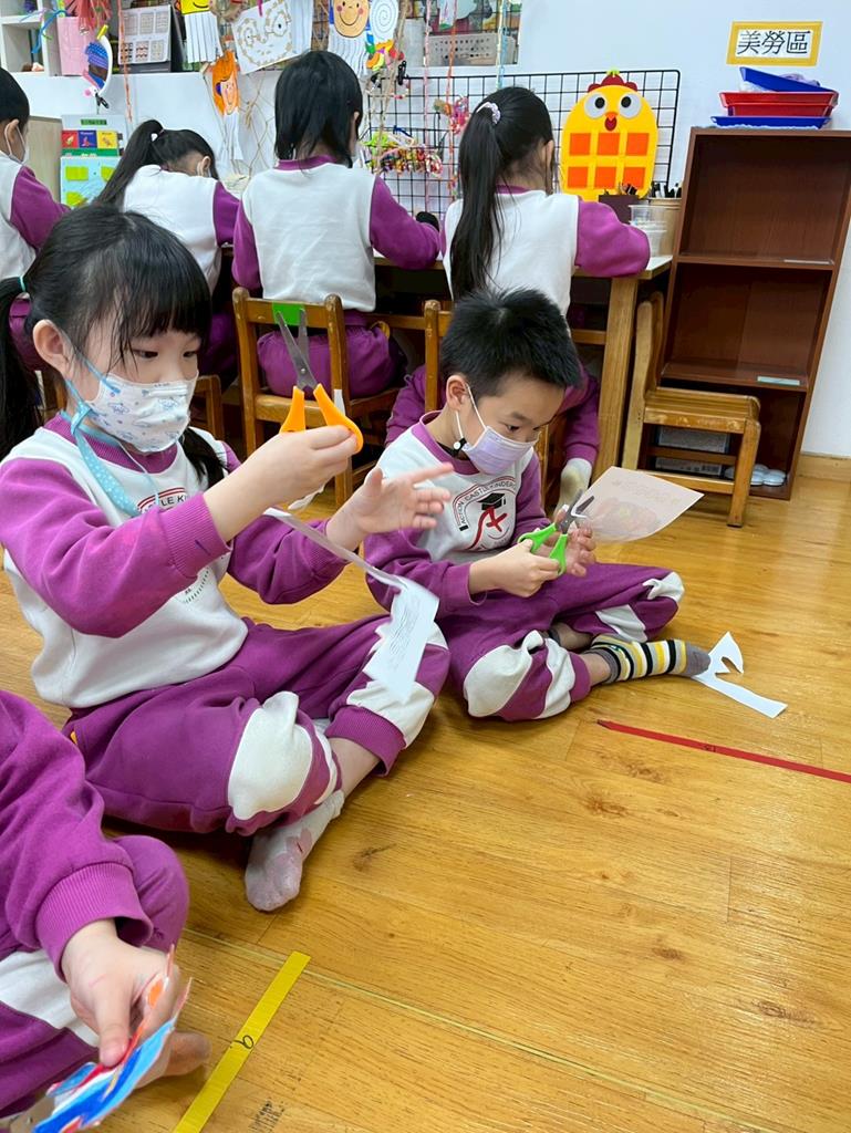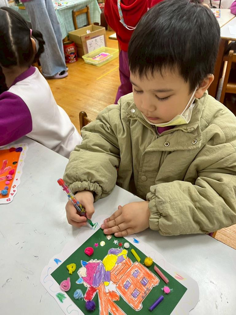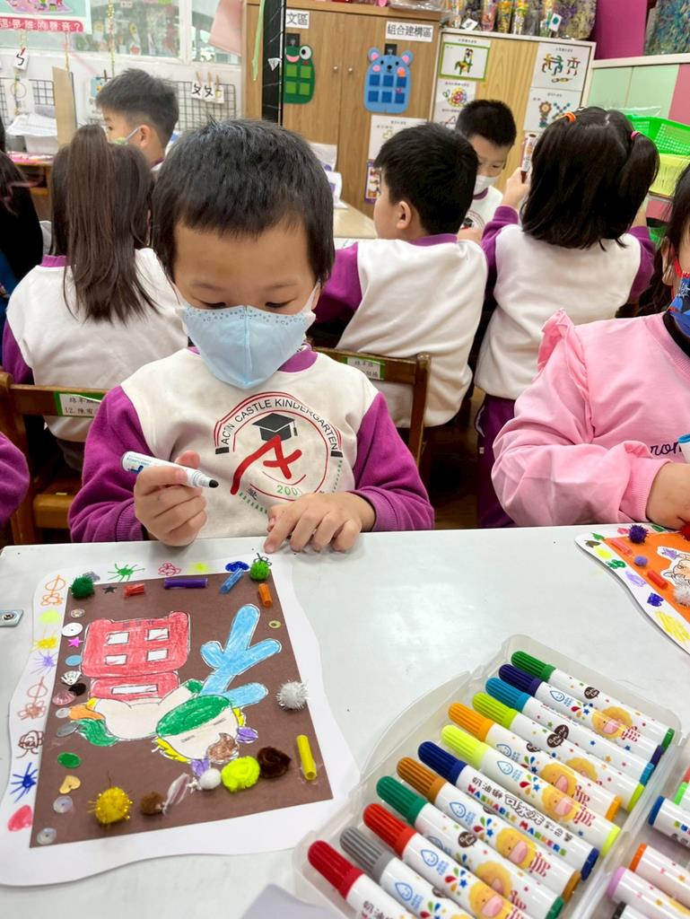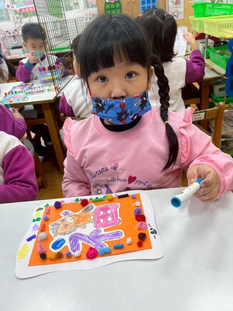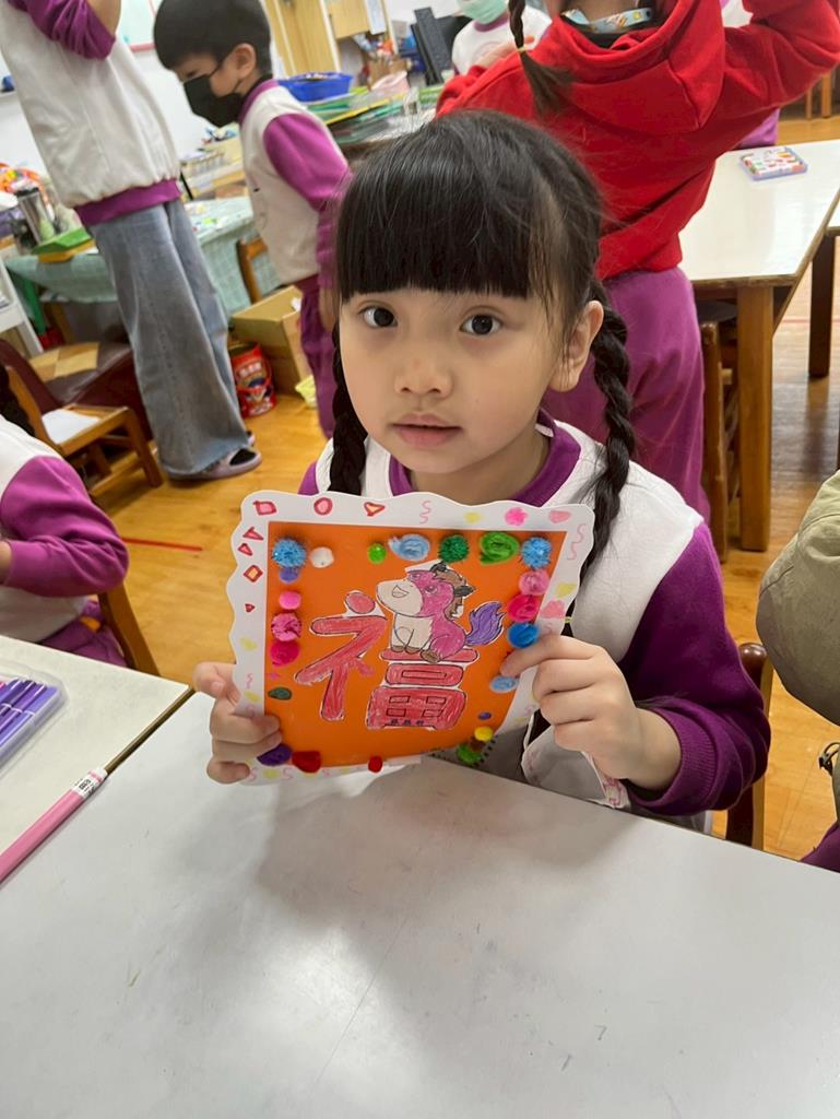與孩子分享過年布置,並邀請孩子一起製作~馬來福的吊飾布置教室走廊