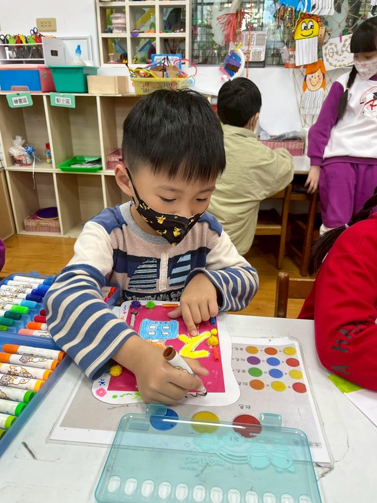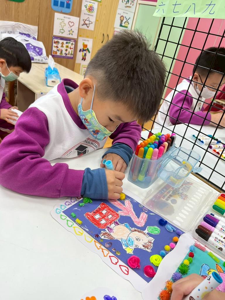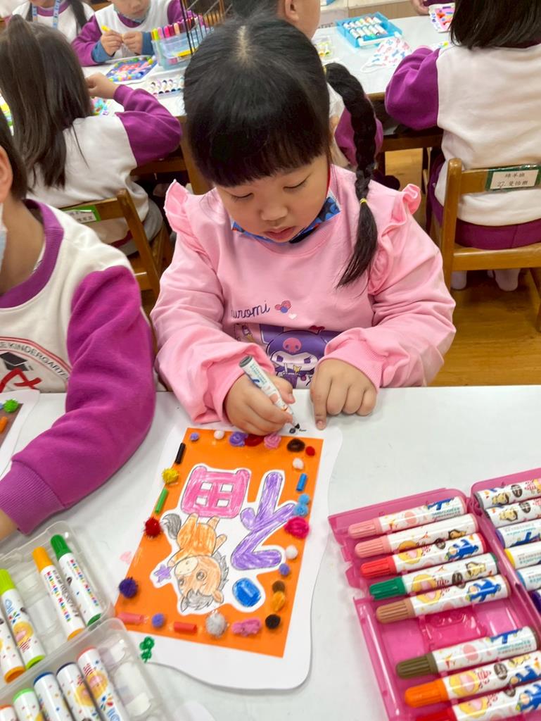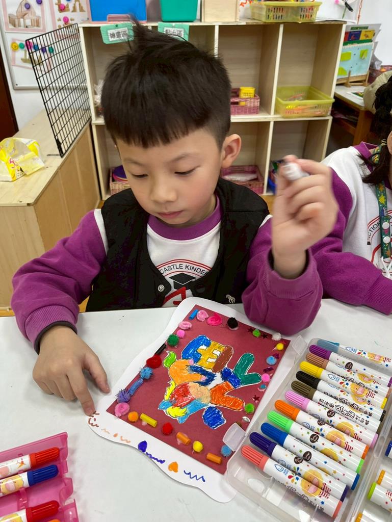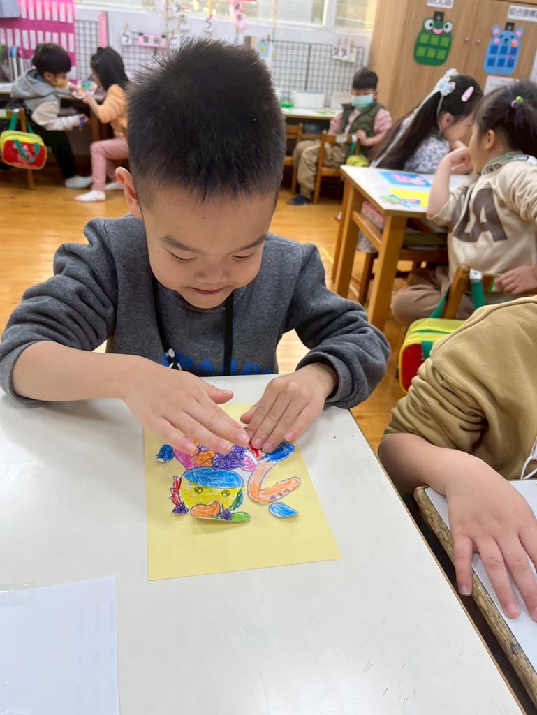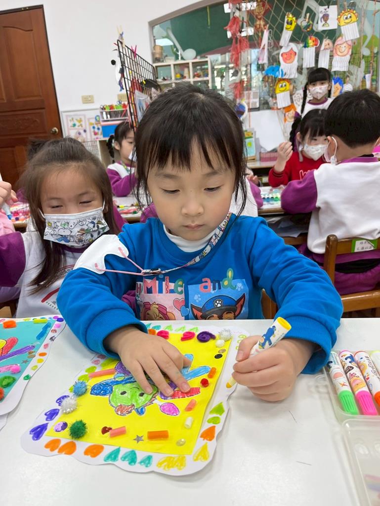 與孩子分享過年布置,並邀請孩子一起製作~馬來福的吊飾布置教室走廊