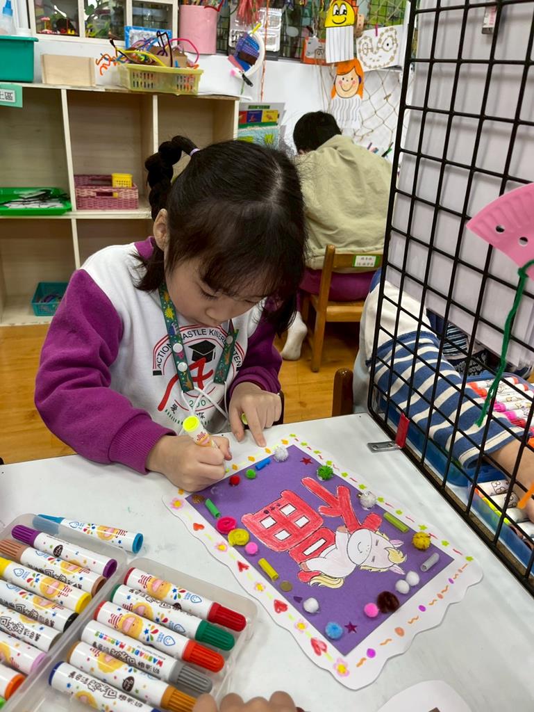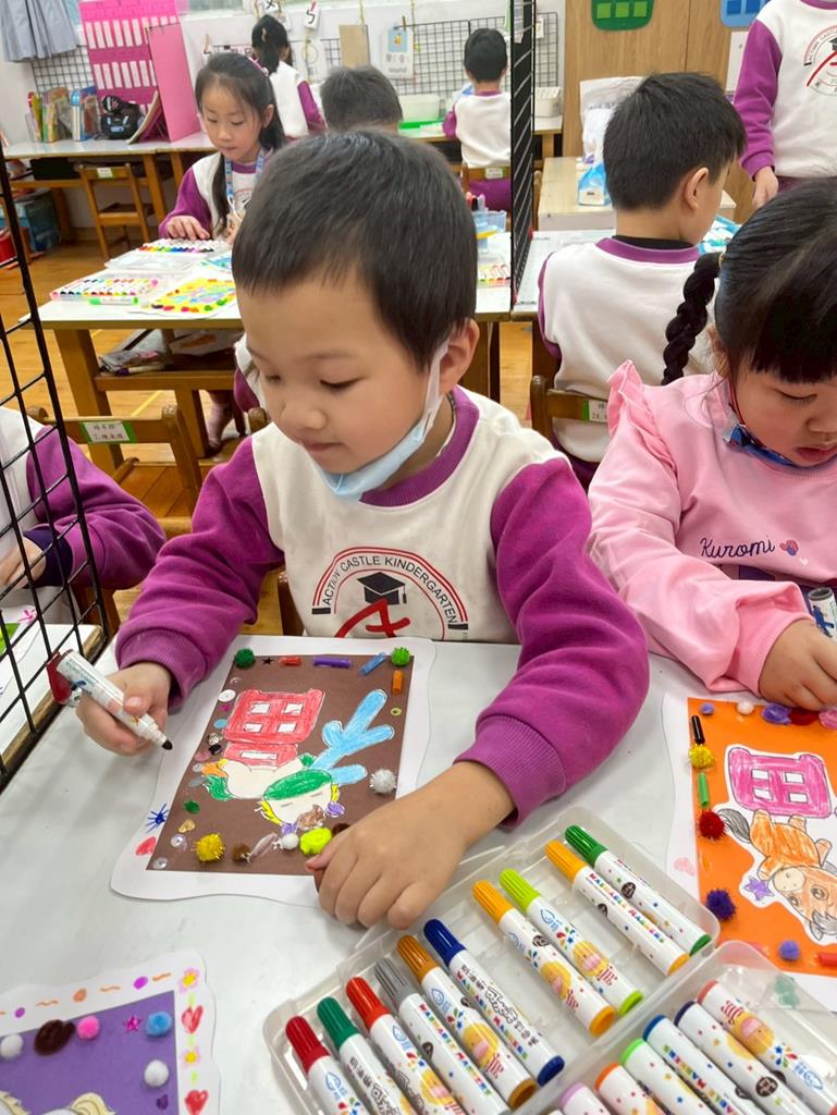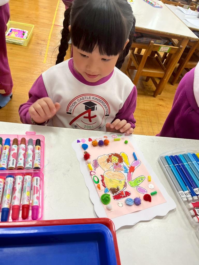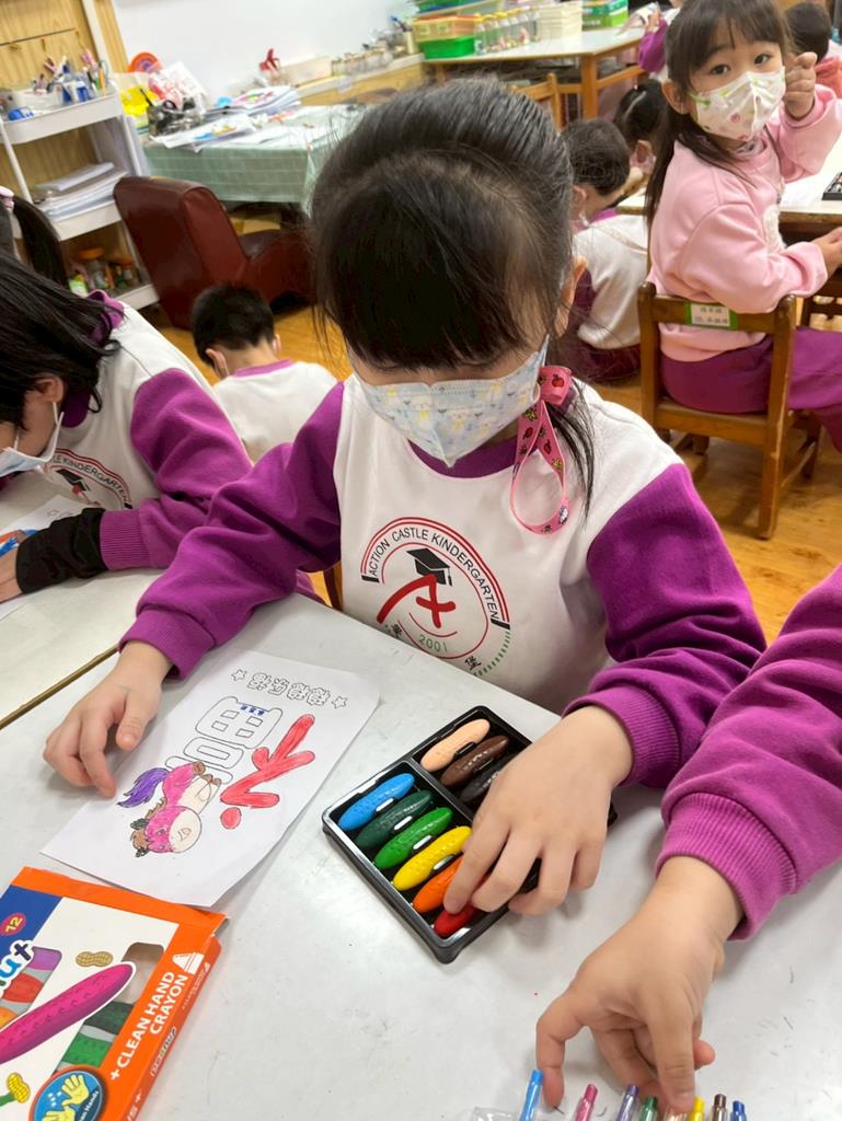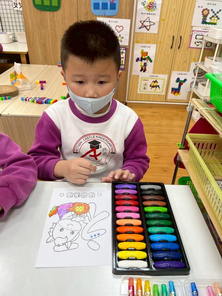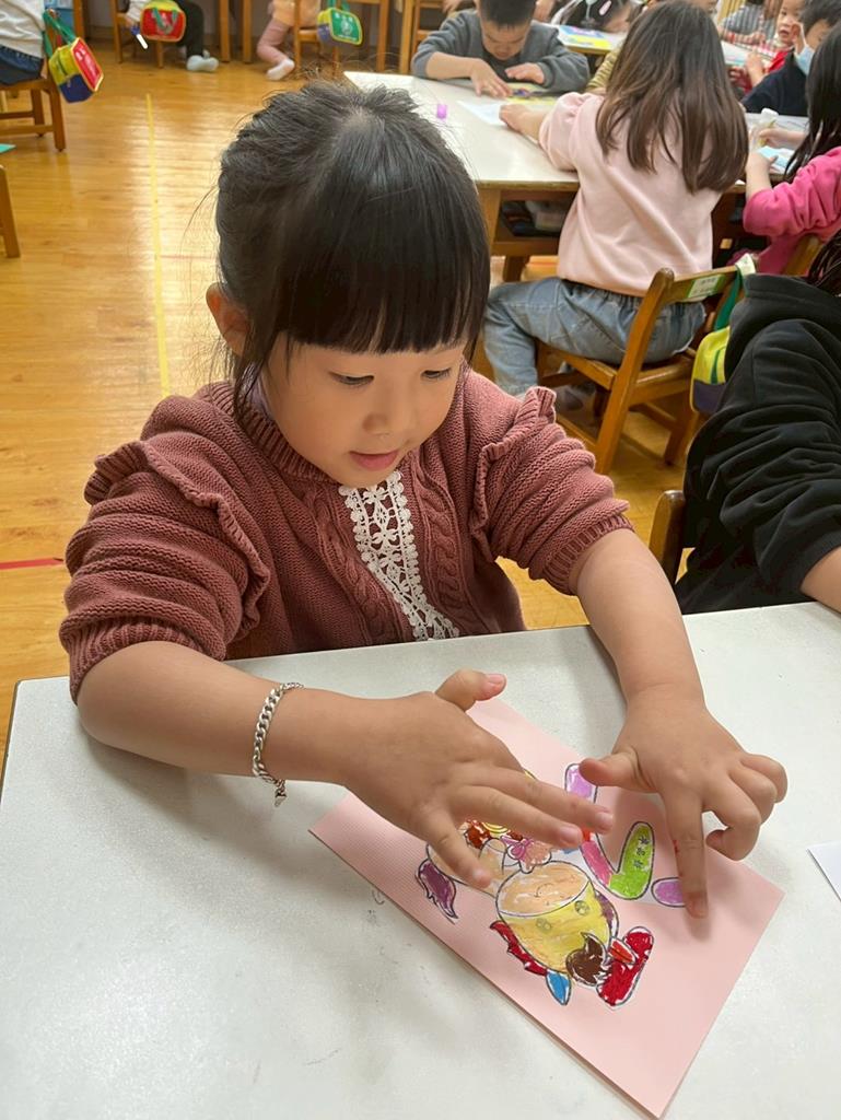 與孩子分享過年布置,並邀請孩子一起製作~馬來福的吊飾布置教室走廊