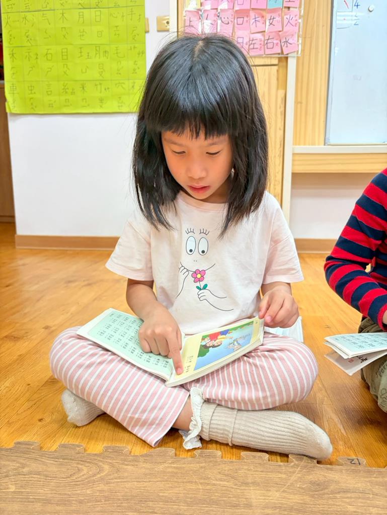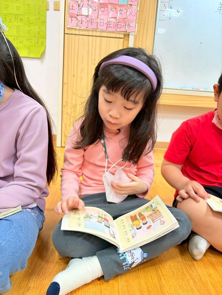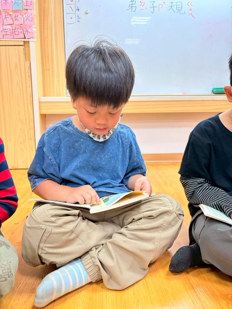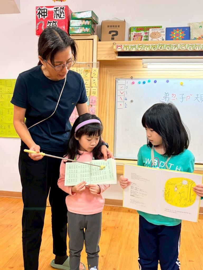 老師拿出弟子規書籍,帶領孩子手指著一字一音的唸出來