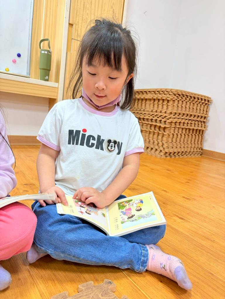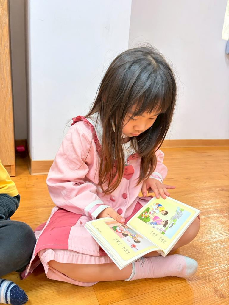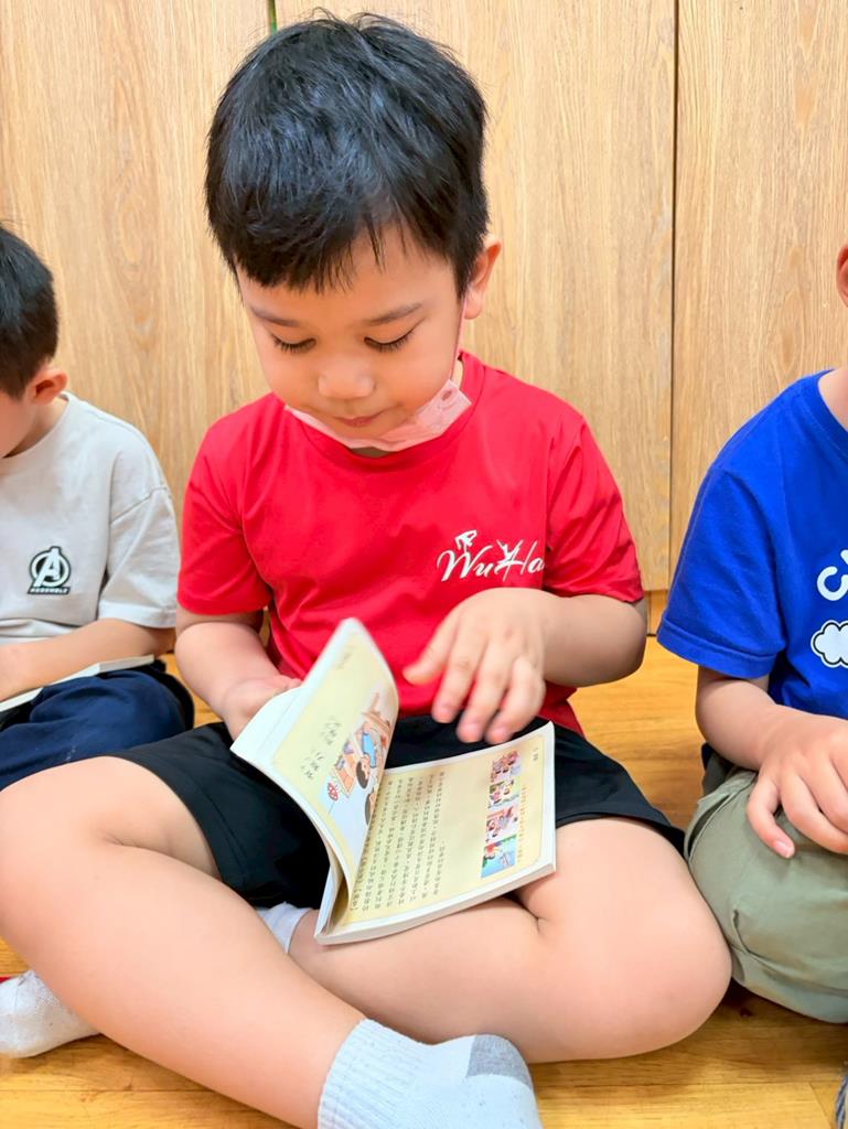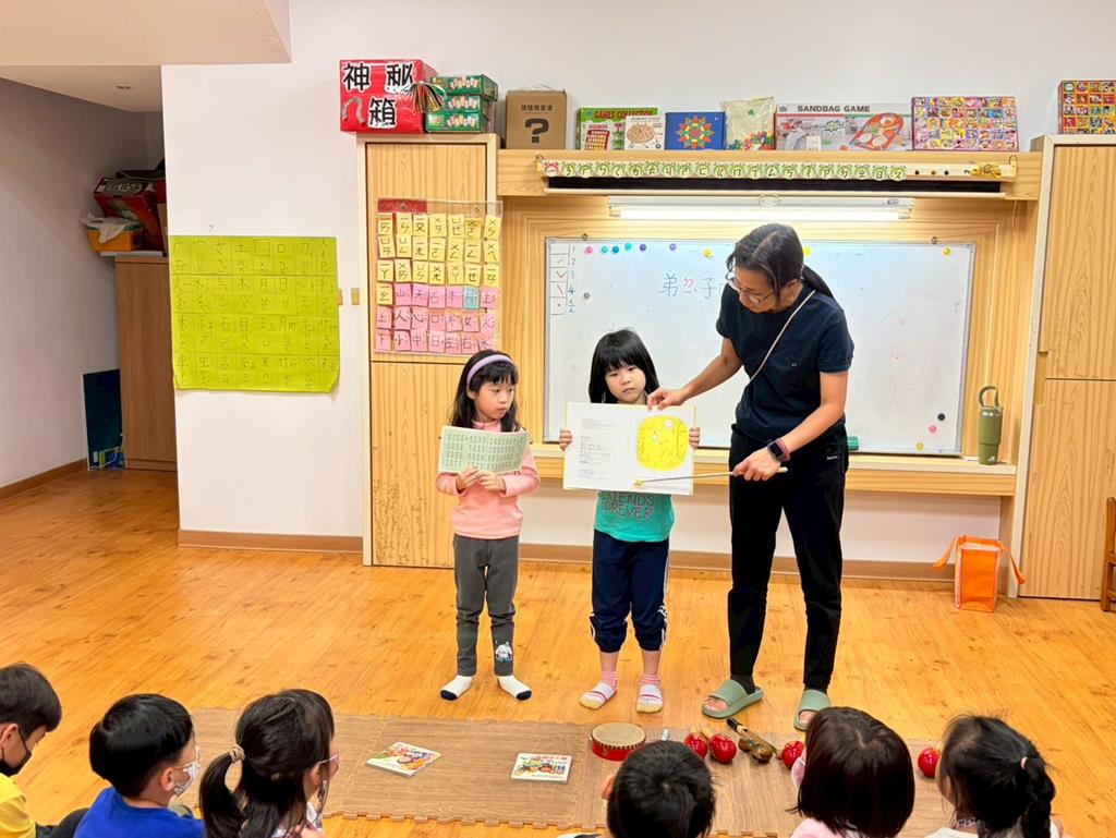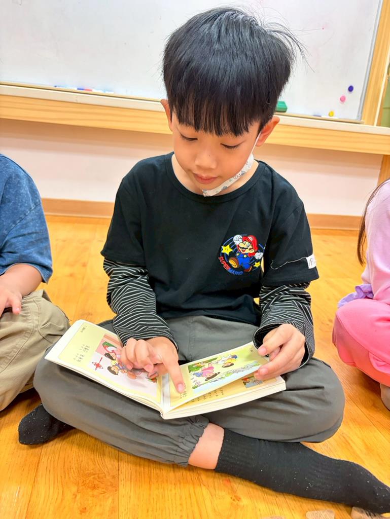 老師拿出弟子規書籍,帶領孩子手指著一字一音的唸出來