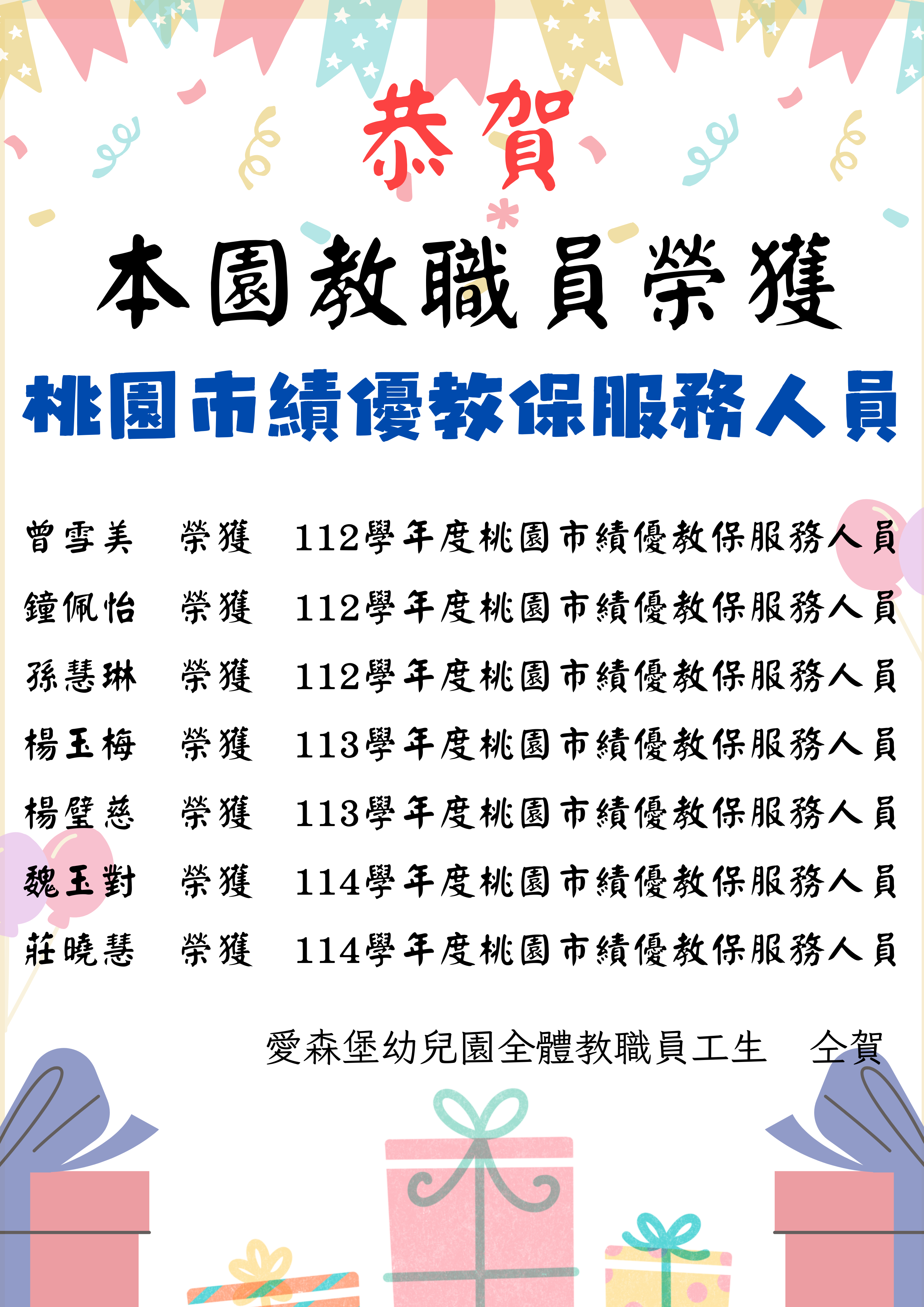 【恭賀】本園教職員榮獲桃園市績優教保服務人員