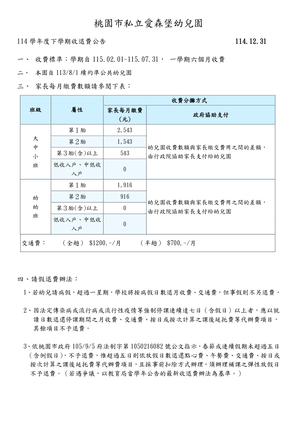 114學年度下學期收退費公告